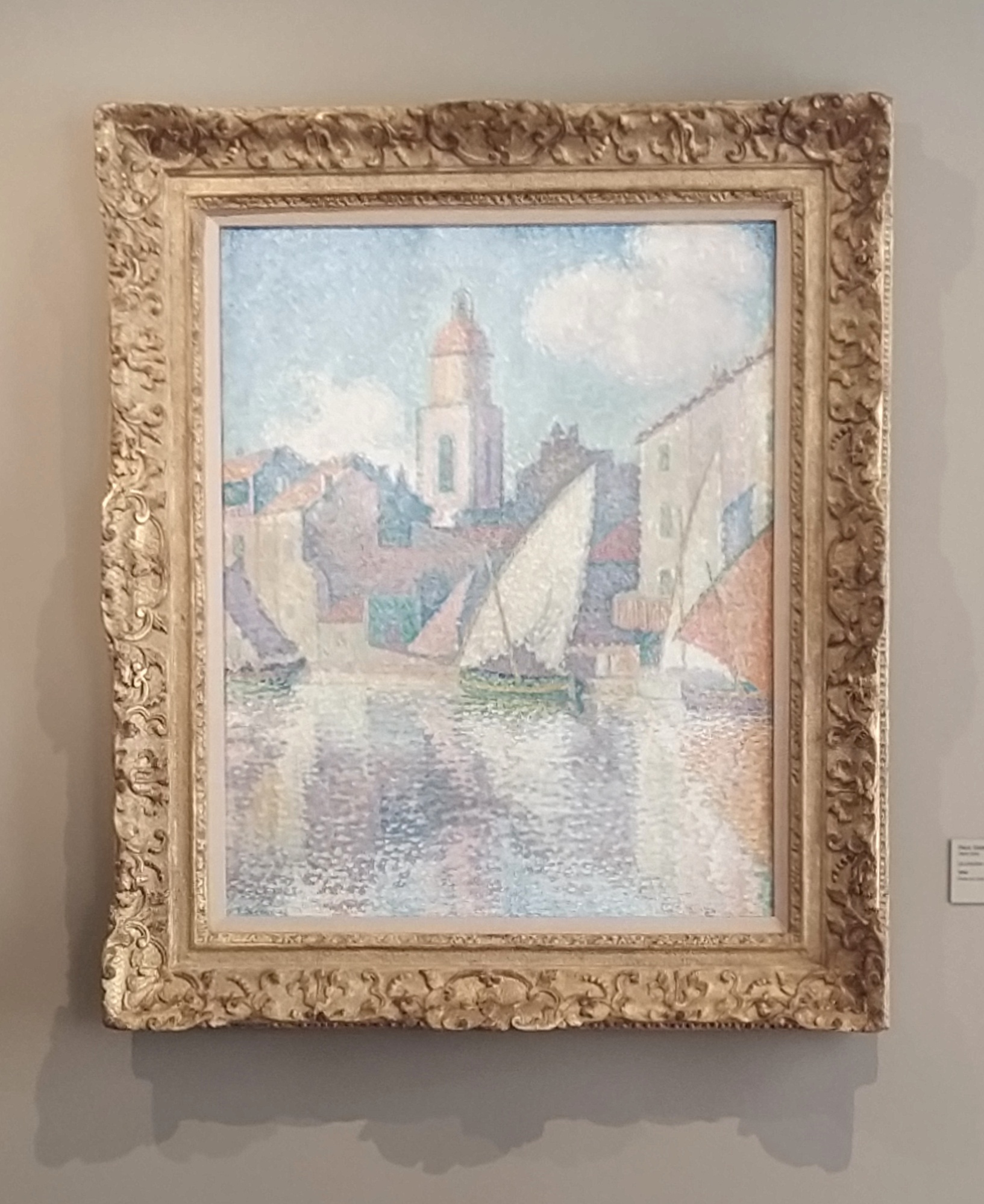 I caught sight of this one across the room (lots of space as I said) and I loved how the light shone out of it. It must be a favourite already as it is reproduced in the card collection and in several other items in the museum shop. The painter was unknown to me but I have since looked him up. Paul Signac,a Neo-Impressionist painter, he worked with Georges Seurat helping to develop pointillism which I did recognise in this painting called ‘Le clocher de Saint-Tropez’