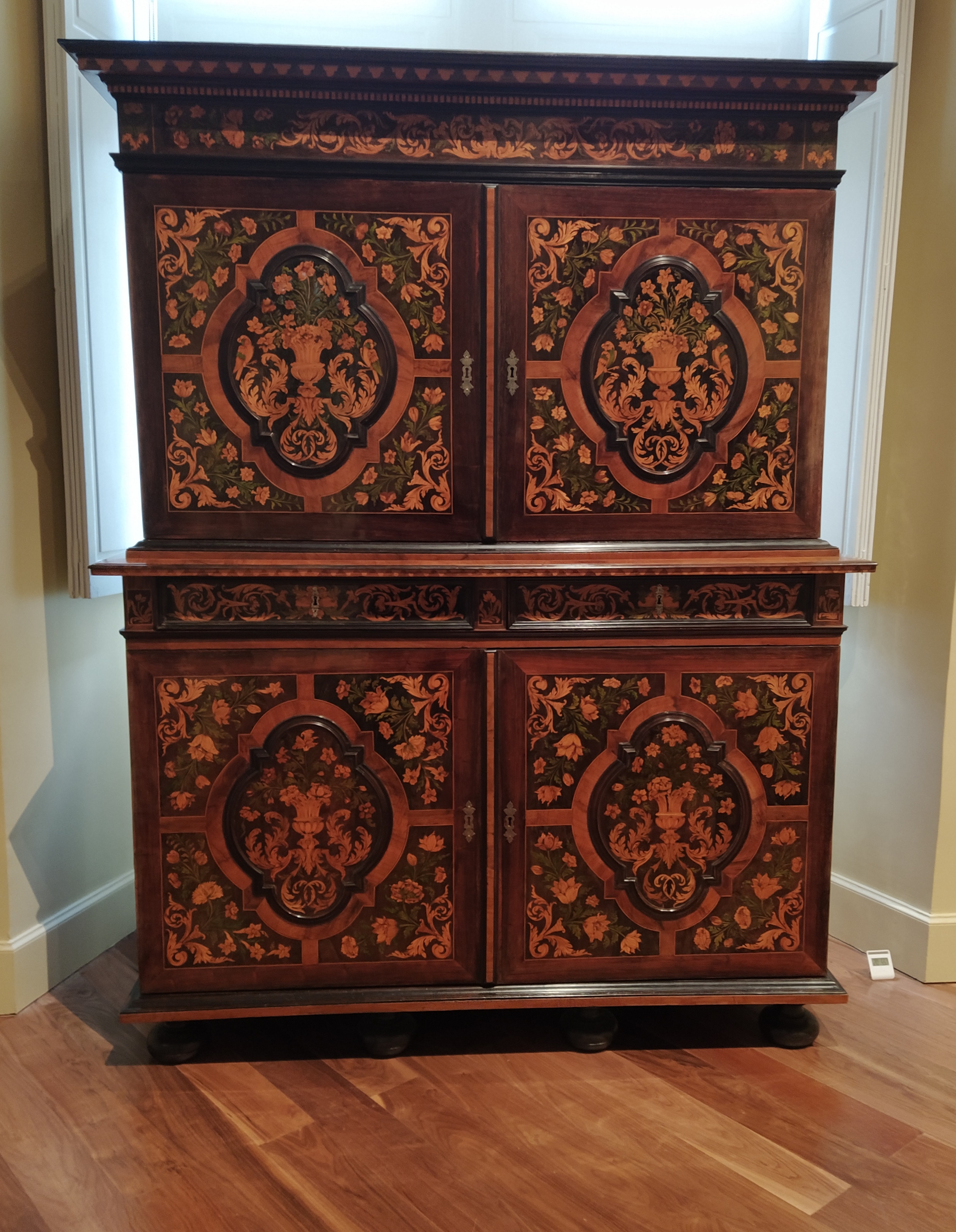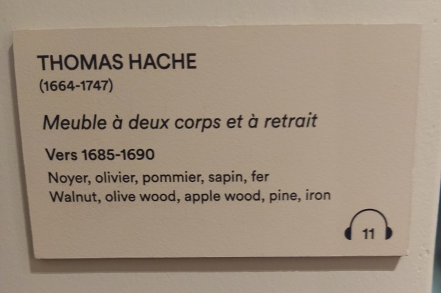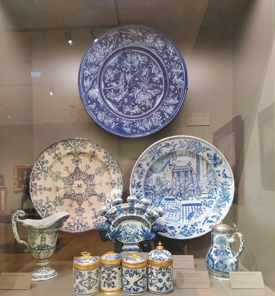 Collecting Mr McGregor from his bench we descended to the first floor which holds all the earlier paintings but this time hanging in rooms embellished with pieces of furniture loaded with object d’art etc. On the second floor there had been a few sculptures contemporary to the paintings. I was not so keen on the older paintings although some interior scenes were fun. I found a stunning marquetry cupboard and some enormous blue and white platters…sneaky photo time!