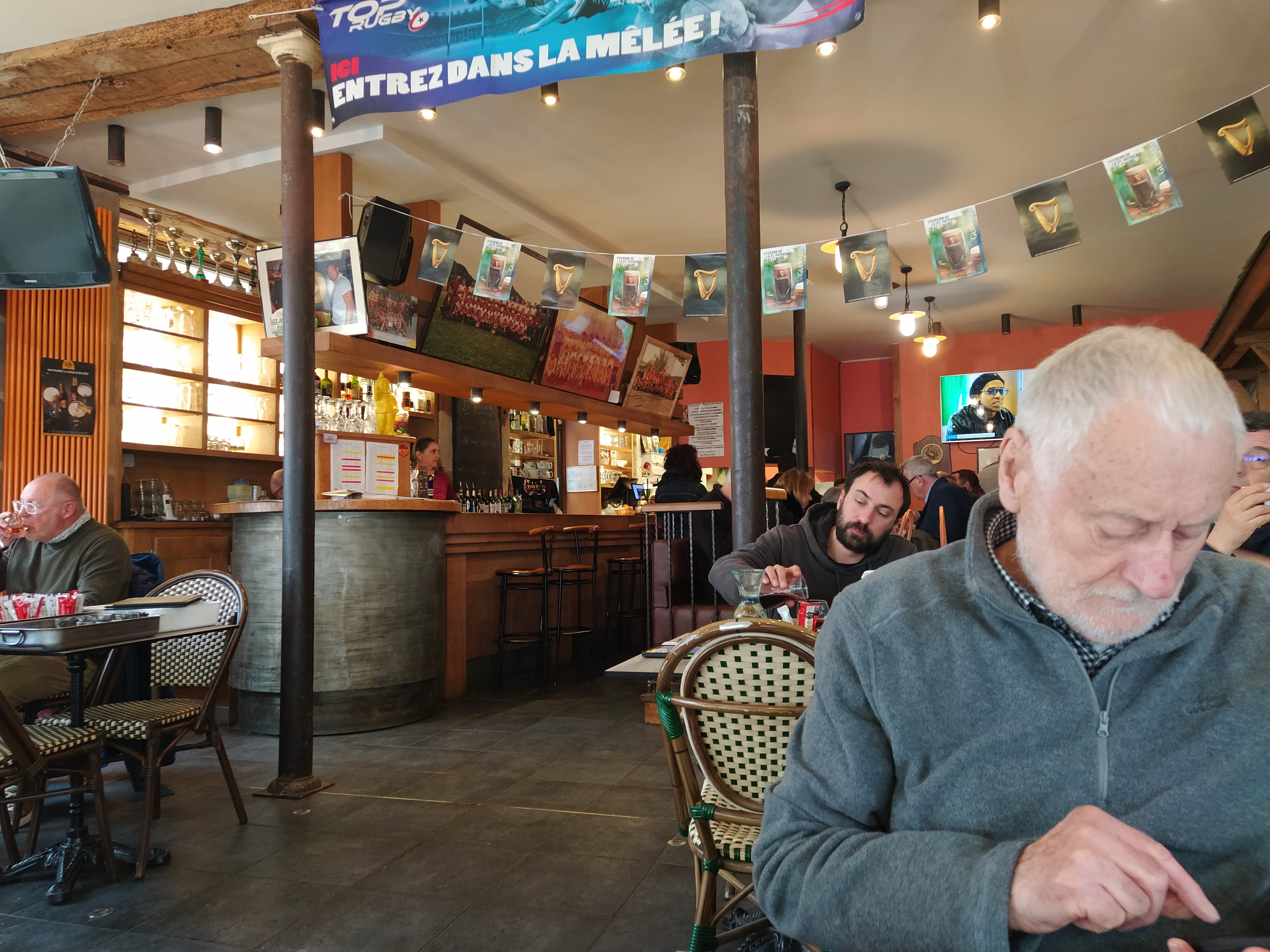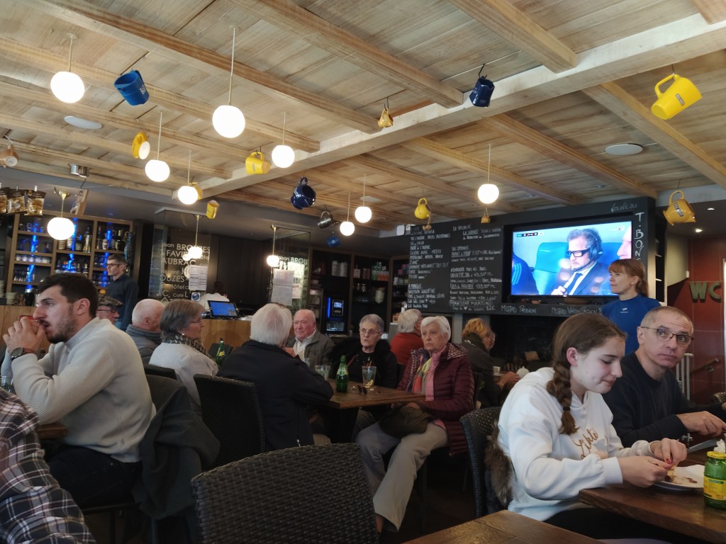 The lady on the auberge desk gave us a warm welcome and a choice of three rooms, something that hasn’t happened to us for ages. We chose the sunniest one overlooking the street. Then it was back downstairs to the bar for a welcome drink and the France v Italy Six Nations match on the TV.