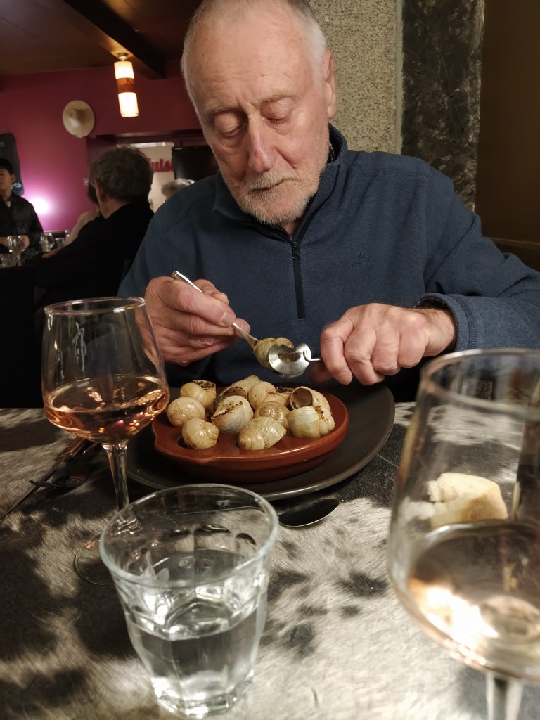 That evening we ate dinner in the auberge restaurant mainly served by the same cheerful woman who had checked us in. There seemed to be a large staff all working hard to create a good atmosphere which we really appreciated. I opted for aligot but with salad rather than the traditional sausage while himself had his favourite….’disgusting, Dada’ as our grandson would say!