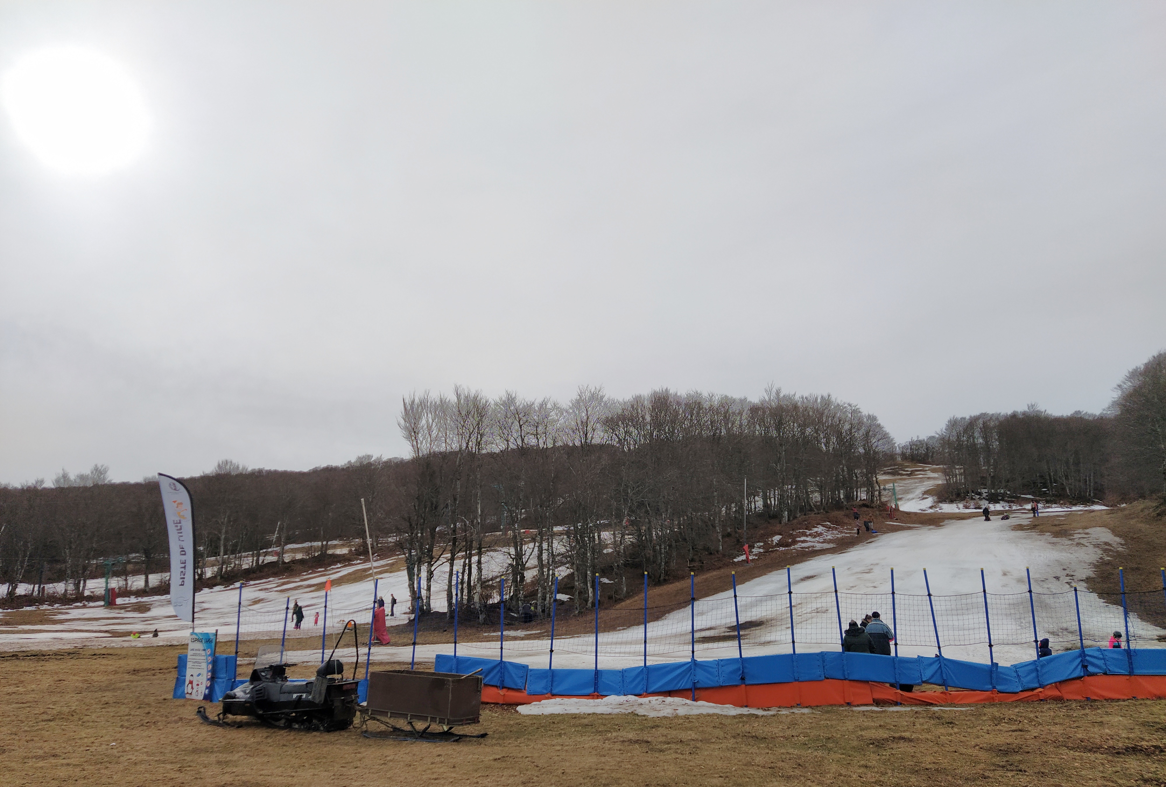 On the way there we saw a little bit of lying snow but not a lot. However, the ski station was filling up while we changed into our walking boots. A lot of families were enjoying the luge piste judging by the shrieks coming from that direction The children’s learner slope was busy too, the more proficient ones using the two downhill pistes that still had a snowy surface, albeit icy.