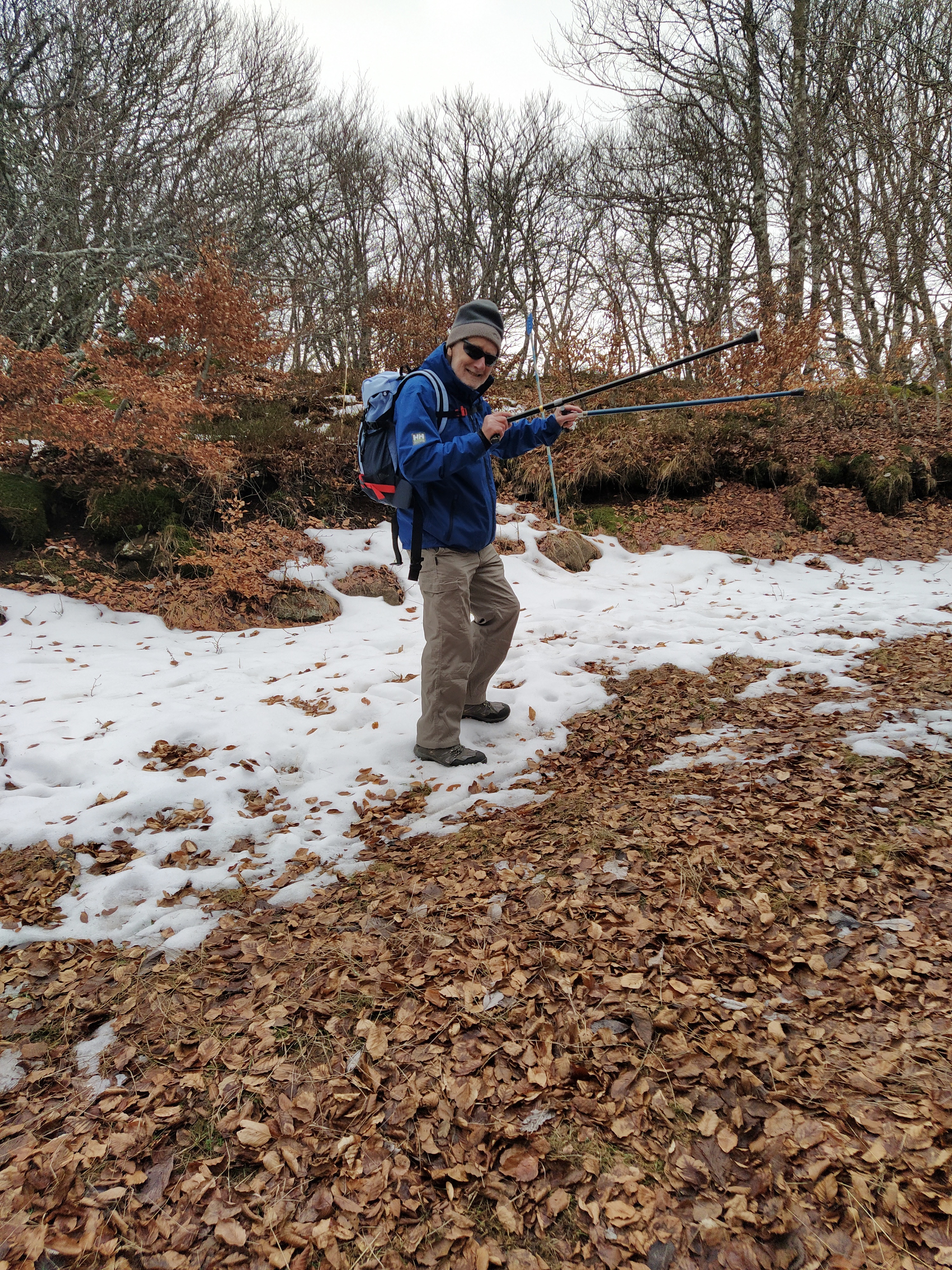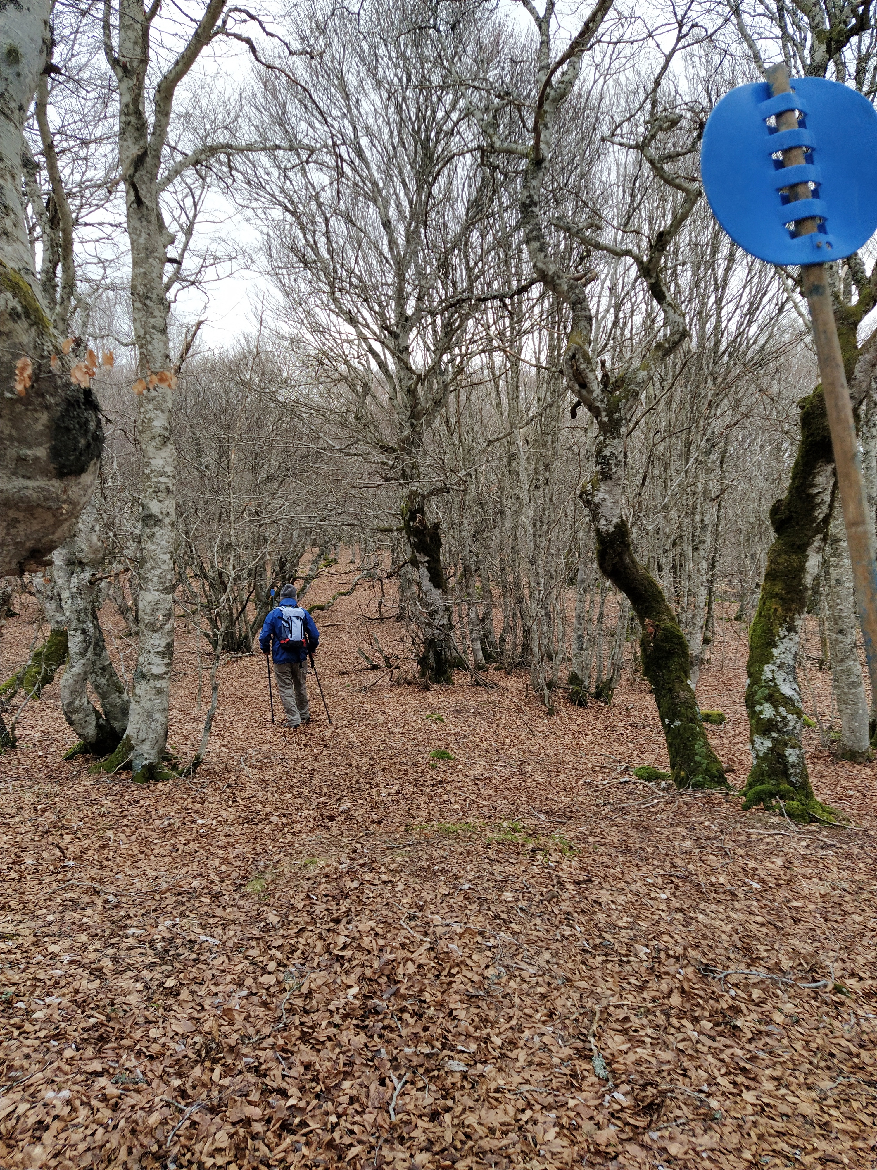 There are several marked paths for summer walking as well. We tried to scan the QR code for details with not much success. Our particular walk, ‘sentier pieton’ was indicated by blue balises with a sign to be careful of the ski de fond users. Not much chance of being mown down by one as the piste was green, or rather brown, the colour of the carpet of beech leaves.