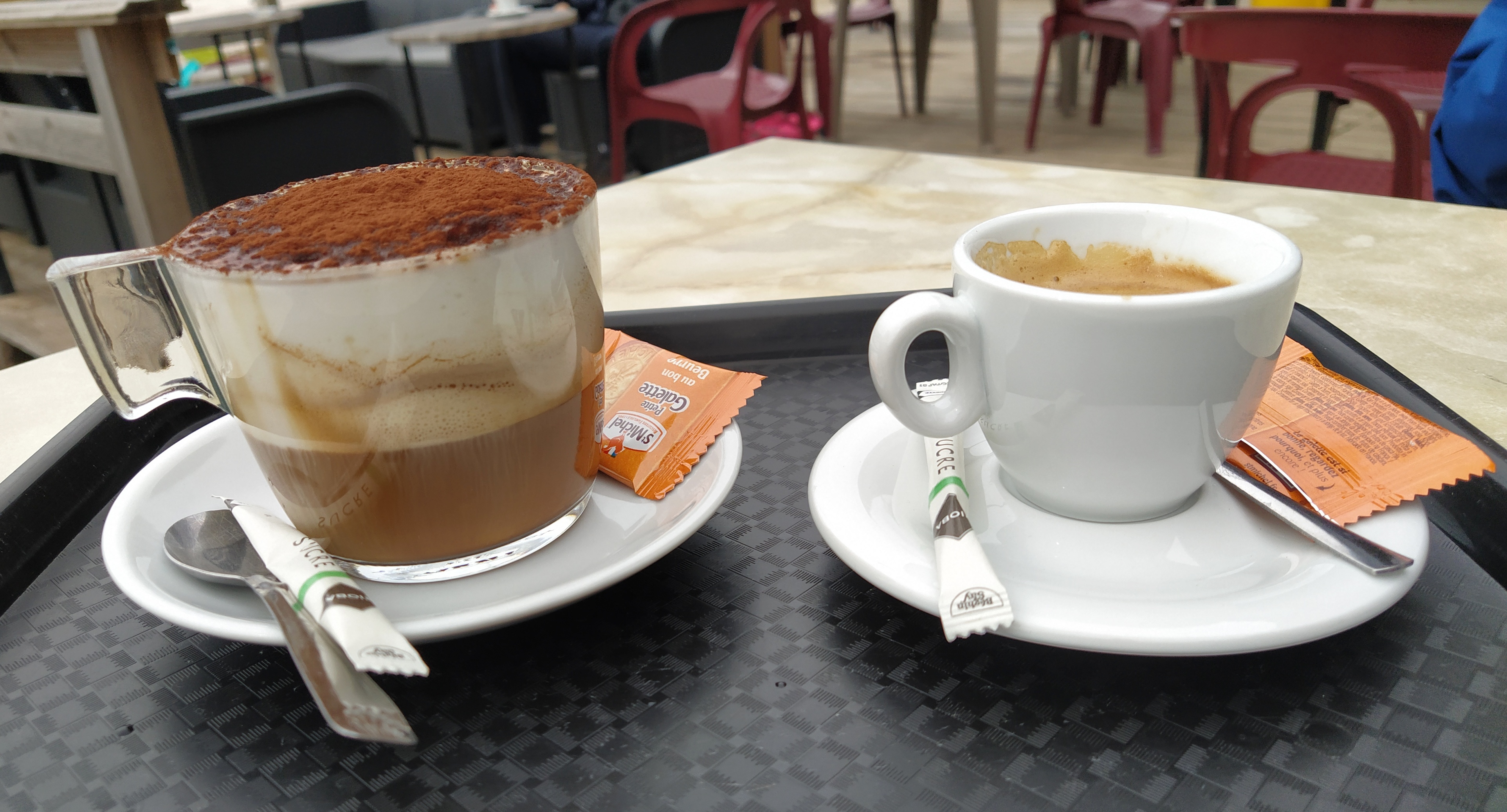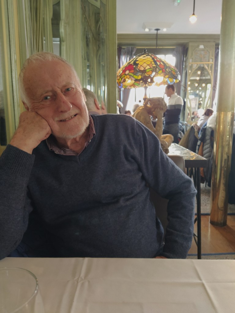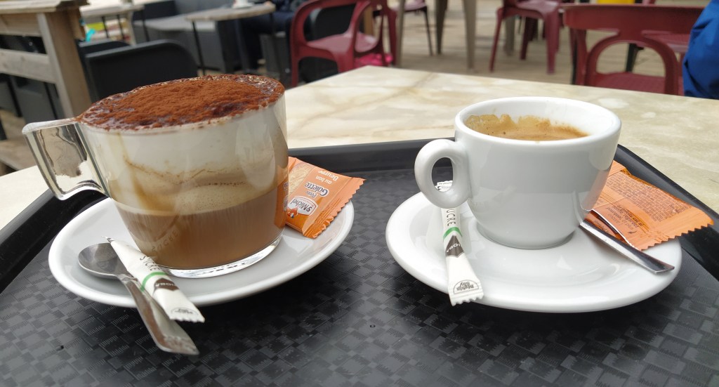 But for now it was time for coffee. We persuaded a cafe laid up for lunch inside that it was too windy to sit outside so we were allowed to squeeze into a corner for his expresso and my grand creme.