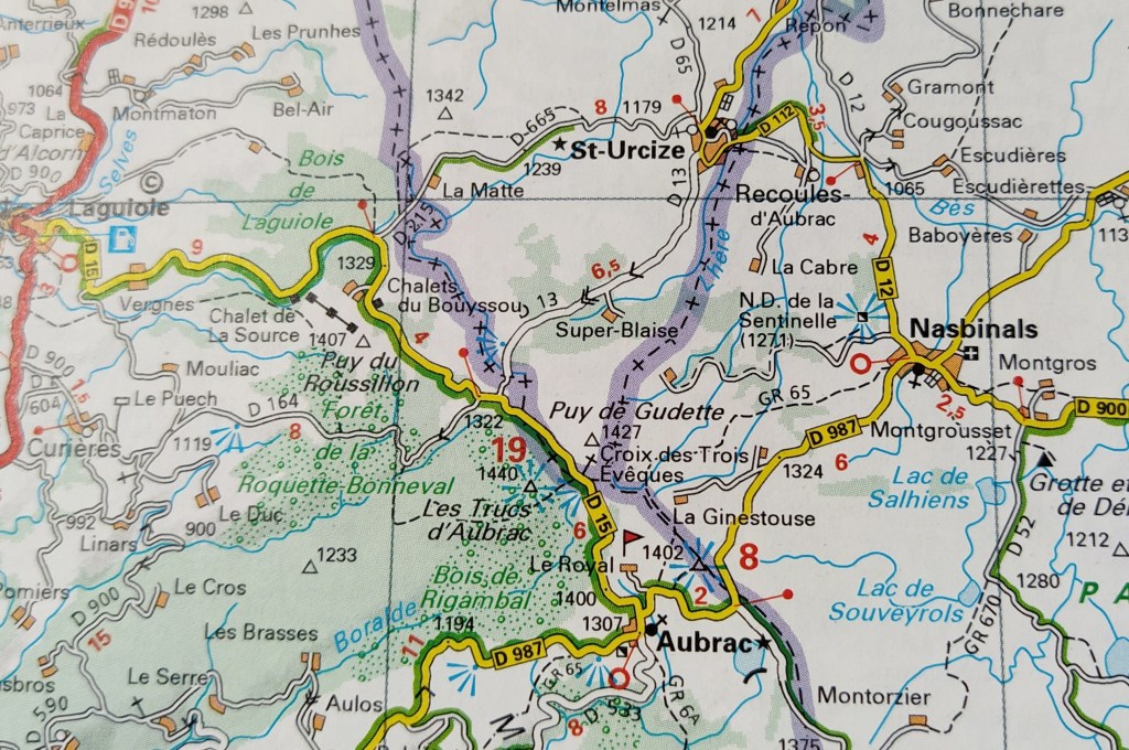 The purple lines on our map gave a clue as to why I had missed them while googling. The Aubrac plateau spreads over three departments, Aveyron in the west, Lozere to the east and a tongue of the Cantal pushing in from the north. I had only looked at ski stations in the Aveyron!