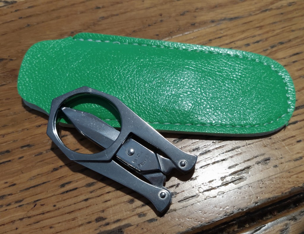 Before dinner we went in search of a ‘butlers friend’/ sommelier knife for Lou as I realised I hadn’t bought him a birthday present! Laguiole has some very upmarket boutiques and not just its cutlery shops. I had bought socks in the morning which were pretty but the price I usually pay for three pairs! In one window I spotted some folding scissors. I had had a pair in my handbag for years but on entering the Uffizi in Florence some years ago I was told to throw them in the bin by security. They only came out of a Christmas cracker but were endlessly useful and this opportunity to replace them was not to be missed. An early birthday present for me.