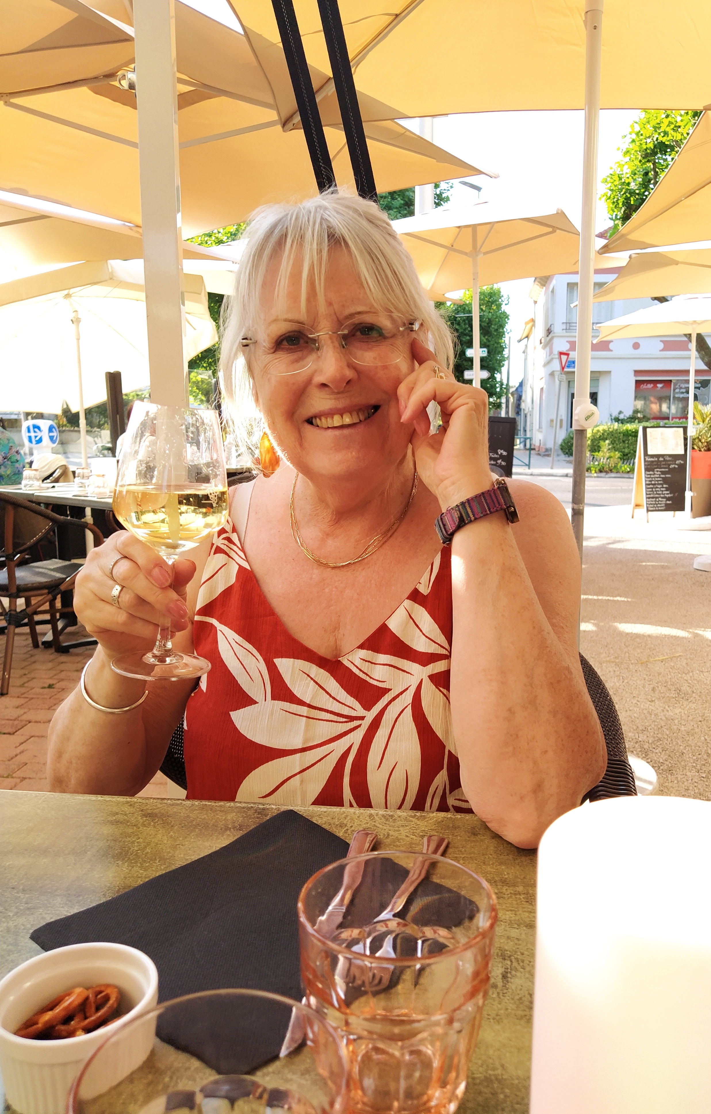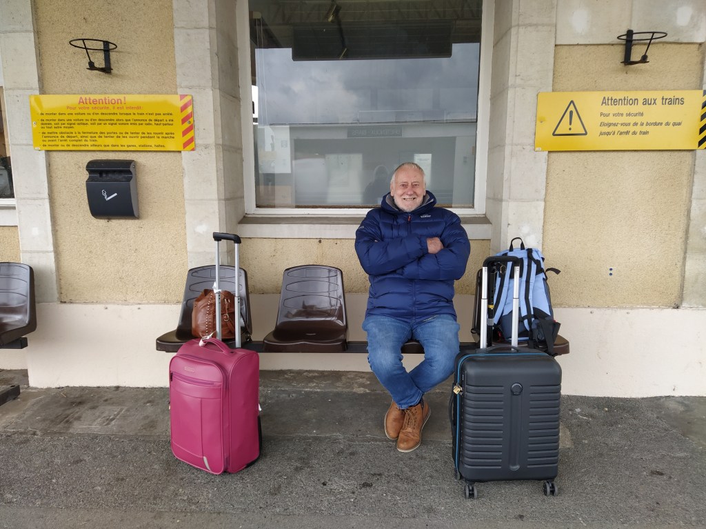 Luggage collected we debated what to do about lunch. Finally we bought some filled baguettes to ‘eat on the train’ and then stopped at one of the several cafes we had eaten at over the last three evenings for a last cold beer and glass of white.
