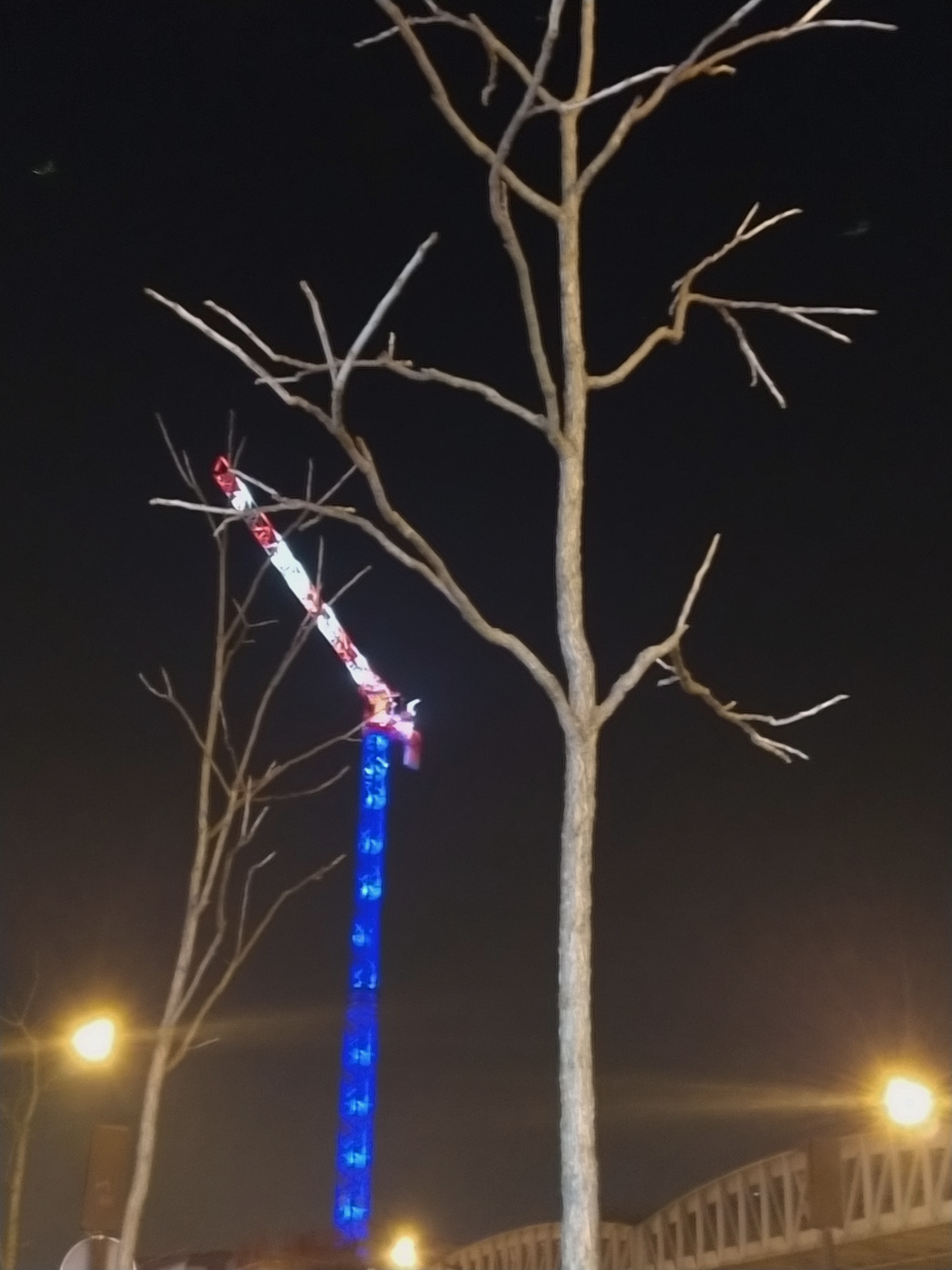 Across from the hotel the building work goes on with its many cranes, this one looking particularly patriotic with its red, white and blue floodlights…