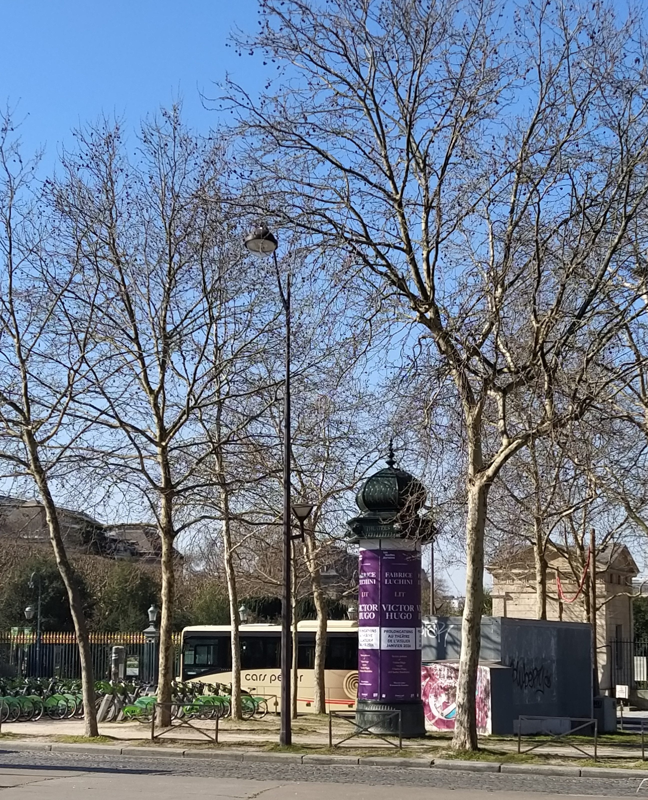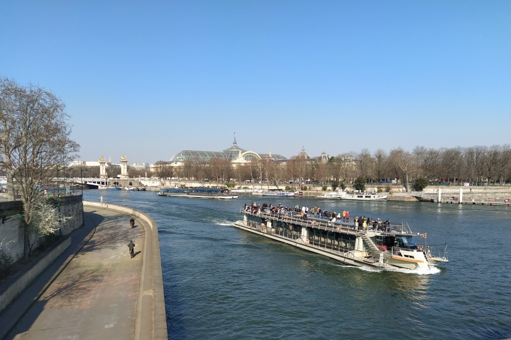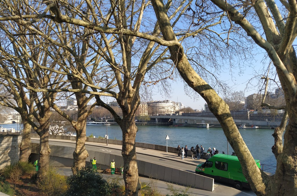 The sky might be blue and the blossom dancing but it was pretty nippy around the nethers this morning as we set off to find the number 63 bus stop by the Seine.