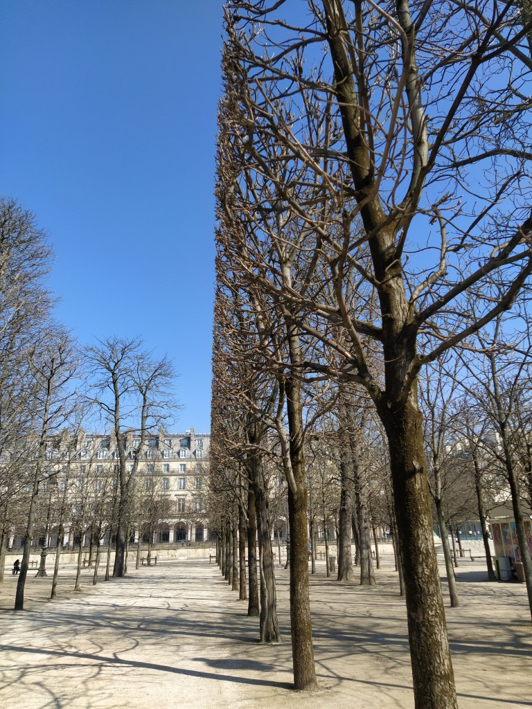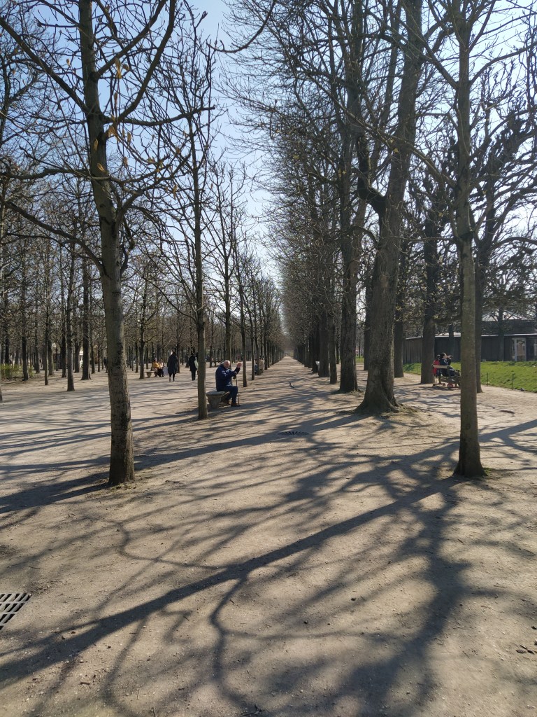 After a sit down and some coffee it was back outside onto the huge terrace overlooking Place de la Concorde where it was feeling much warmer. A bit early for our lunch reservation we wandered down into the Tuileries garden and sat in the sun for a while.