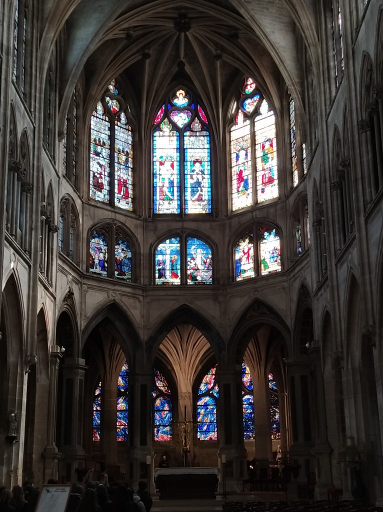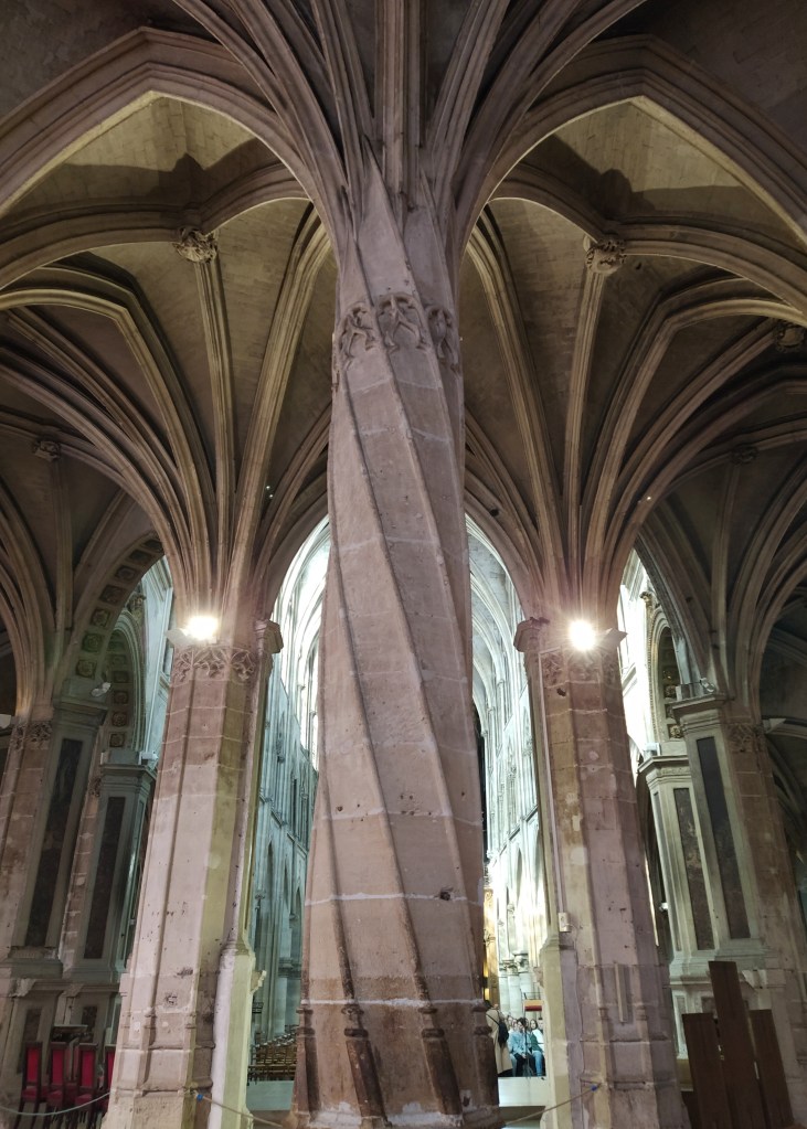 St. Severin was just around the corner and practically empty. So I had plenty of time and freedom to wander around taking photos of the ‘vitraux’ and the spectacular twisted stone column alongside its neighbours that represent palm trees and lead up to beautiful fan vaulting.