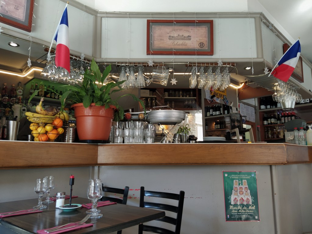 The food was wonderful and so rich neither of us had room for dessert. An elderly lady at a table near ours had no compunction about taking photos of everything and anything and told us she lived in Reims where she had worked for many years but used to come to Paris on business. She and her friend sat for ages after they had had their coffee and paid the bill, just enjoying the ambience I imagine. We were not so confident and, anyway, had timed tickets for Notre Dame to think about. We wished each other bon continuation and left.