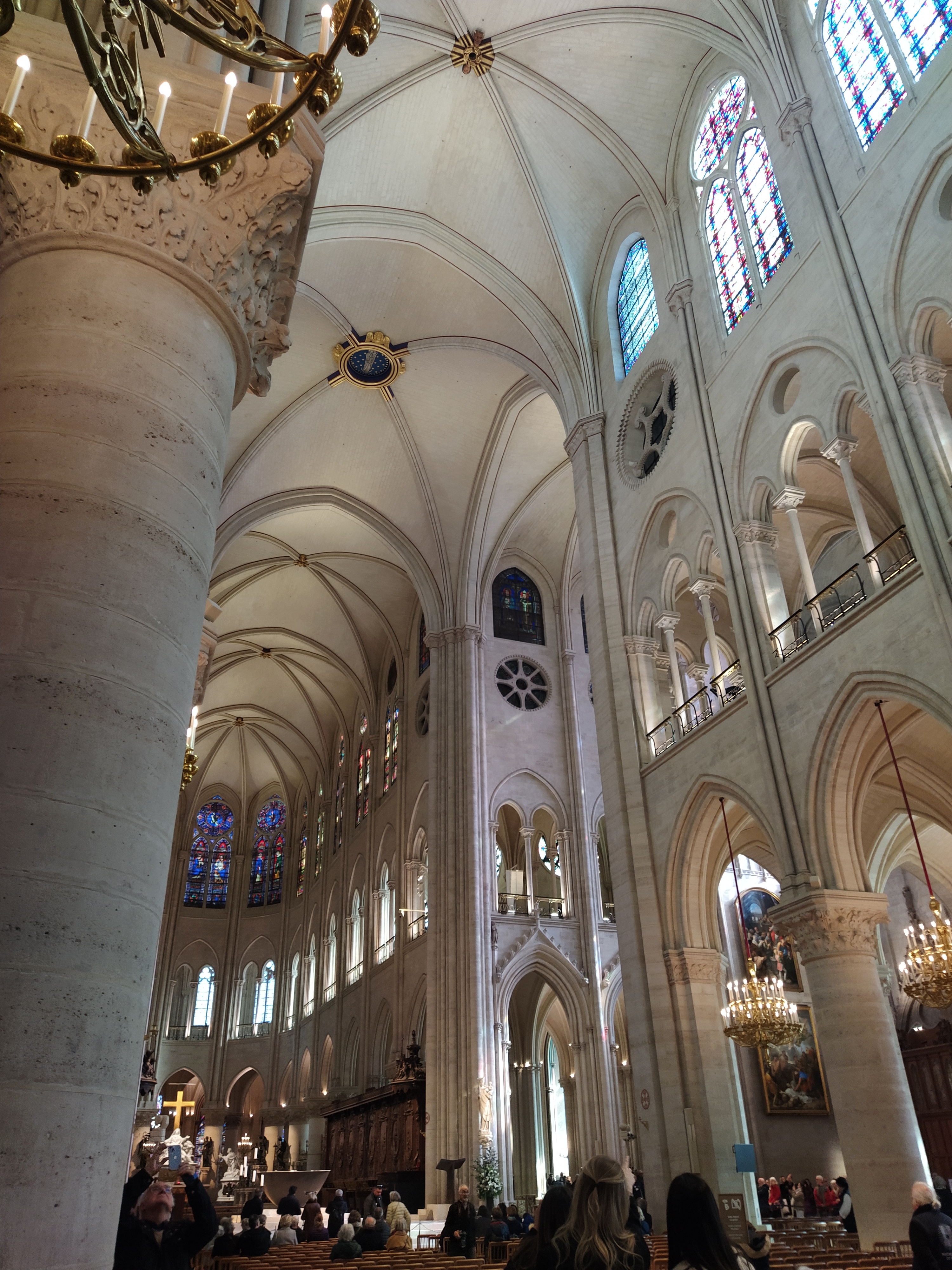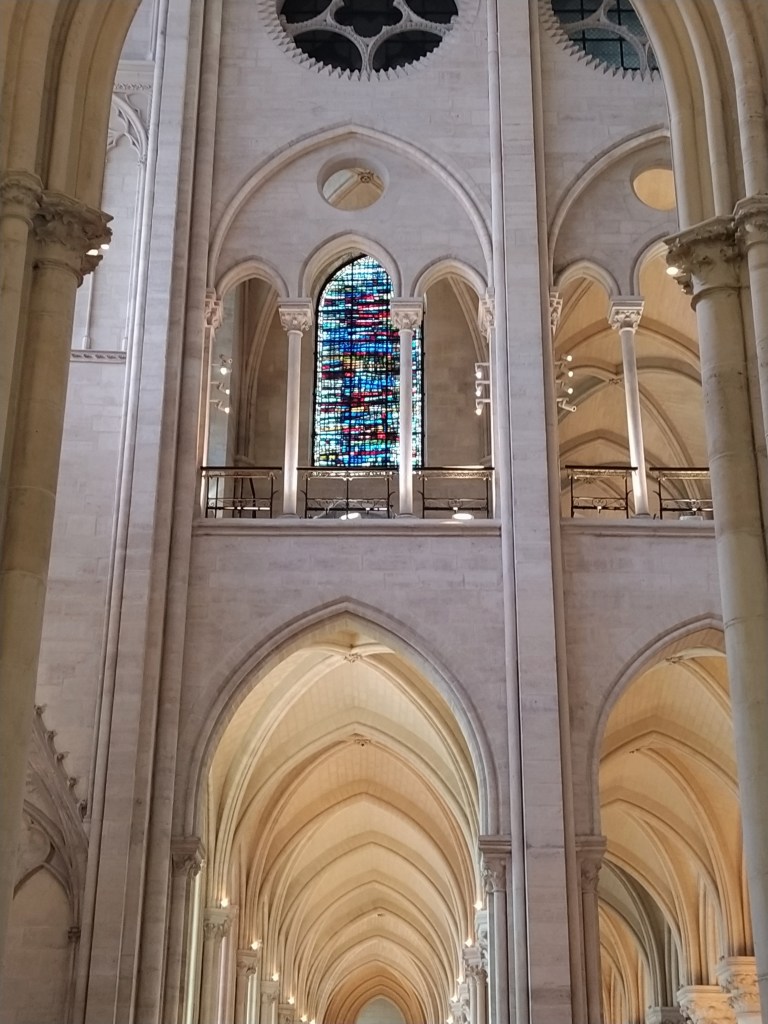 Retracing yesterday’s steps (we realised we were on the same road the bus driver had dumped us on) we were in plenty of time to join the fast moving queue at Notre Dame. It was crowded and, despite a service going on in the centre of the church, people still talked as we shuffled round the ‘sens de visite’. The shock of the new light inside was not as great as I’d expected but then the reopening had been very thoroughly filmed and reported on television with very few people cluttering up the space. But it was still incredibly impressive and at one point, as we discussed a stained glass window, wondering if it was original or a substitute for one that had been lost, I found myself beginning to feel emotional. The scale of the restoration is almost unimaginable as you stand in what had been a smoking shell.