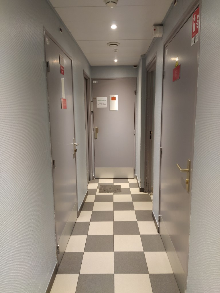 Unlike last time our ‘comfort’ room is bijou, to put it politely. But then, the hotel makes no secret of the small size of its ‘chambres’, calling the most petit ones ‘cosy’. We were spoiled last time by being put in a family room so had loads of space, free slippers, use of snowy dressing gowns etc etc. This evening I looked at the floor plans in the lobby and realised our present room is average. The night porter and I had a giggle together about the shock of discovering our fourth floor room! But at least we are next to the fire escape, something I take very seriously. Years ago when working in the West End, I went to a restaurant near Covent garden and an American actor in our group looked for the fire exit before he sat down. He was very concerned that cramped restaurants in old buildings was a recipe for disaster in the case of a kitchen fire. His concern has stayed with me, except I include hotels too!