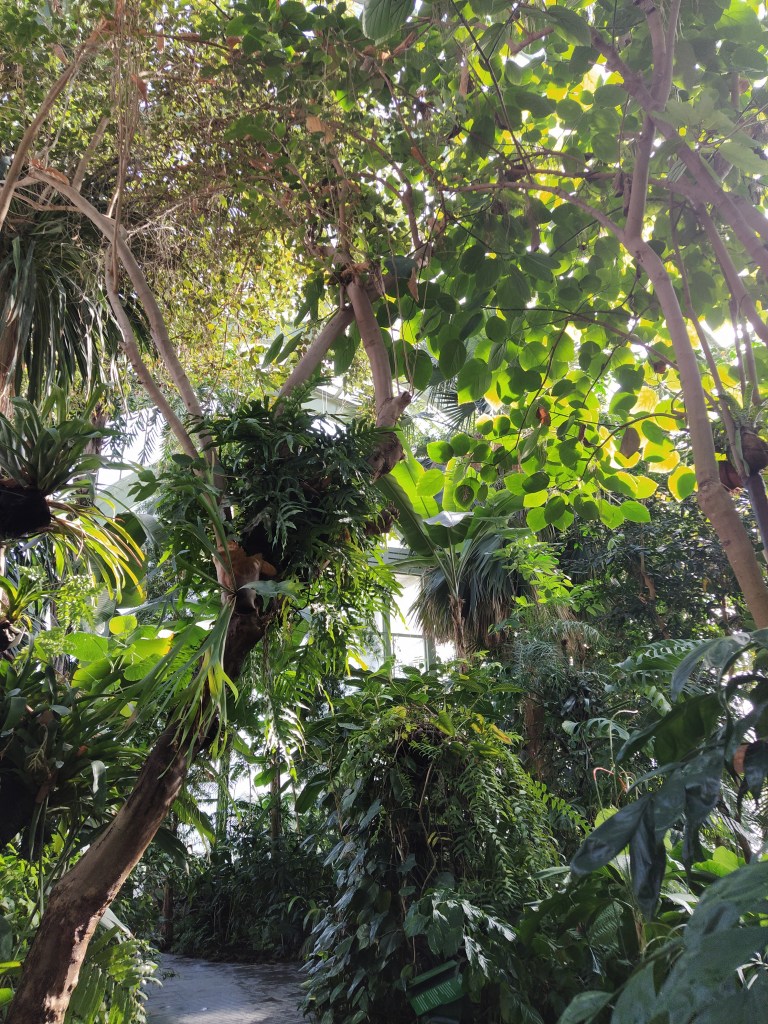 The Grand Serres are imposing and a sort of austere art deco design with wide stone steps without a handrail. We notice things like that these days! Inside it was hot and damp as might be expected of a tropical hothouse and we followed a wooden boardwalk twisting between the greenery, some of which was tall enough to reach the roof.