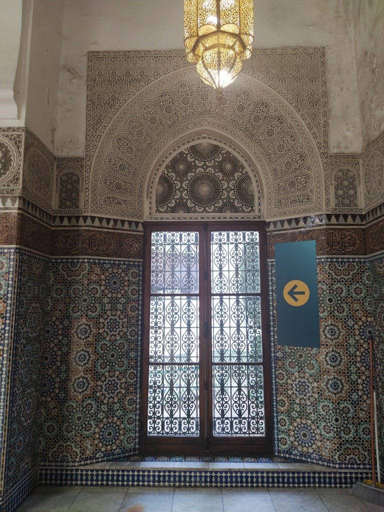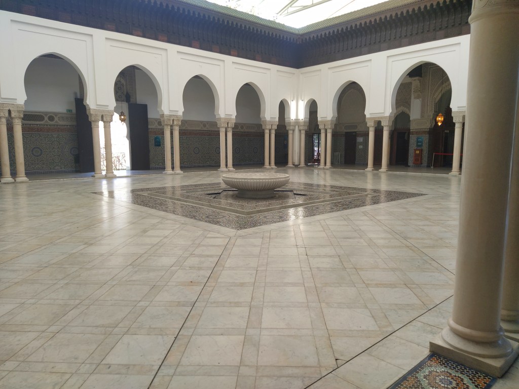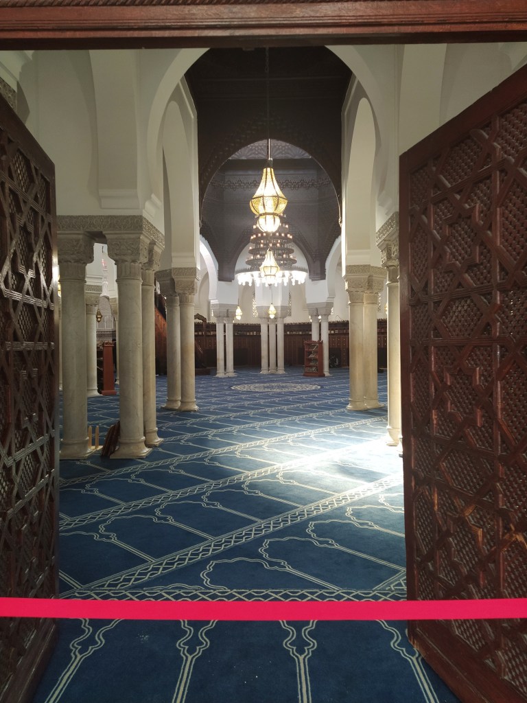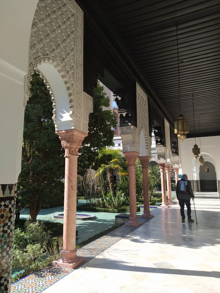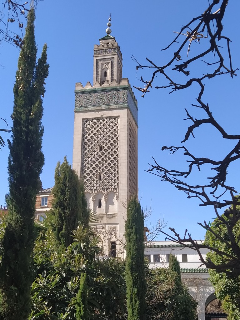 The reason for leaving the Jardin by this gate was because it was the nearest to the Grand Mosque of Paris. I had noticed it on Google maps and upon investigating, as I do, it seemed an interesting place to visit. It wasn’t far to walk, thank goodness. The activity of the last few days was catching up with us both.
