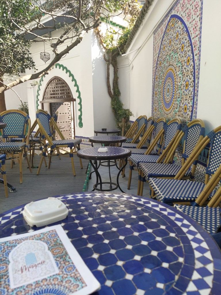 The lady in the ticket office had told me the mosque cafe was outside and to the left. Ready for some coffee we walked to the left, and then left again and finally found the cafe tucked into a corner…on the left. It would have been appropriate to have mint tea but we stuck to coffees although my mouth watered at the pictures of the many pastries; baklava cigars, mmmm.