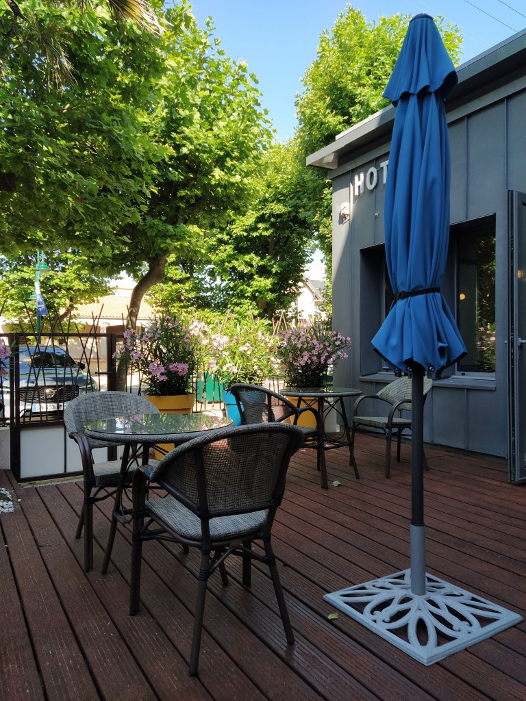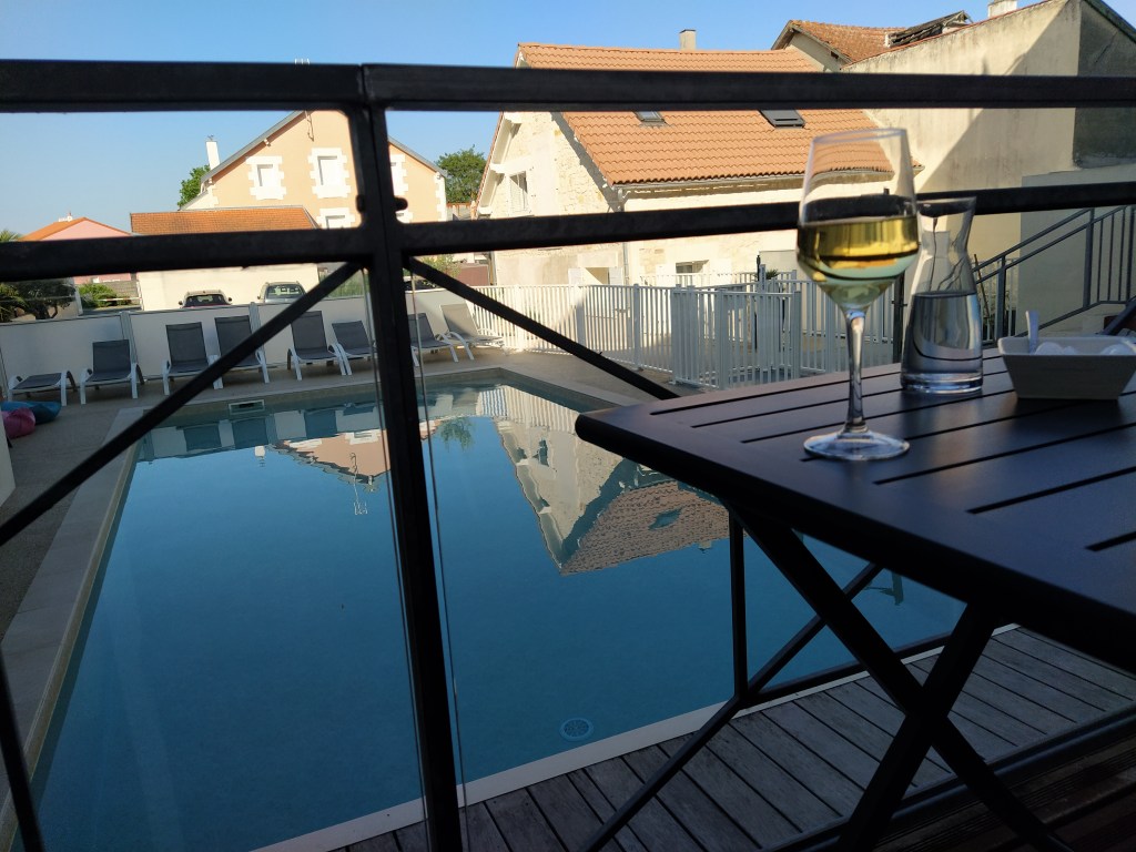 and arrival at our lovely hotel in Chatelaillon Plage at five o’clock. We were greeted warmly and told they remembered us …ominous? But our room is great, on the ground floor overlooking the terrace and pool.