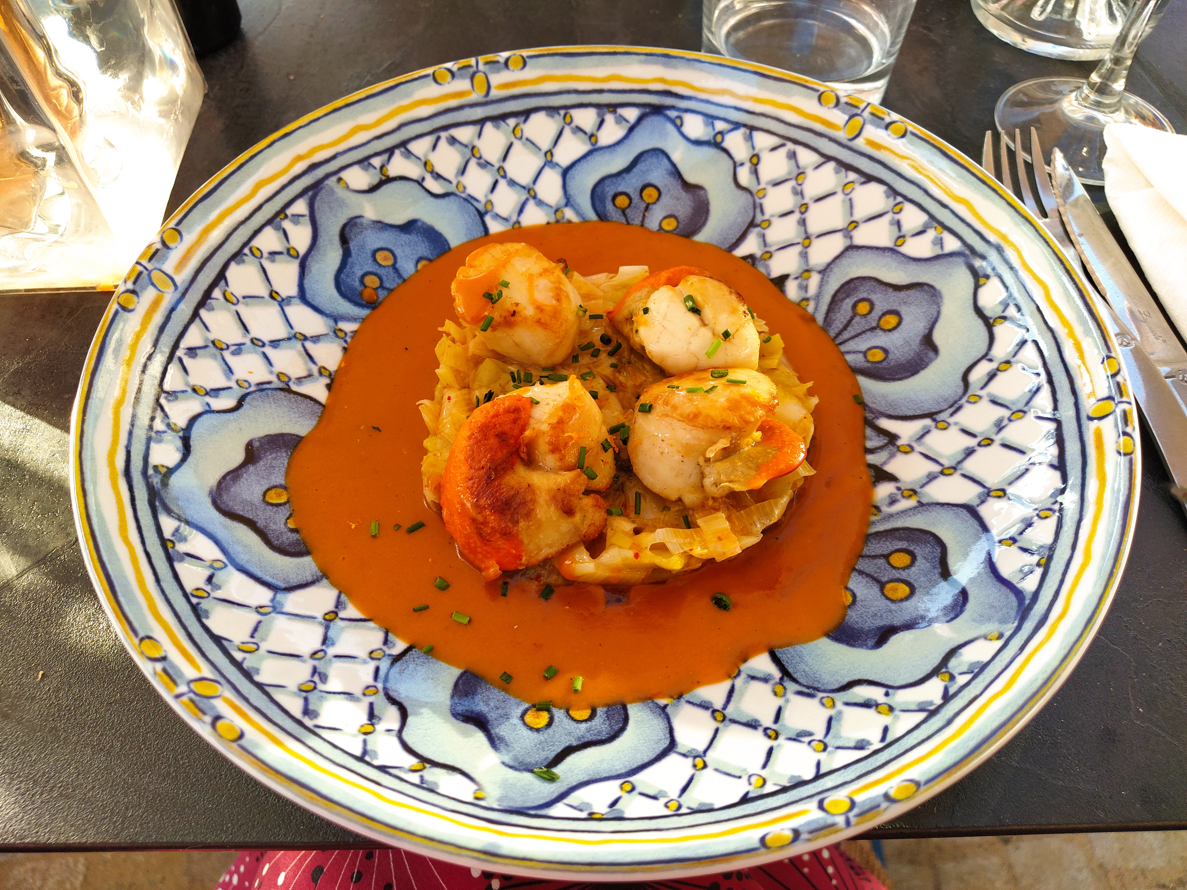 Then Noix St Jacques on a bed of spicy leeks with a langoustine bisque, yummy!