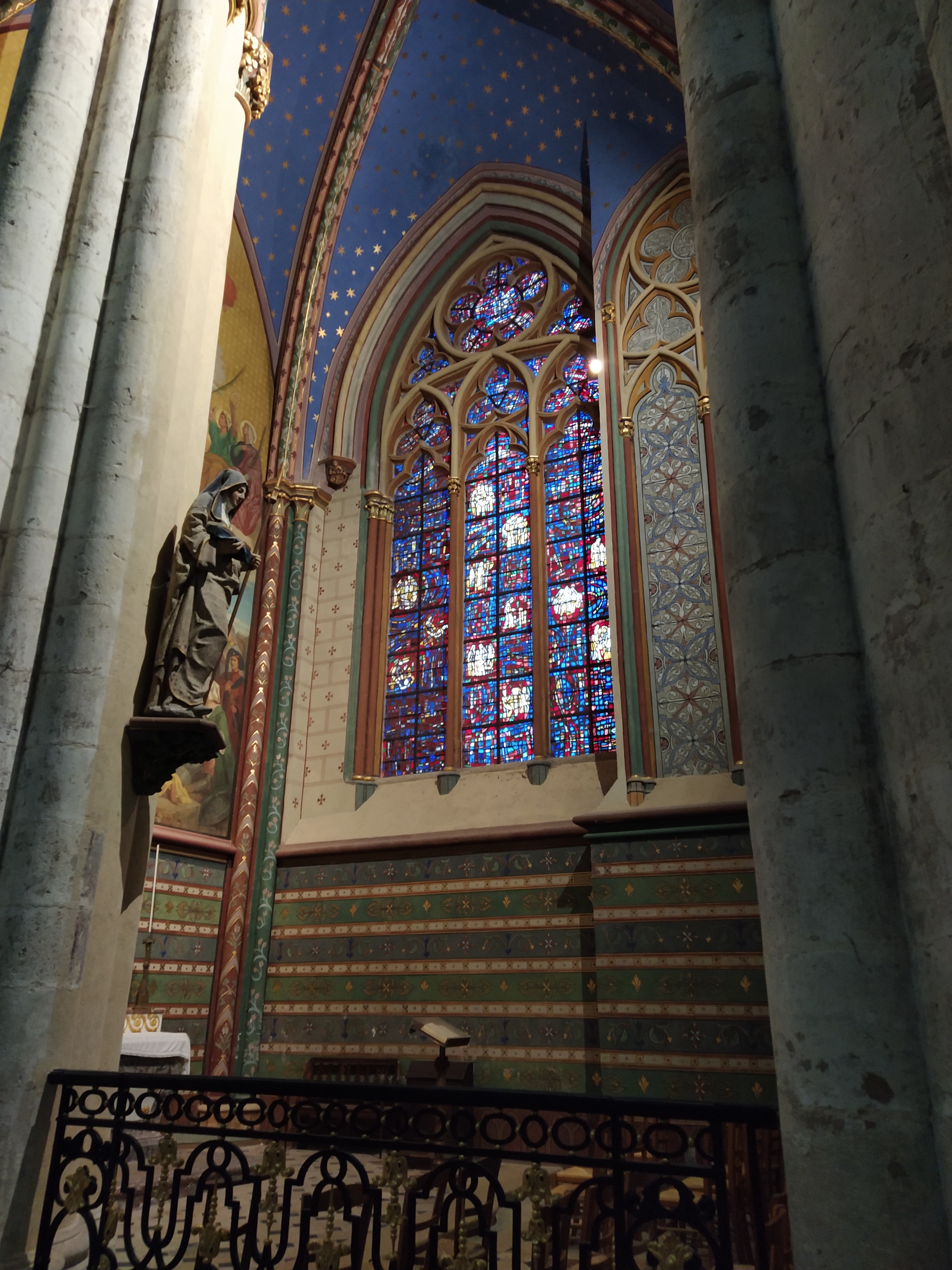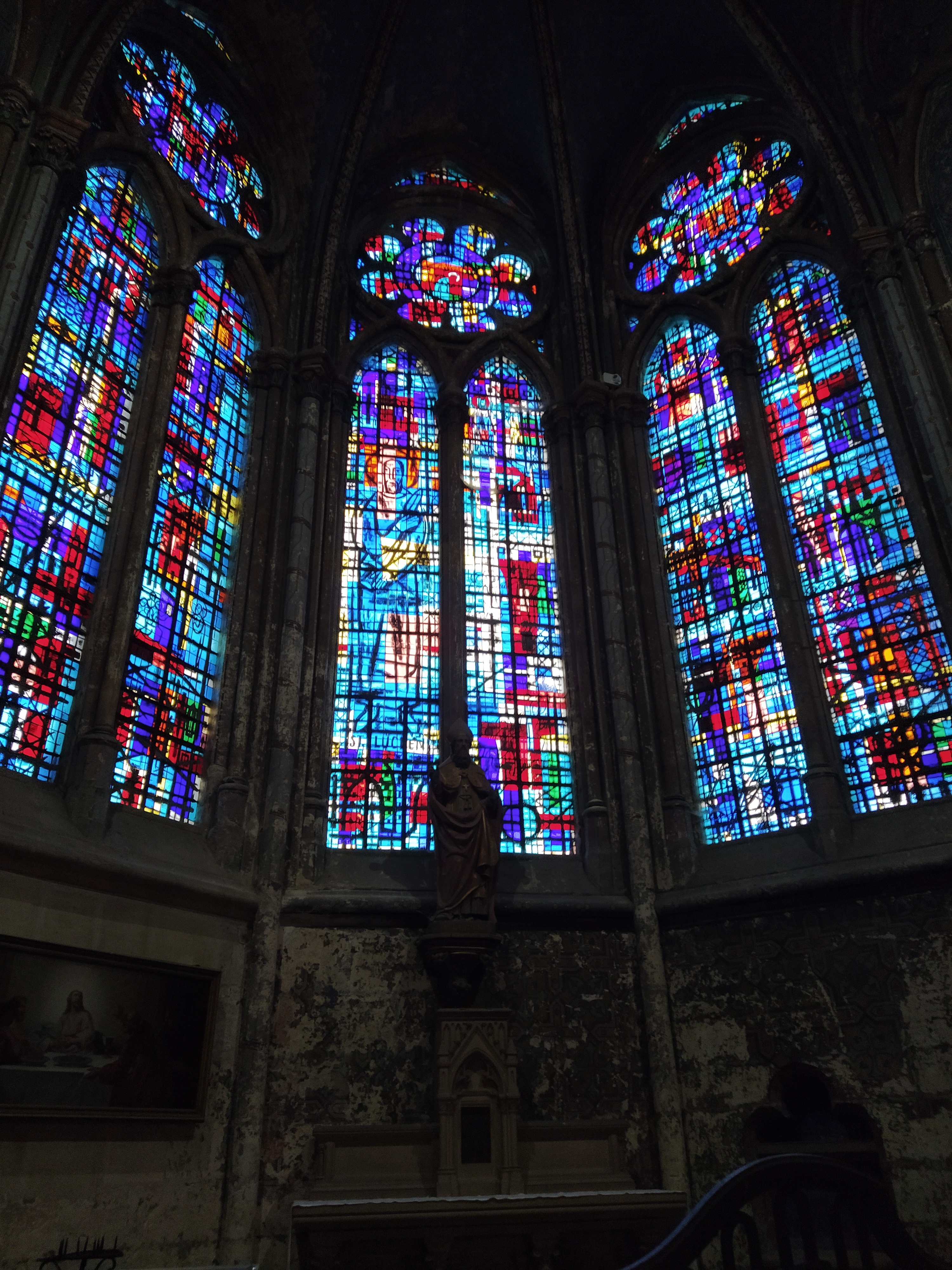 Over a deliciously chocolatey cappuccino I searched the websites. The confusion lay in that the information about the church of Saint-Etienne de Beauvais and the cathedral Saint-Pierre de Beauvais switch confusingly from one to the other. We had been in the church of Saint-Etienne which is famed for its 16th century stained glass but it was the cathedral the cyclist had been talking about and that was indeed open. The church of Saint-Etienne had not only been badly bombed but had also suffered fire damage. The windows are considered to have been created in the studio of Le Prince, celebrated glassmakers who produced windows for both the cathedral and the church over three generations of the same family during the Renaissance. More confusion! (We only saw one rose window by them in the cathedral and from an awkward angle due to the travaux)