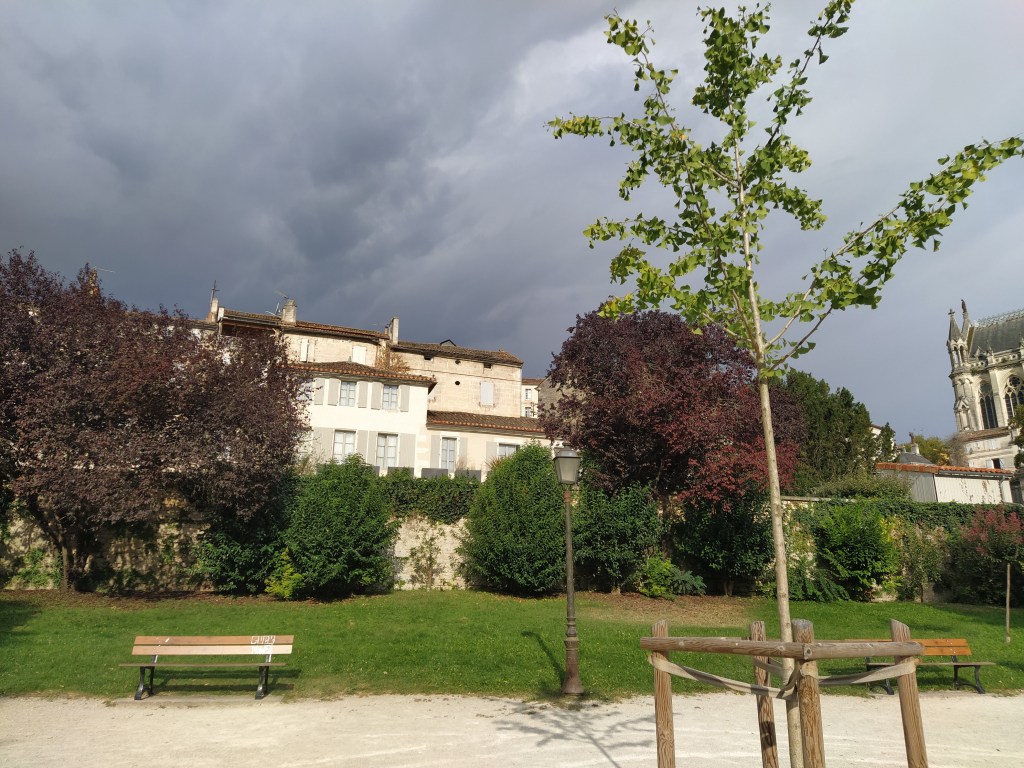 I walked through the little park below the hotel and hoped the black clouds would not tip their contents all over me! As I walked I was aware of just how steep the hill actually was and very glad we hadn’t attempted to do it together with the wheelchair.