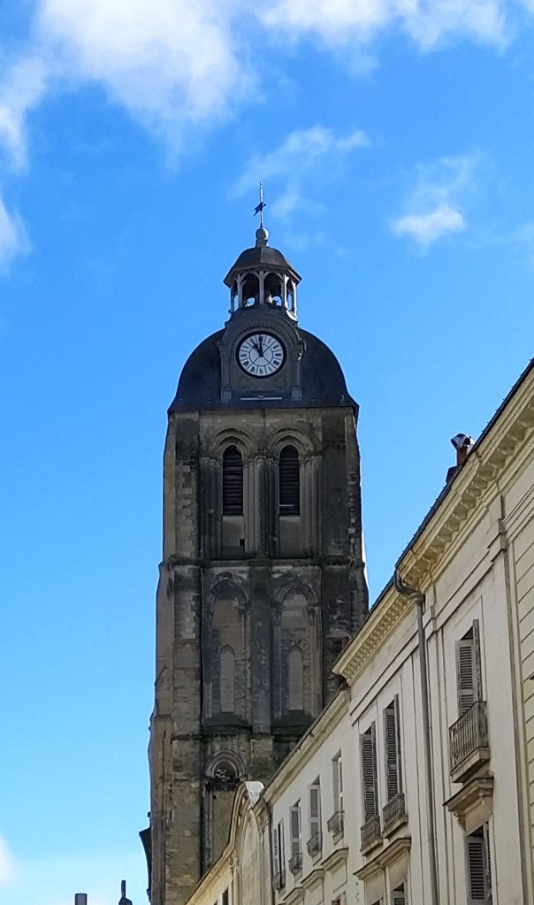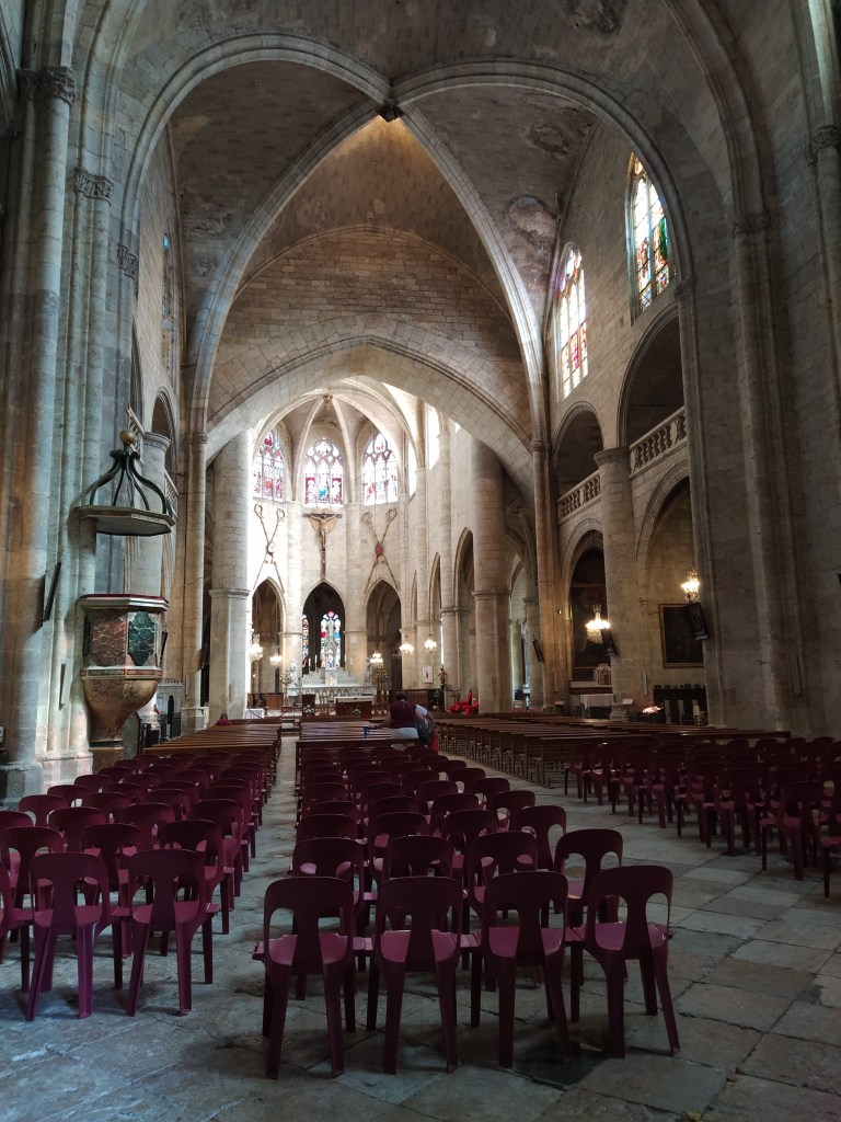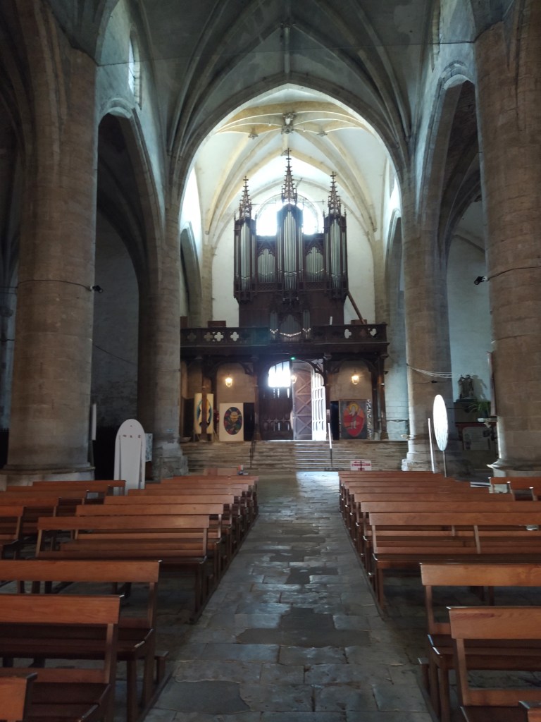 We went off to look at the church of Saint Laurent, himself using his ‘canne anglais’ rather than his wheelchair. There were huge and slippy steps down into the nave so I went in on my own. I was impressed with the immensity of the columns supporting the roof.
