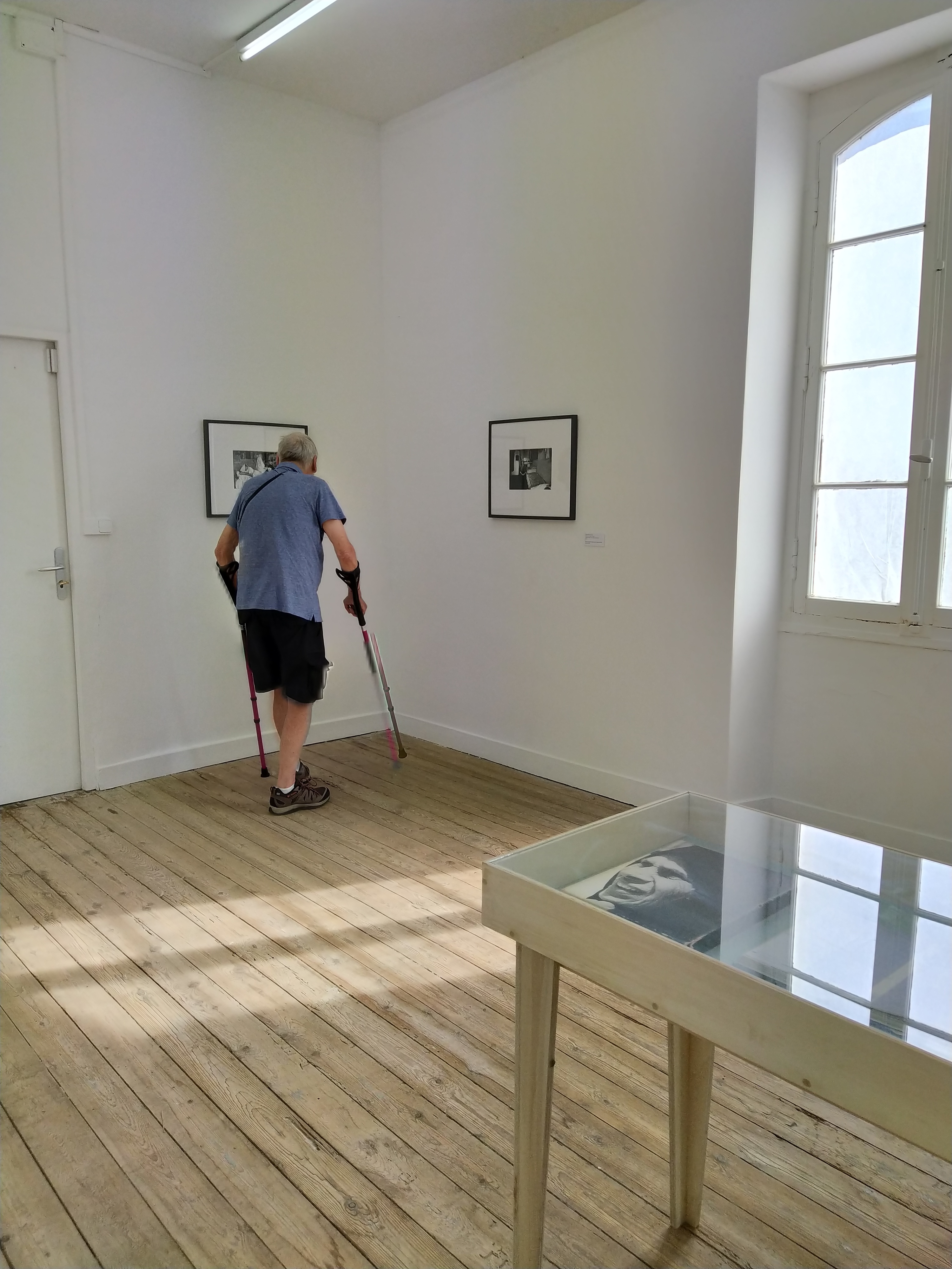 Over paninis in a nearby cafe (I had to ring and cancel our lunch booking at a fish restaurant as we were too far away to arrive in time) we regrouped and discovered we were by a stop for a bus that would get us almost back to the gallery we wanted to visit. With his two crutches, himself was treated politely by the bus passengers and a seat was quickly vacated. A short walk to the Chateau d’eau where we were both given free entry despite owning up to having no paperwork to support his handicap (a result of no given diagnosis).