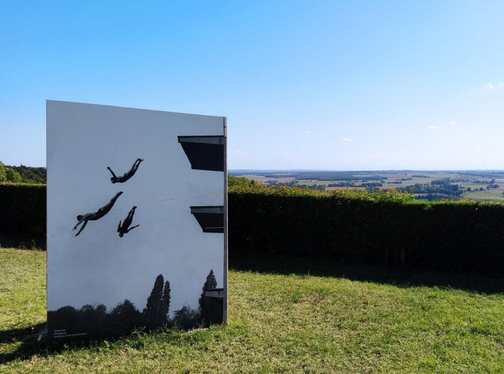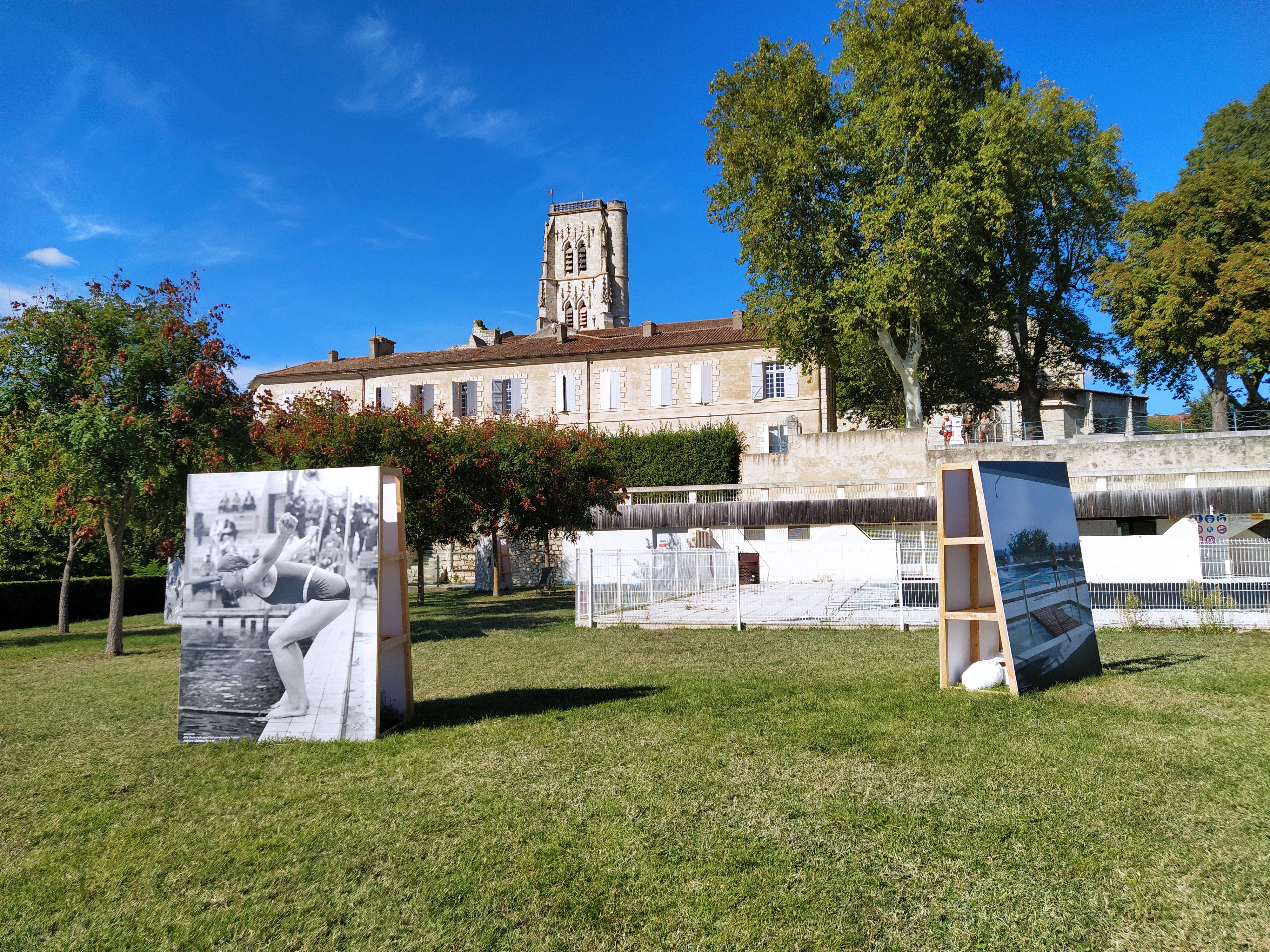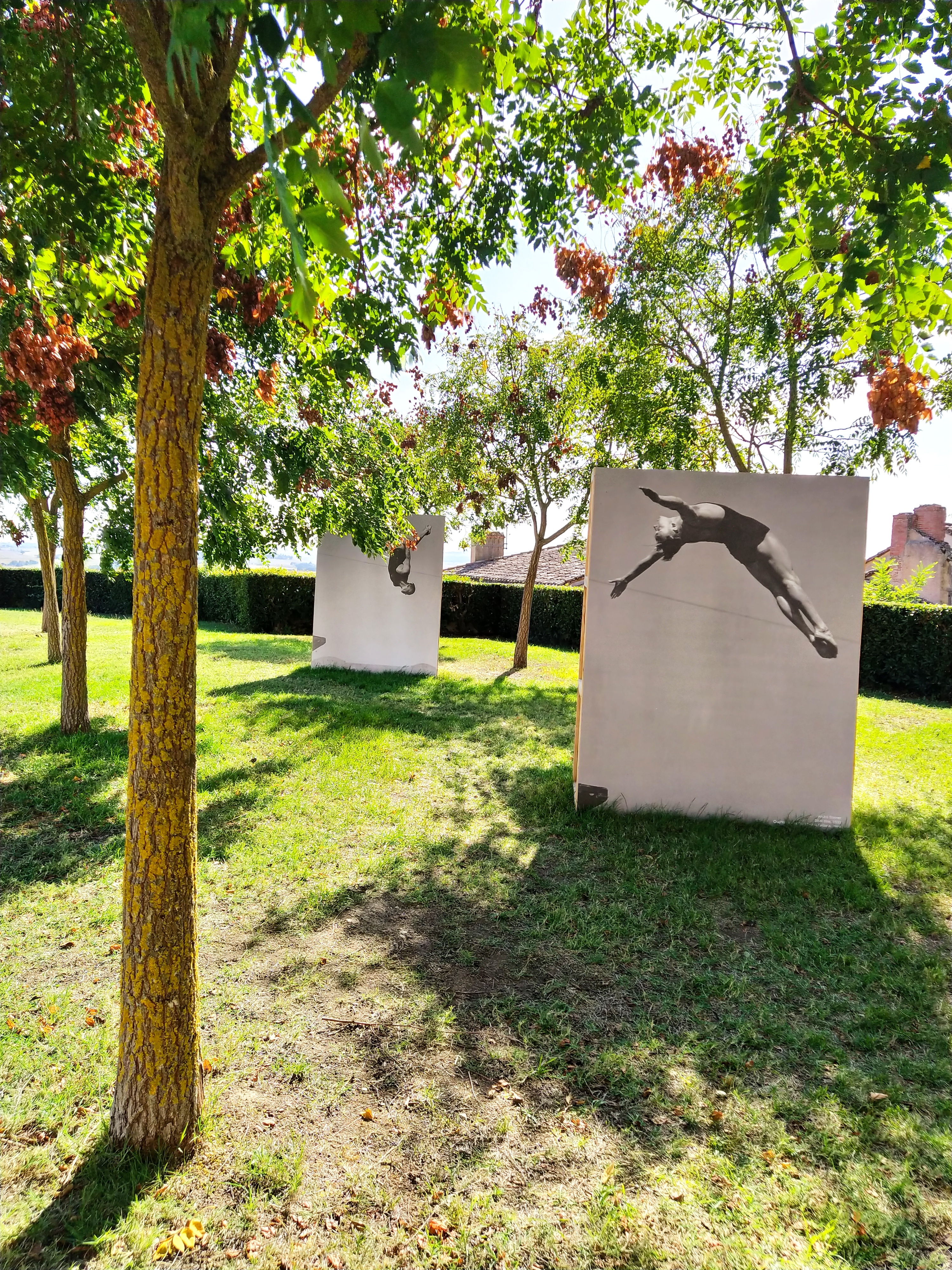 Up another flight of steps and across a garden to find the photos around the abandoned Lectoure swimming pool. But to get close to them was down yet another flight of dilapidated and broken stone steps, which even I went down very gingerly. Leaving the poorly one in the garden (the wheelchair was in the care of the bored girl looking after the video in the cellar!) I took in the view as well as the art.
