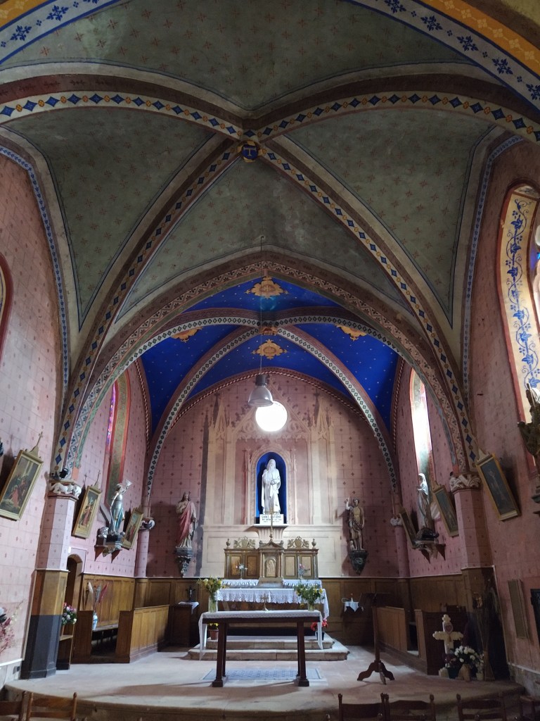 And a gem it was, probably recently refurbished as the colours on the interior surfaces were bright and breathtaking. I had passed a group of pilgrims outside the village auberge, identifiable by the scallop shells attached to their enormous backpacks. One of their number came into the church while I was there and, being me, after the obligatory bonjours, I asked how far she intended to walk.