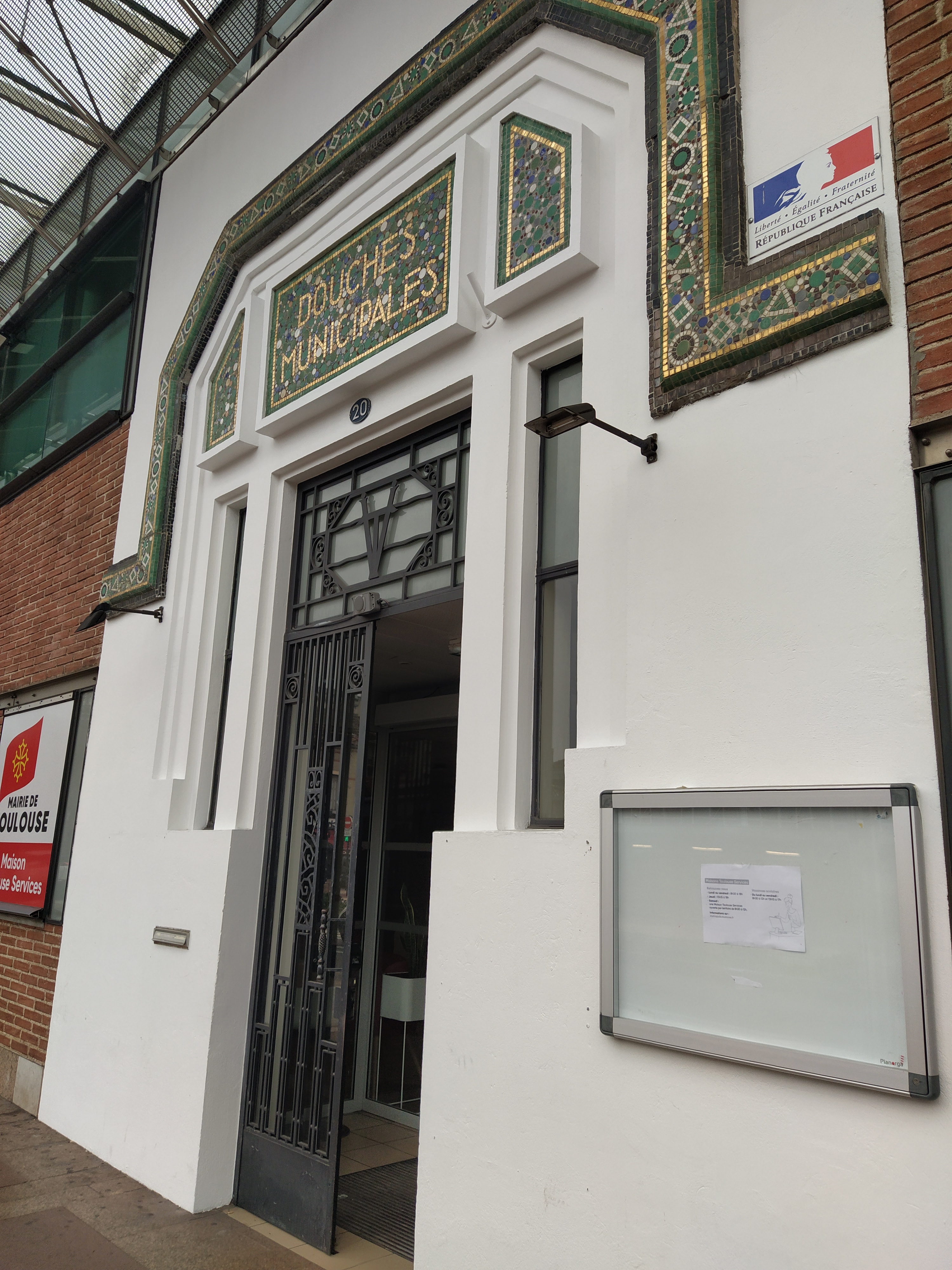 There were municipal showers built on this site, opening in 1931, designed by the municipal architect, Jean Monetariol and commissioned by the maire, Etienne Billieres, when many homes in the area didn’t have bathrooms. There were 24 shower cubicles available at 1.25 francs a time. The building eventually ceased operation in 1992 as home sanitation improved and it ultimately fell into disrepair. When the underground carpark and new council offices were built in its place the mosaic was reinstated on the facade as a reminder of its heritage. The original ironwork door, with its entwined T V for Toulouse ville, has been preserved too.