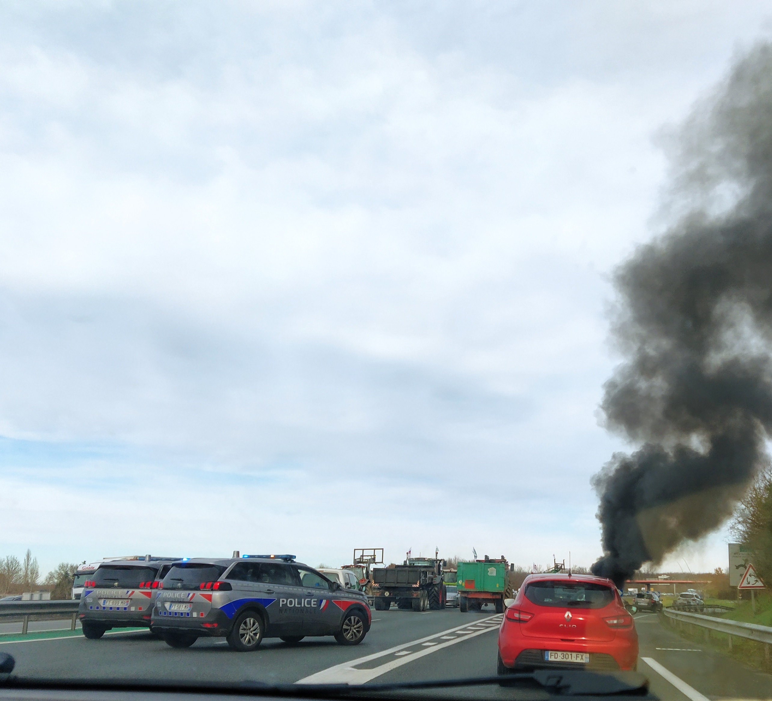 Bum! We had just missed an exit so we’re obliged to idle in the queue to leave at the next one where police cars, tractors and burning tyres heralded yet another ‘blocage’.