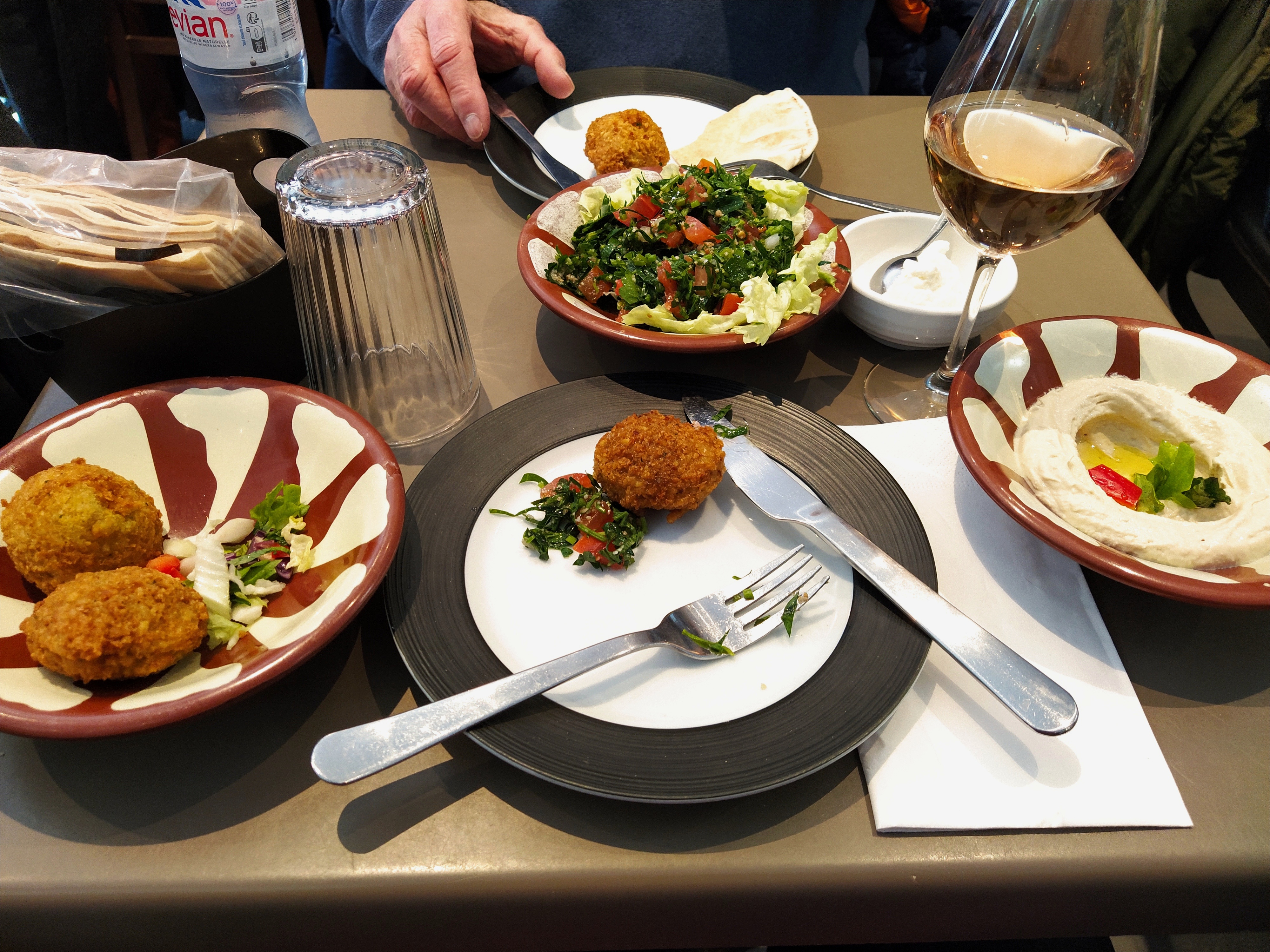 Feeling peckish we decided to return to rue Colbert to see if we could find a light lunch somewhere. Himself remembered the Lebanese cafes so we scrutinised a few menus and opted for the Beyrouth which has two tiny places a few doors from each other. We squeezed in and ordered several mezzes to share. Hmmm, maybe not such a light lunch as planned!