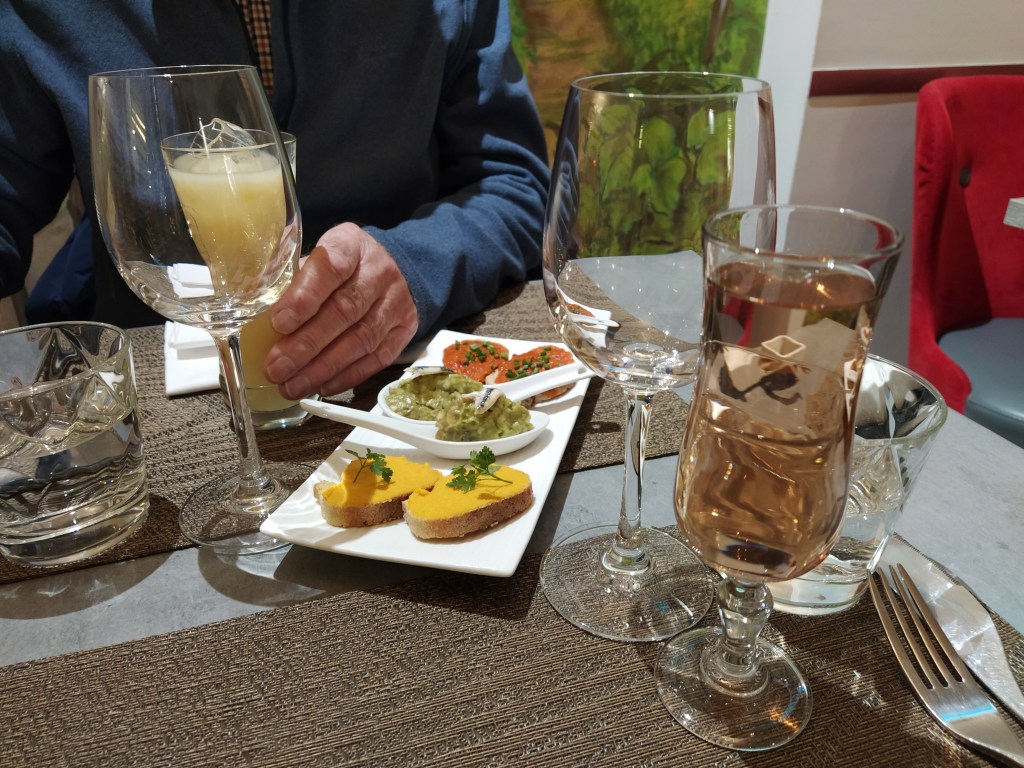Needless to say, most of it disappeared as it was freshly prepared and delicious. It was decided a return to the hotel for a short nap might be a good idea but first, find a restaurant for the birthday dinner. Already we’d seen the ‘complet’ signs had gone up in quite a few windows. After several turns back and forth we booked le Laurenty which was very busy at lunchtime so seemed a good advertisement. I chose the first sitting for seven o’clock.