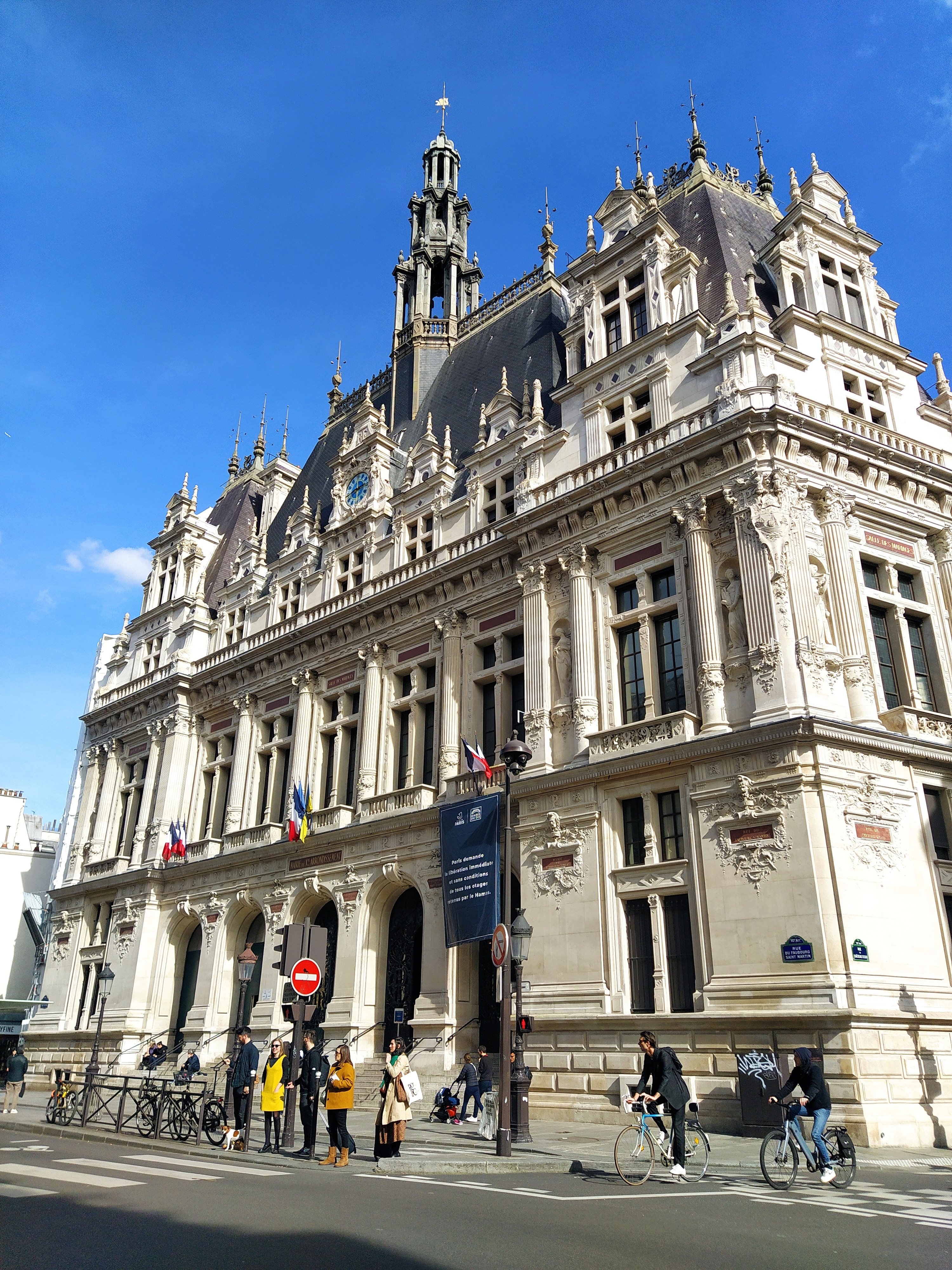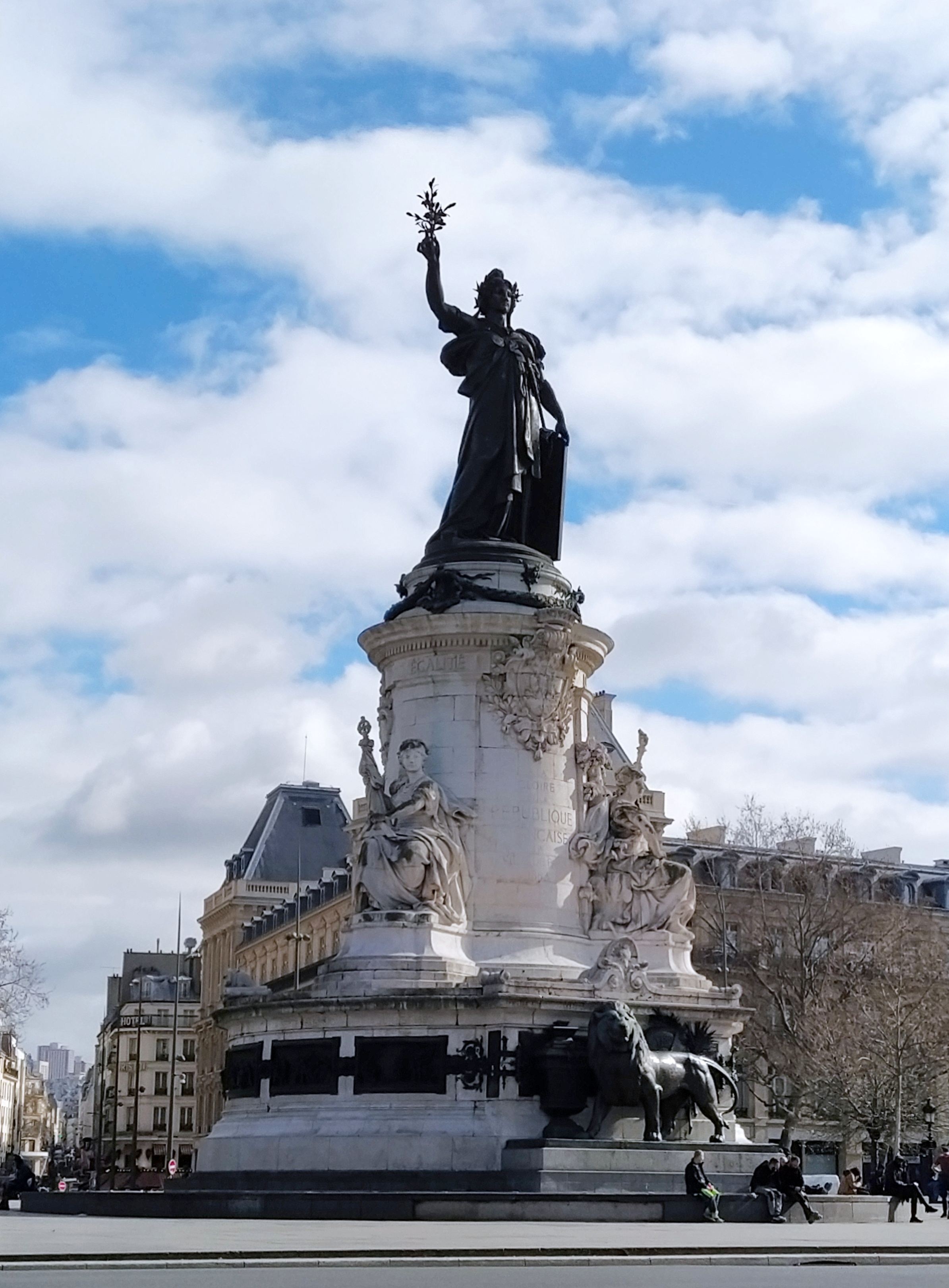 Our route took us around ‘Place de la Republique’ a long rectangular open space with an enormous bronze statue of Marianne and the three further stone ones around her representing the three tenets of the French constitution ‘liberte, egalite and fraternite’ at its centre. Apparently the pedestrian area was created around 2008 to give walkers precedence over the thundering traffic.