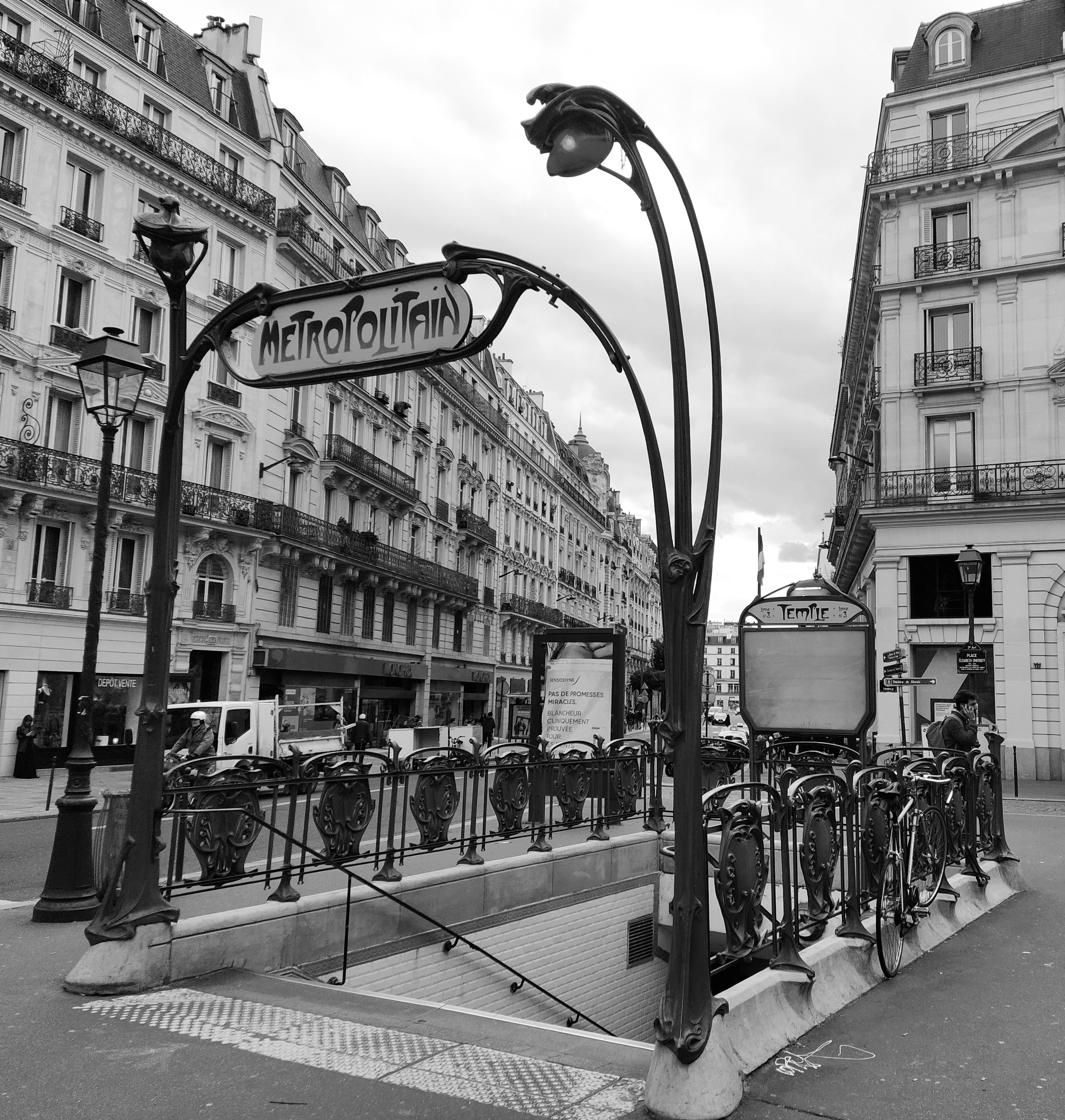 As we walked I grabbed photos of things I could look up later. One place in particular was 79, rue de Temple with two information boards each side of its huge doors. Later research threw up many things about this auspicious address, one interesting fact being the existence of one Elizabeth Dmitrieff, a communard who launched the ‘Union des femmes pour le defense de Paris et les soins aux blesses’. I discovered she had a tiny square named after her established in 2007 by the socialist mayor of Paris at the time. By coincidence, I unwittingly took an arty photo of the metro station in the middle of it on our way back to the hotel!