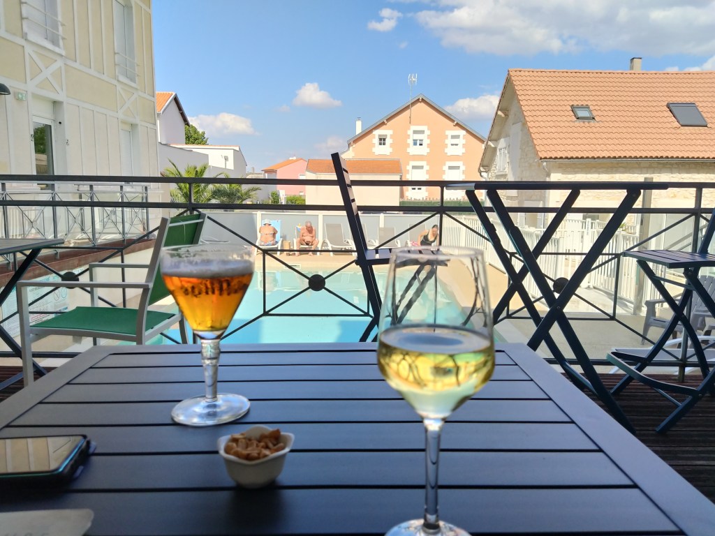 Chatelaillon-Plage looked a tad bleak on Google earth as the photos were taken in the winter but there was a long expanse of beach with what looked like a quiet road with old fashioned seaside villas running behind it. A bonus was that it was only a thirtyfive minute drive to the island. Given that Mr McGregor’s boredom threshold is very low, the possibility of doing a day trip when the beach palled seemed ideal. So I went ahead and booked a hotel with a pool that was one road back from the beach with restaurants within walking distance. And last week we went!