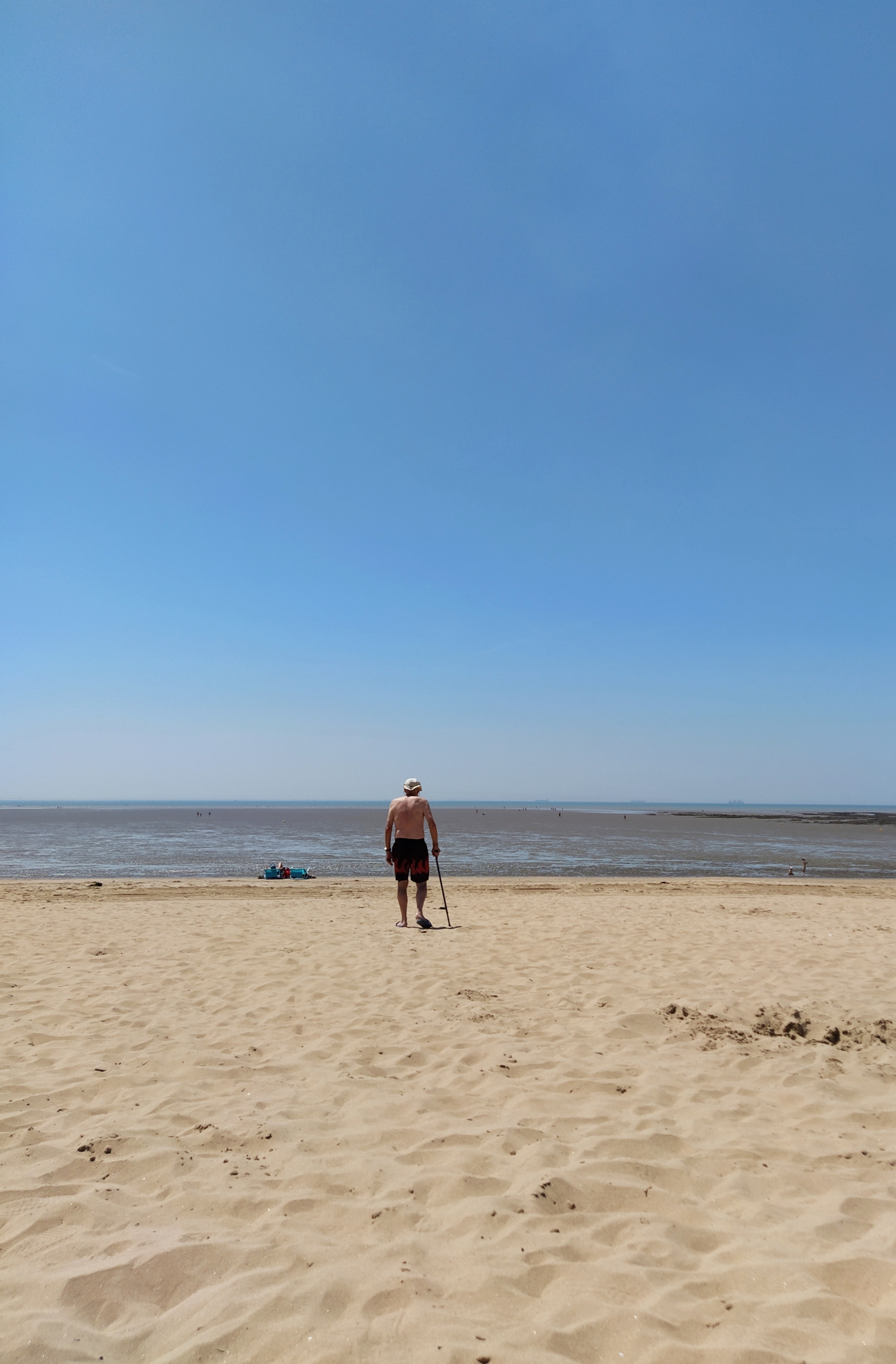 Due to a confused discussion with the staff at the hotel we still had no idea of the state of the tide but put on our costumes under our clothes in anticipation of a sea dip. It was not to be! The water was almost at low tide and was only to be reached after a squelchy walk which neither of us fancied just for a paddle. We had been able to borrow a parasol from the hotel and so reclined on a blanket thing I had bought ages ago and never used, to enjoy our picnic…bliss!
