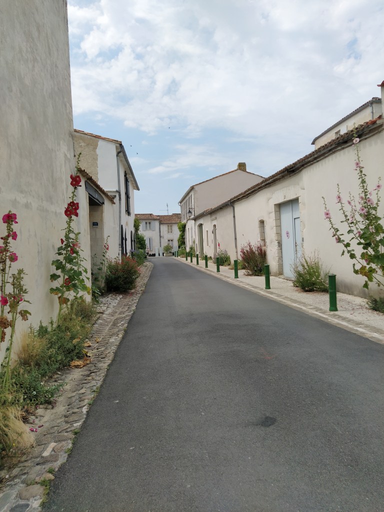 As we drove towards the seaward end of the island, home to an enormous lighthouse, I noticed the abundance of hollyhocks and giant agapanthus. I love both flowers but have failed miserably to grow hollyhocks and my elderly agapanthus now produces leaves rather than flowers. It needs dividing, I’m told. We avoided the centre of Saint Martin, the harbour village I had originally booked, as the parking looked difficult and it would probably be as crowded as La Flotte. The village of Ars-en-Re was seen from a distance, its celebrated ‘fleche’ reflecting the sun from its white base from which an odd black spire rose, a ‘daymark’ for sailors apparently. Ars is another ‘plus beau village’ plus being part of a group of villages of ‘stone and water’, a designation cooked up by the Charente tourist office it seems.