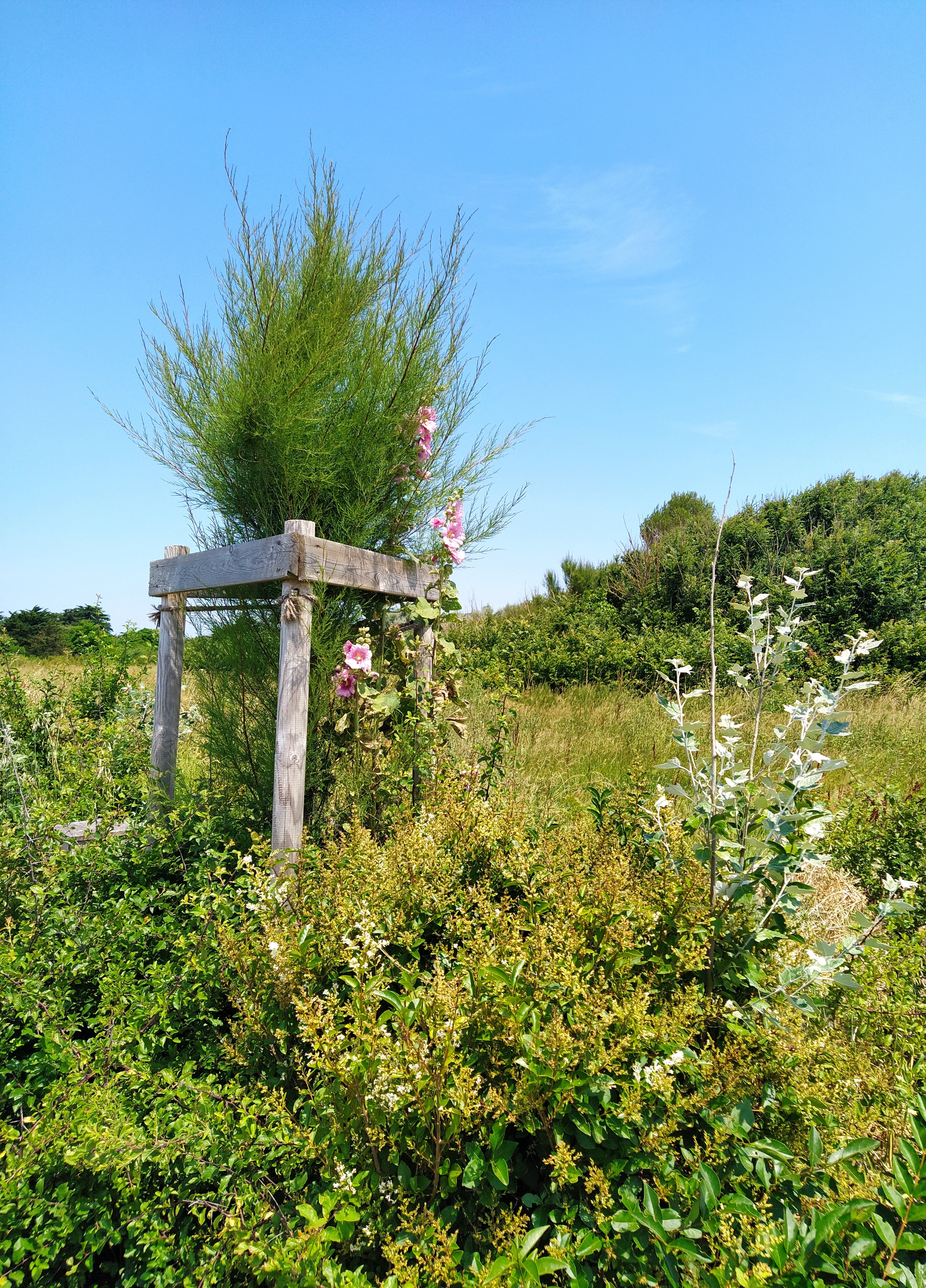 Studying the map I decided (as the designated driver these days) we would drive around the southerly side of the island and see some of the places our neighbours’ recommended. Several of the little villages are bypassed by the bigger roads so I swung off onto little ones that wiggled past white walls with hollyhocks swaying against them. Sadly, the salt marshes seem to be more easily available to cyclists and walkers. Our neighbour told us later that you can buy salt from tables outside cottages with honesty boxes for your payment. A lot more reasonable than the fancy little bags at the tourist shops. There are about one hundred sauniers/salt workers on the island making seasalt in the traditional way that dates back nearly a millenium. There are some quiet beaches nearby too. Next time?