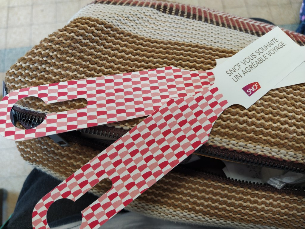 Duly left at the station (merci bien, Jean-Michel) we still had a half hour to fill! I idly read posters while himself read the local bus timetable. Finding luggage labels and a pen under a stern warning all luggage must be labelled I filled them out and Lou put them on. Very natty..
