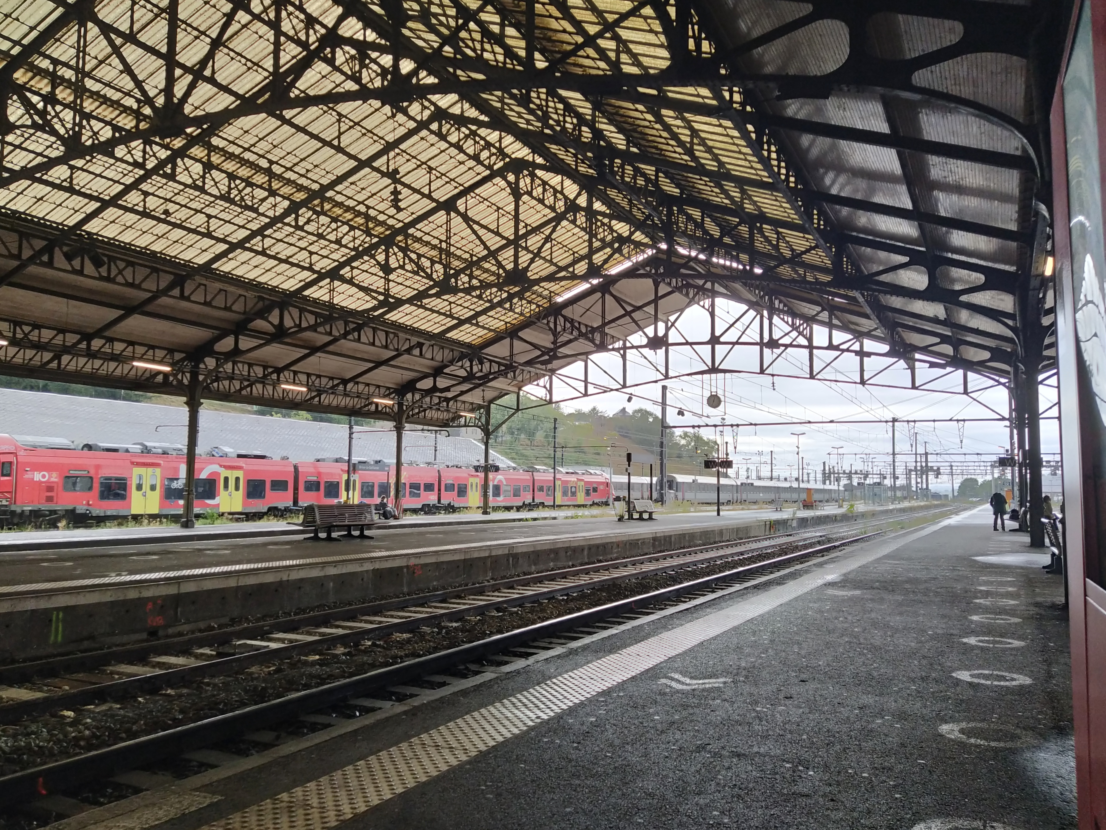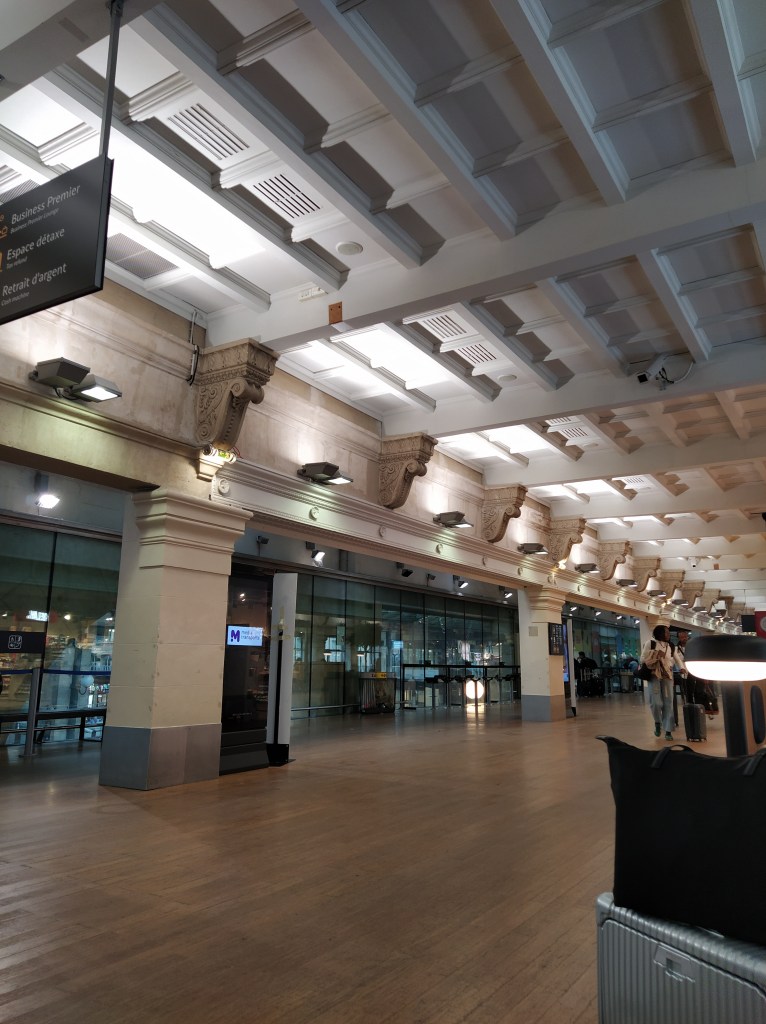 It had looked like a bright and dry day outside so it was pleasant walking despite the luggage. Inside the station we followed the signs and ascended the escalator to where we were sent down marked aisles to passport control. Machine checking so it was a tad complicated as I tried to get my passport the right way round (I chose the wrong photo page and didn’t suss straight away that there was a screen I had to look into before I could be released the other end. Mr McGregor had even more attempts before he managed. Oldies holding things up! French passport control was easier and I knew we had to proffer our carte de sejours as well. Then came the screening bit. I kept reminding himself watch, belt, phone but somehow he ended up with his watch still on. He made several attempts to go through the scanner as I attempted to collect his trays (why three?) as well as my own plus backpacks and suitcases to prevent further delays for the people behind us. New knees? the security chap finally asked in desperation as the beeps continued. Just about to frisk him when someone in front of a computer waved to let my beeping husband through!