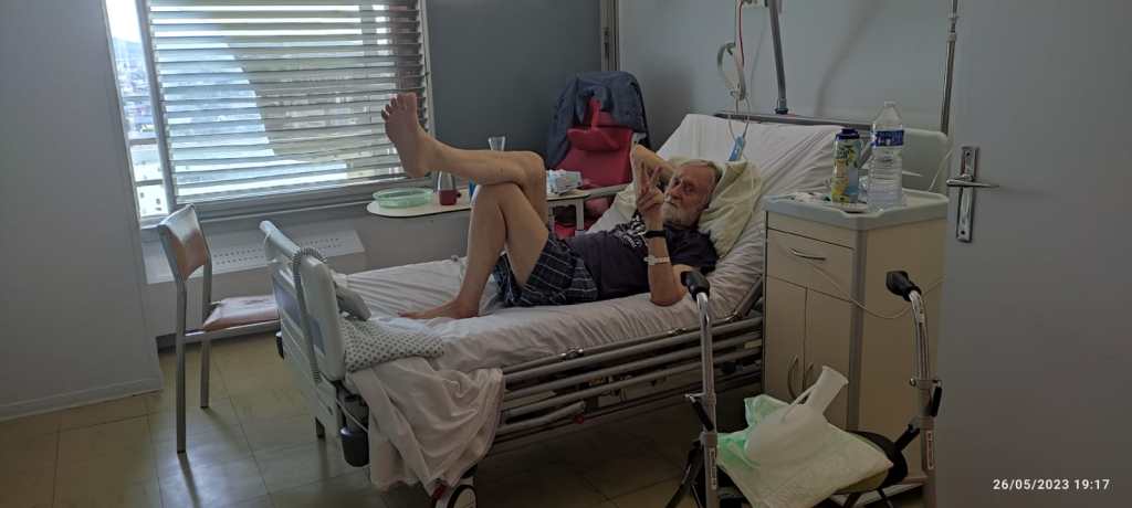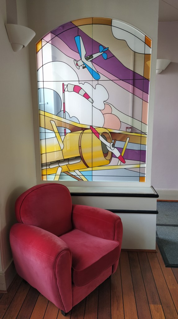 Inside the cavernous building we found the museum entrance but the lift up to it was ‘en panne’. The girl on the desk rushed over convinced it was working but no! So himself got out and, using one of his ‘canne anglais’ (stored in a baguette bag swinging from one of the wheelchair’s handles), got himself up the short flight of stairs while I bumped up his chariot.