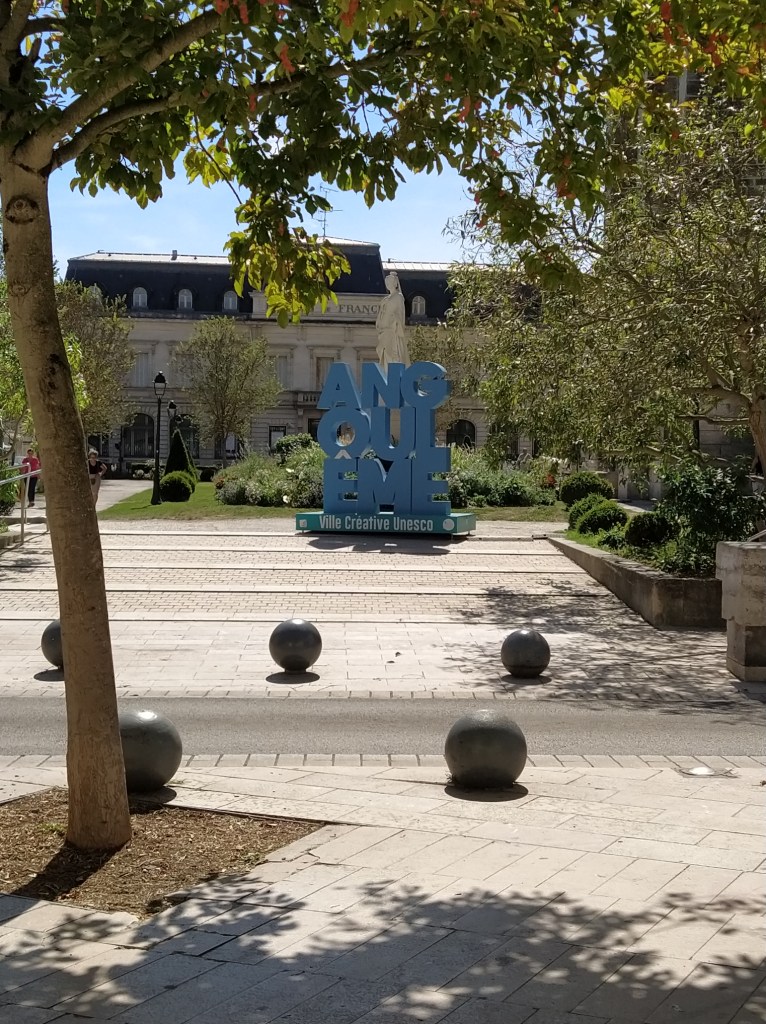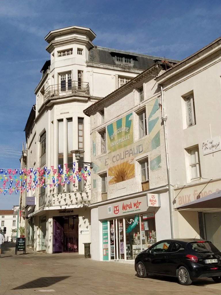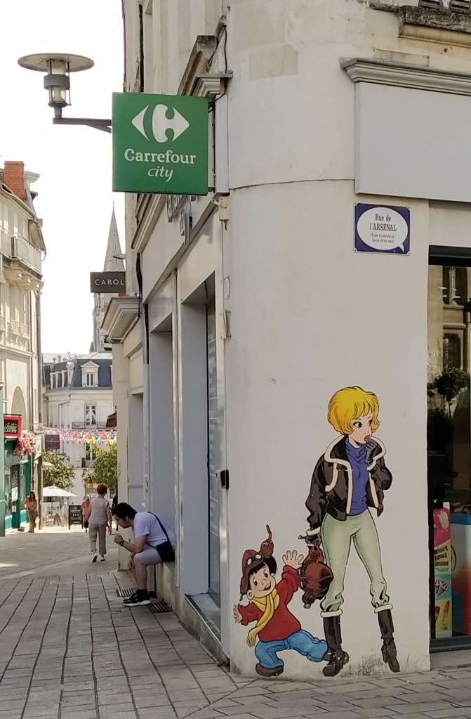 Saturday, our 56th wedding anniversary, was planned as a museum visiting day; a calmer one, we hoped. The Musee de Bande Dessinee is housed in an old winery on the north bank of the Charente river below the city. However, only the decorated façade remains with a modern building behind, all steel and wooden cladding.