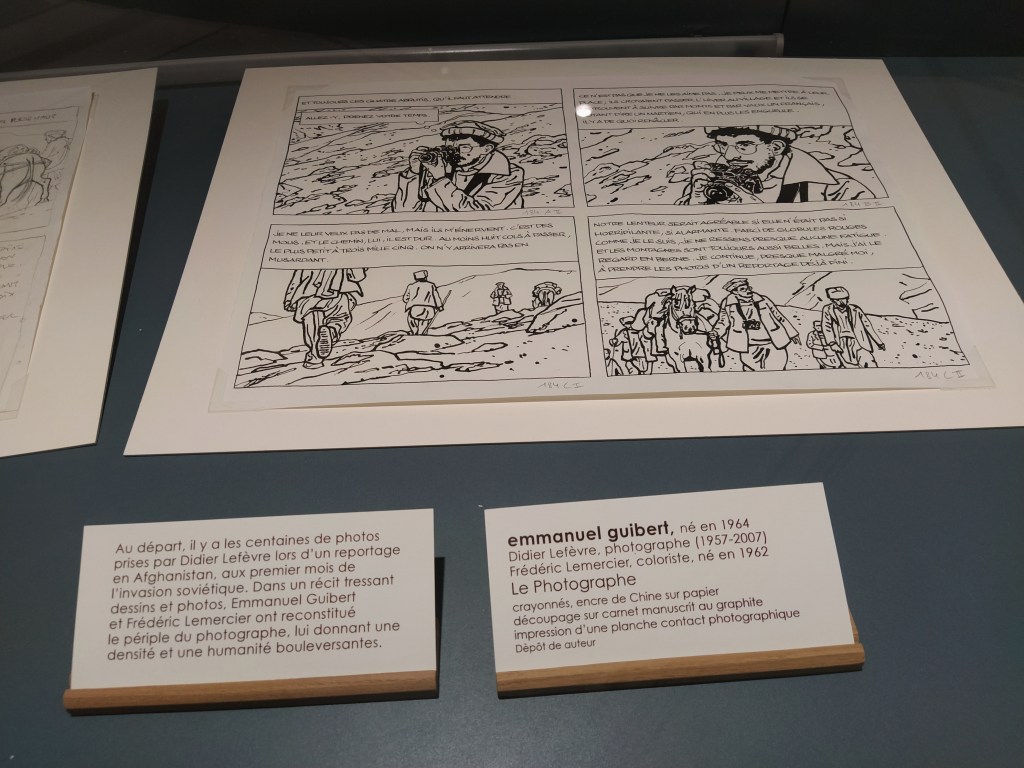 This room was described as representing the maturing of the BD form, moving away from children’s comics and the work we had already seen and into some quite serious representations. I was intrigued by a case showing the work of two illustrators who used the story of a photo journalist’s experiences of the Russian advance into Afghanistan.