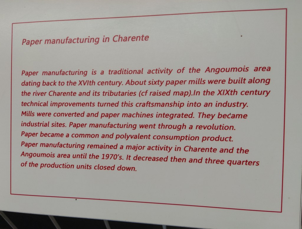 We picnicked on a bench outside under a shady tree. The second visit of the day was to the Musee du Papier on the other side of the Charente which was reached by a footbridge.
