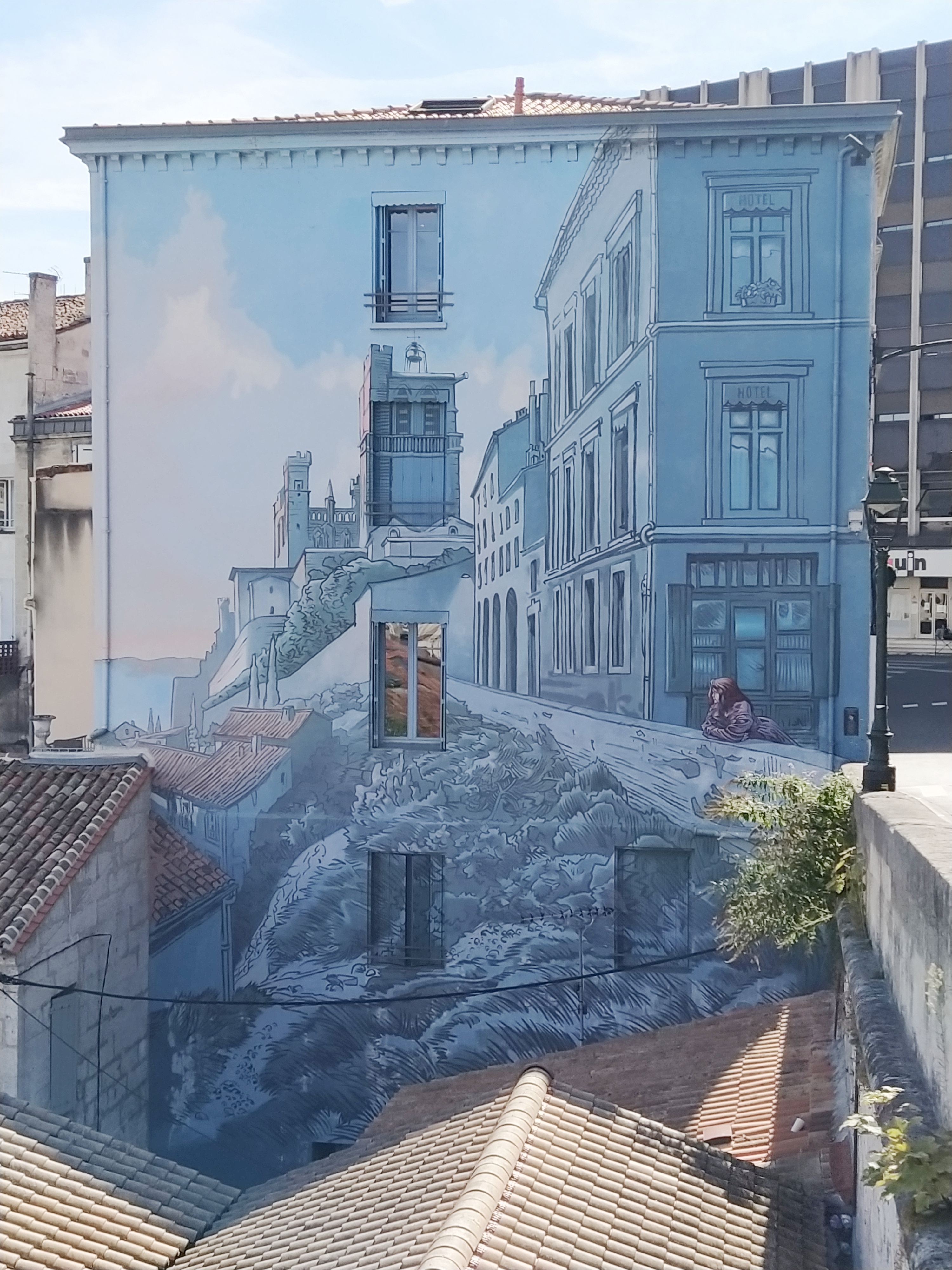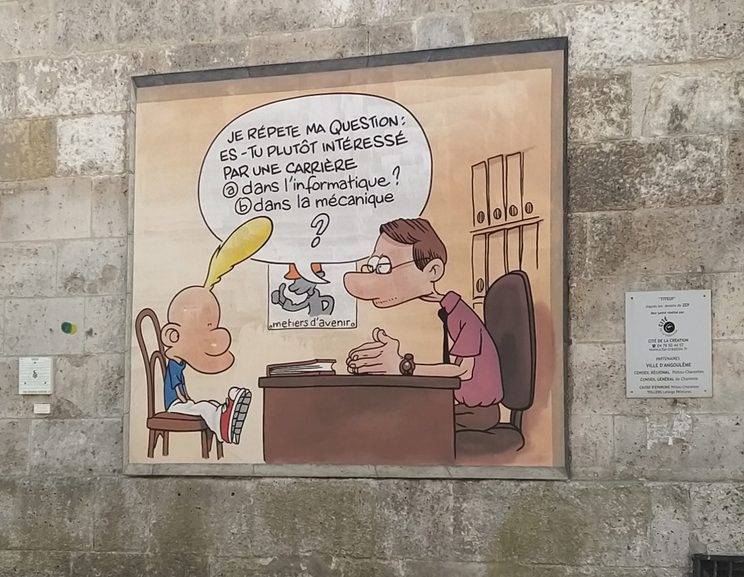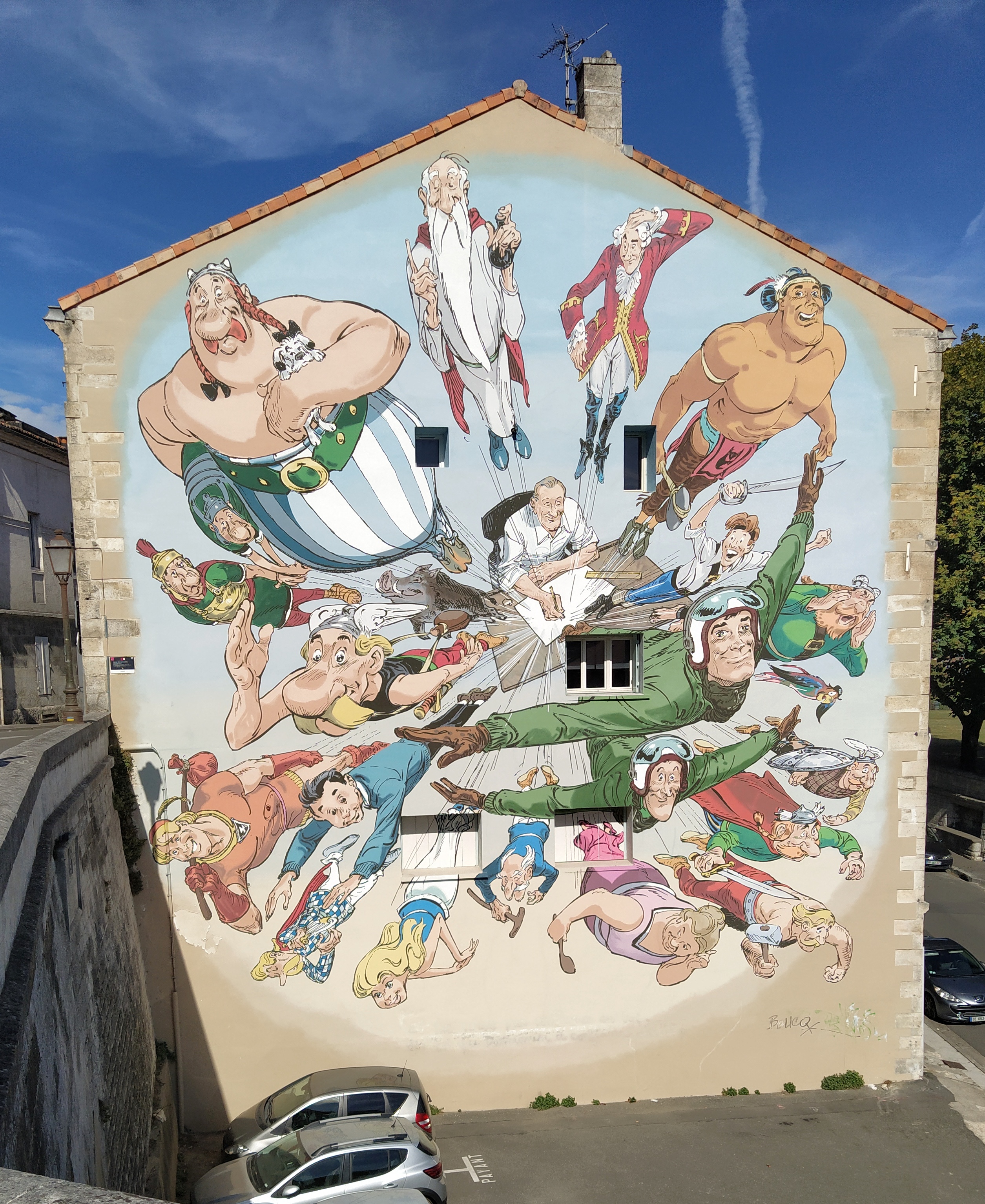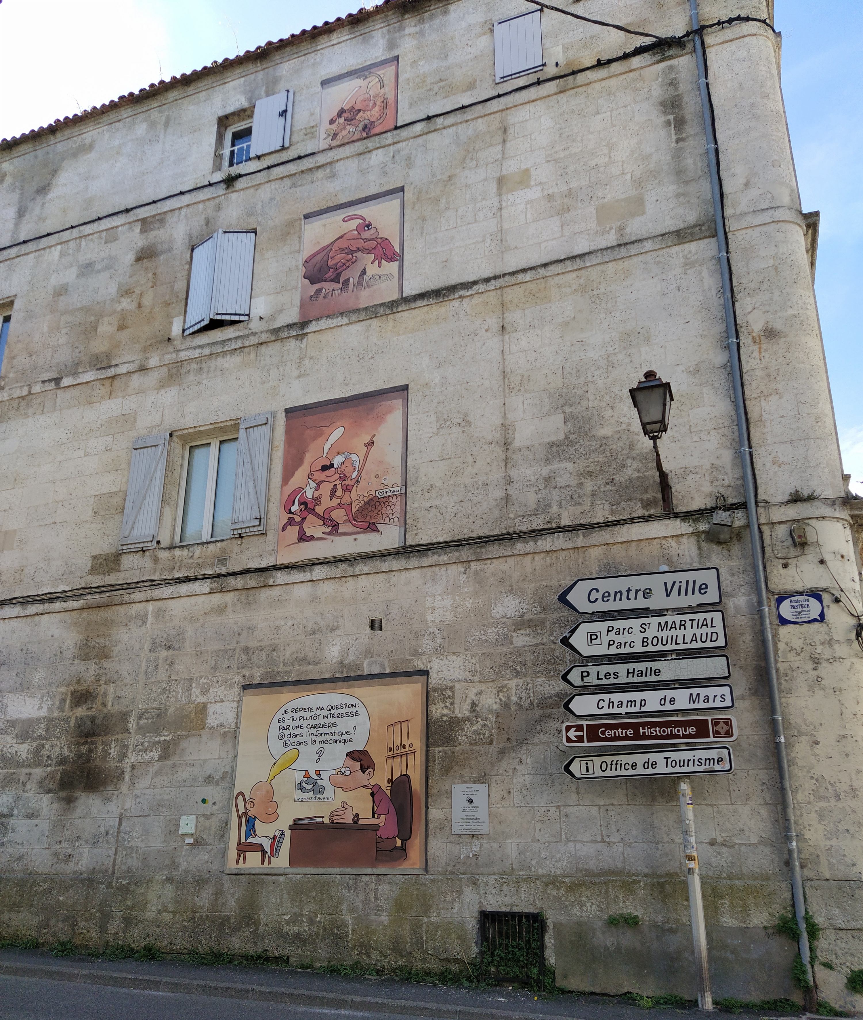 Saturday, our 56th wedding anniversary, was planned as a museum visiting day; a calmer one, we hoped. The Musee de Bande Dessinee is housed in an old winery on the north bank of the Charente river below the city. However, only the decorated façade remains with a modern building behind, all steel and wooden cladding.