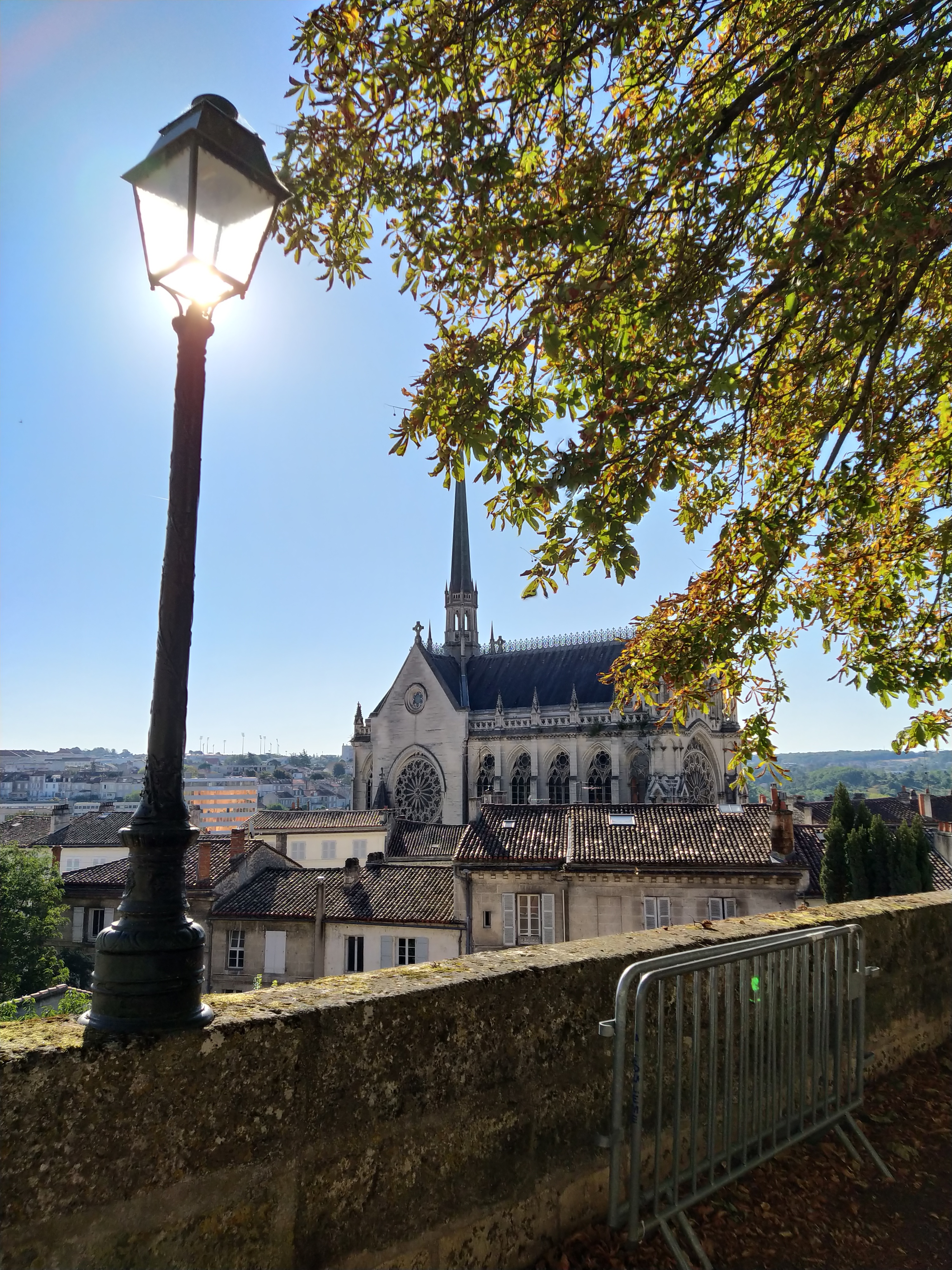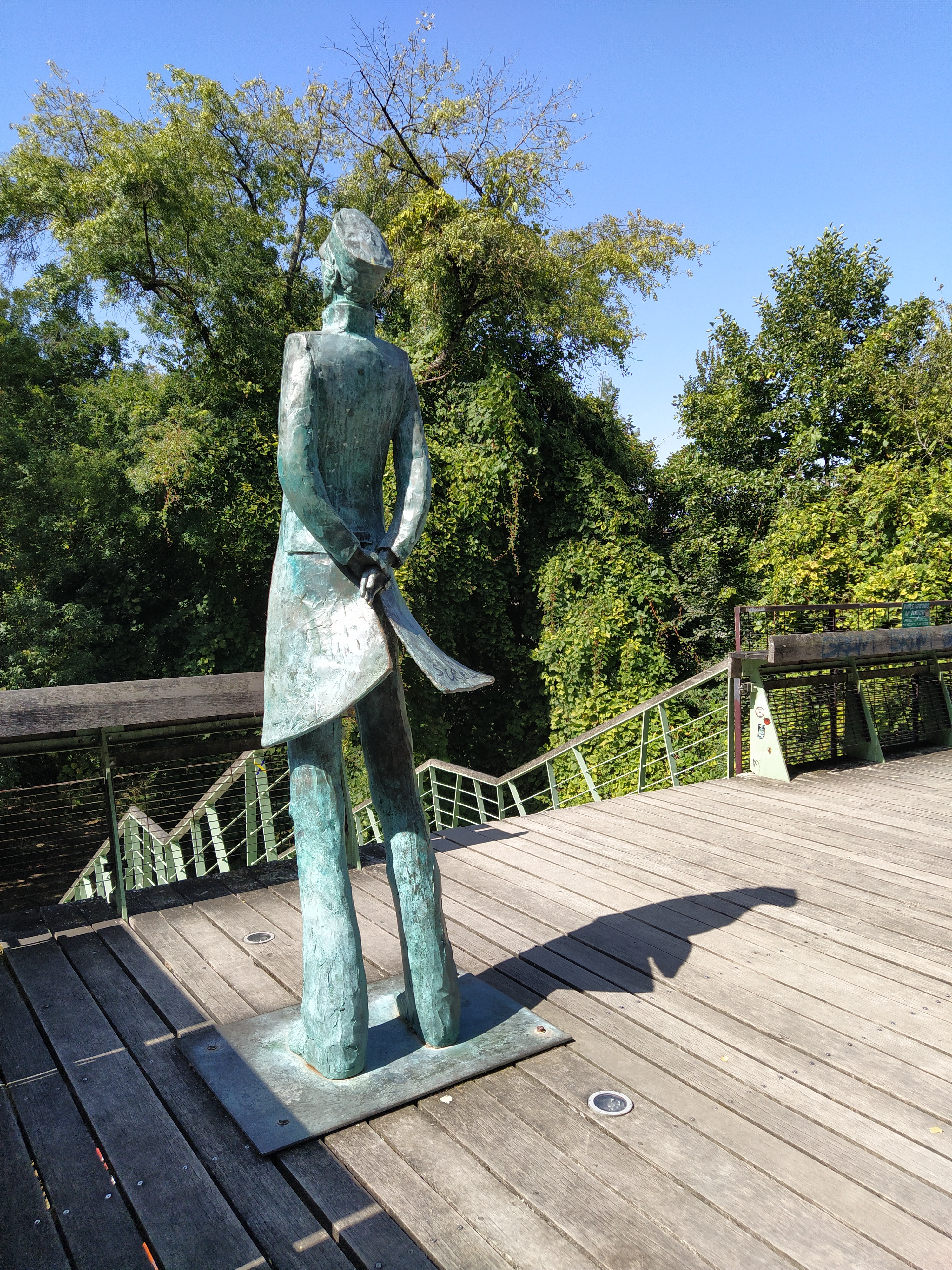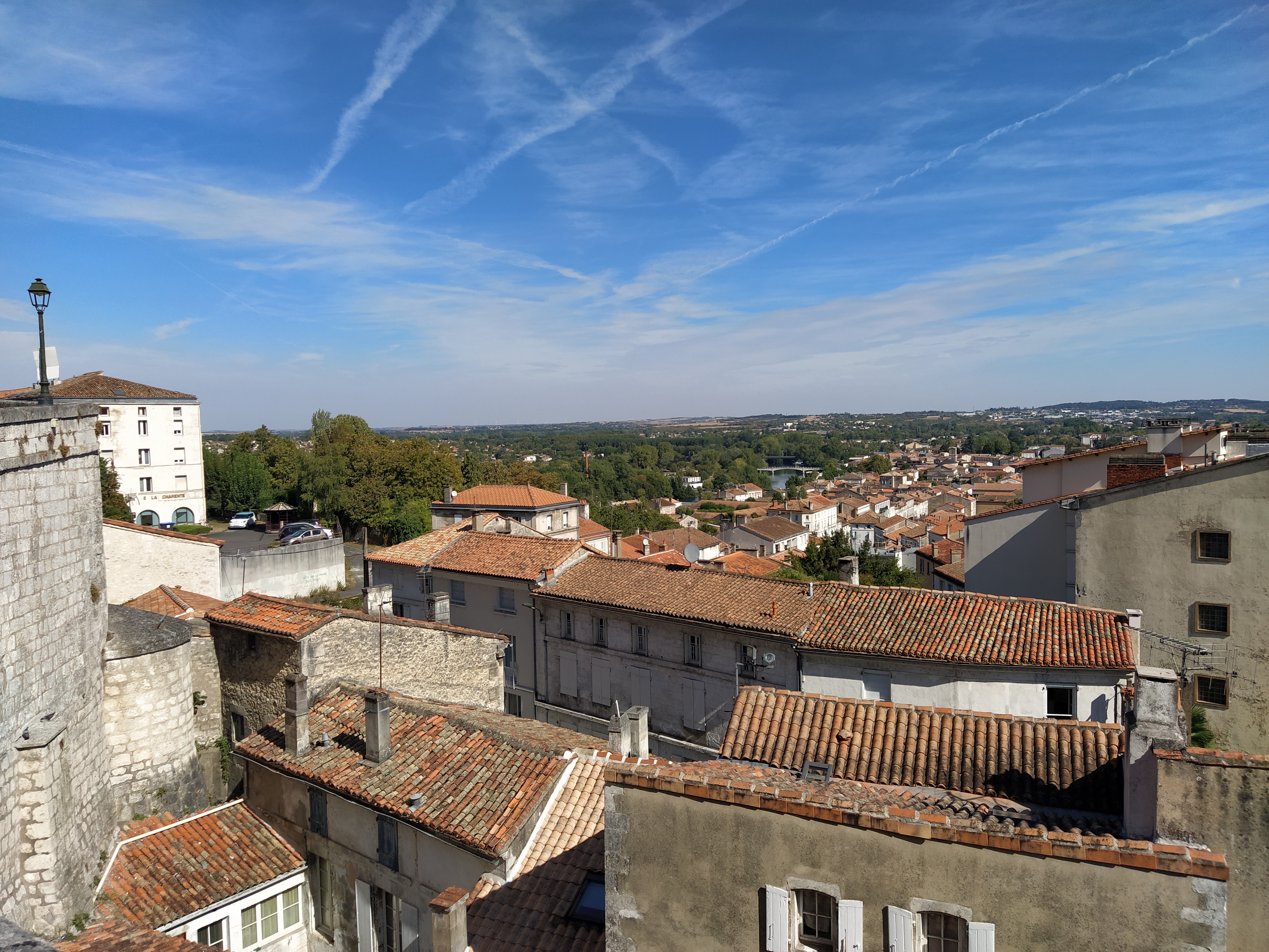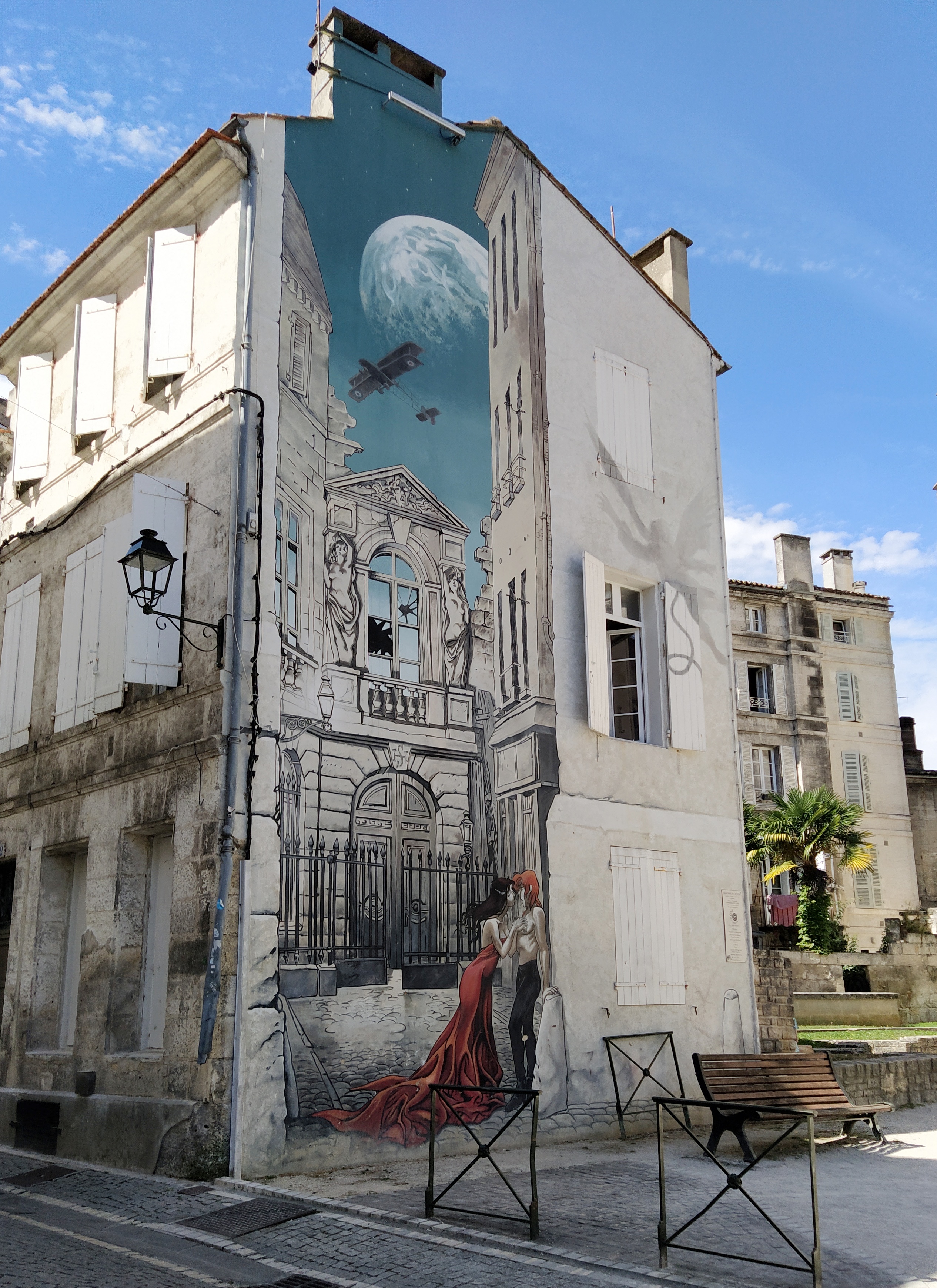 Leaving involved the same lift and locked door saga in reverse but finally we were back outside and recrossing the Charente, past the interesting statue with his flyaway coat tails.