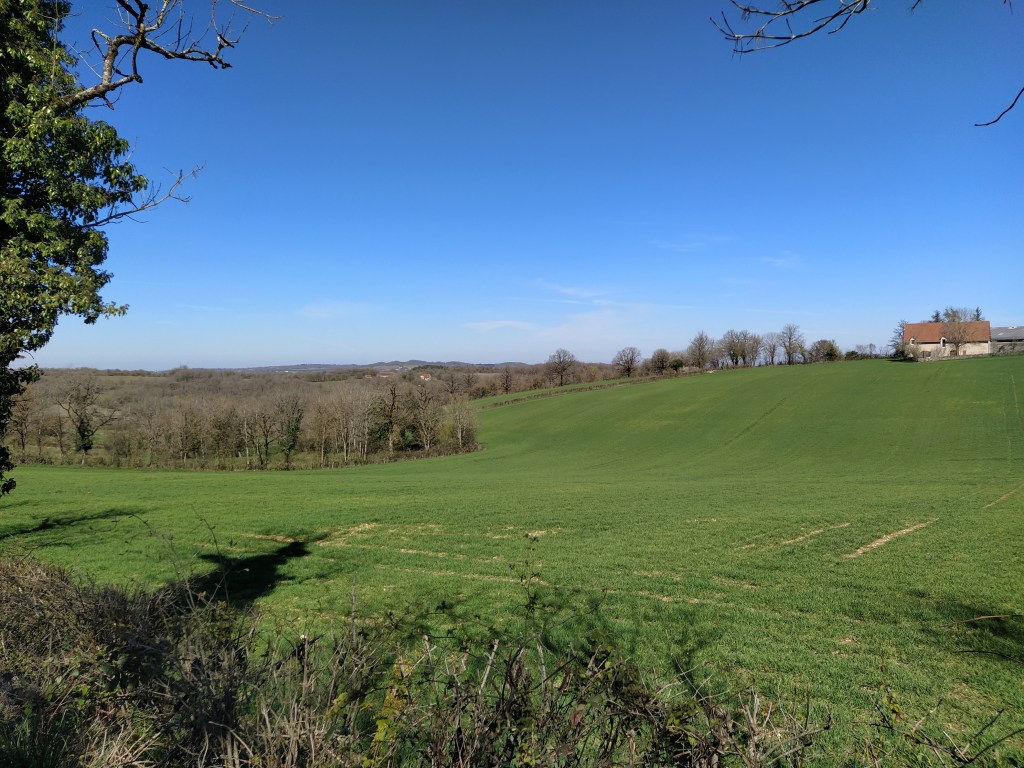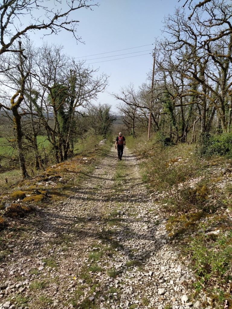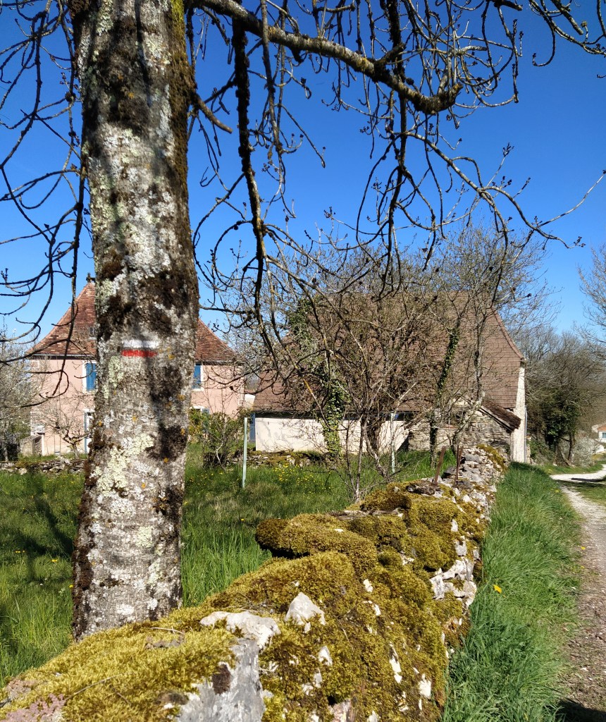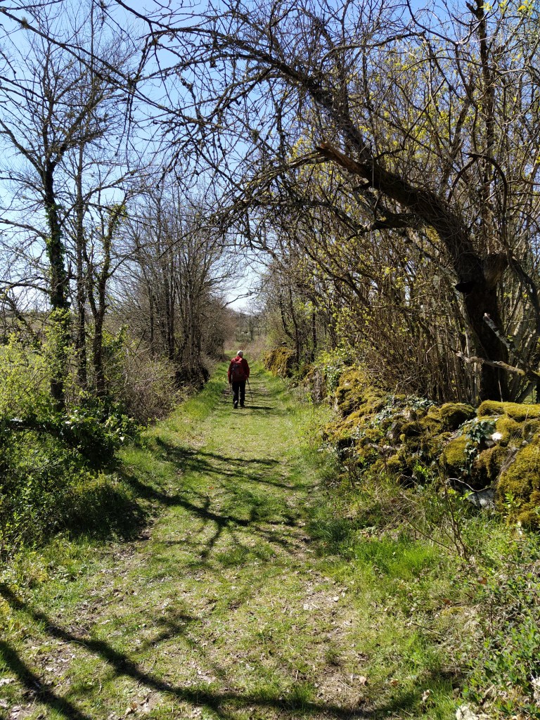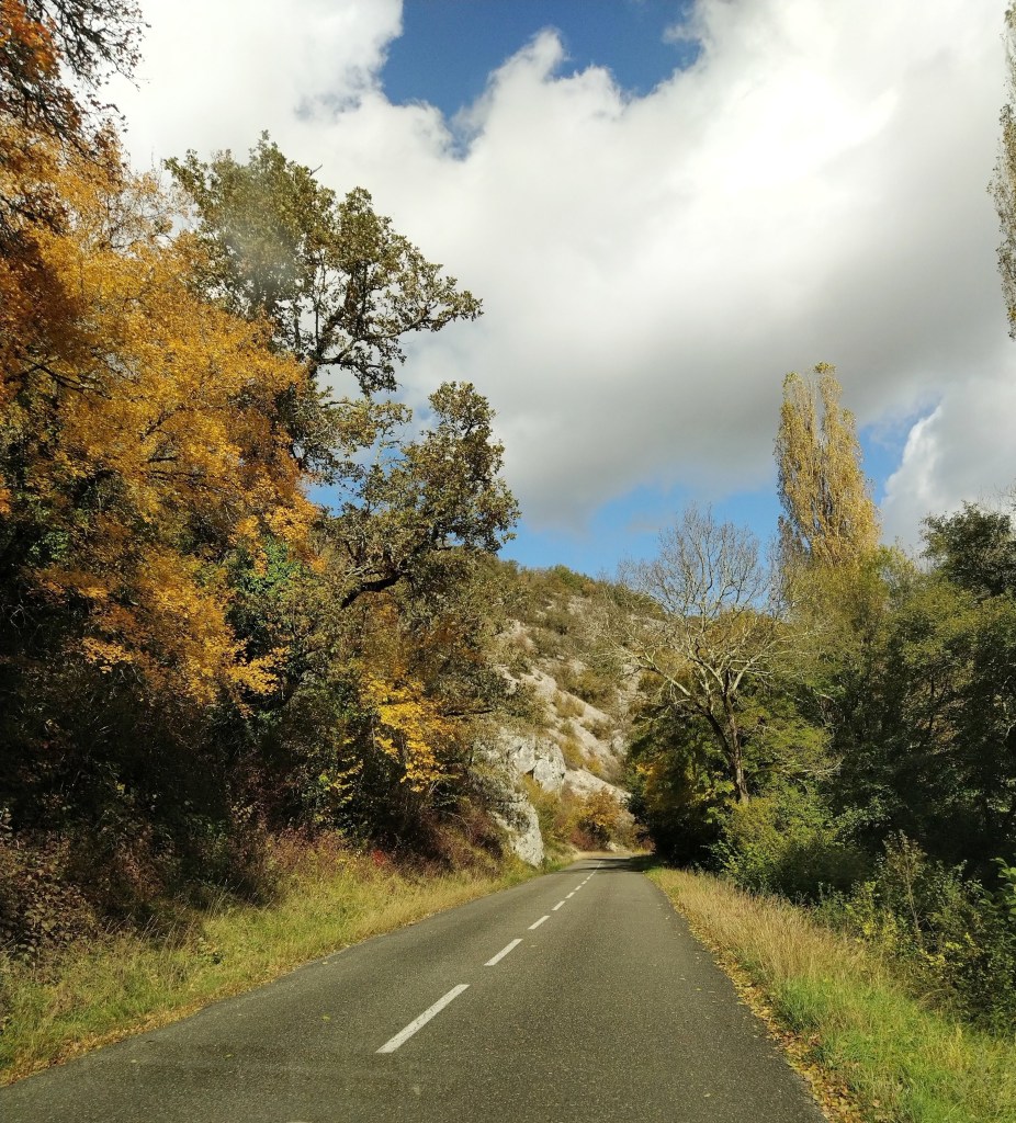 Having climbed up the village High Street we were directed down a minor road that followed the river with stunning views back towards the village church. The summer heatwaves had stopped us walking very far as it was so unpleasant but this was perfect. Soon we were climbing a hollow way slippery underfoot with fallen leaves. My ‘fiche’ told me this was the most difficult part. It soon opened out onto a cart track between fields. Used to walking on our beautiful but dry limestone causse, to be surrounded by green arable land was heavenly. I watched as a buzzard skimmed the treeline in the distance. Later, a smaller raptor took off from our left calling crossly as it did so.