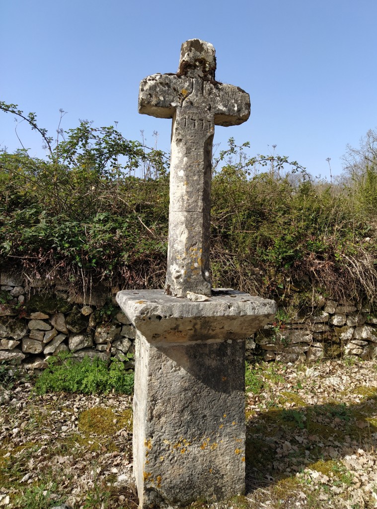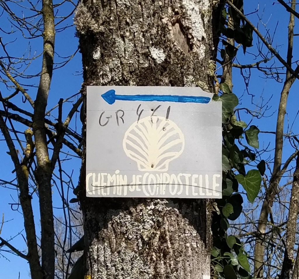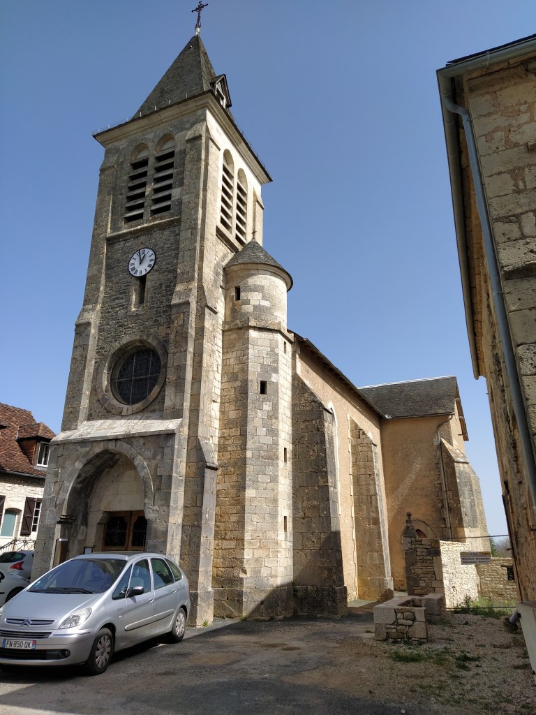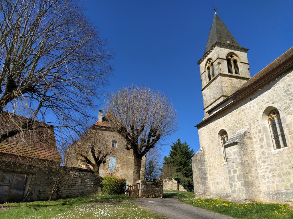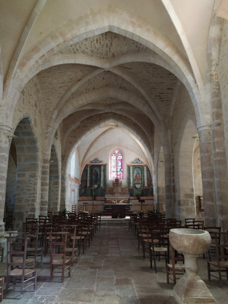 Having climbed up the village High Street we were directed down a minor road that followed the river with stunning views back towards the village church. The summer heatwaves had stopped us walking very far as it was so unpleasant but this was perfect. Soon we were climbing a hollow way slippery underfoot with fallen leaves. My ‘fiche’ told me this was the most difficult part. It soon opened out onto a cart track between fields. Used to walking on our beautiful but dry limestone causse, to be surrounded by green arable land was heavenly. I watched as a buzzard skimmed the treeline in the distance. Later, a smaller raptor took off from our left calling crossly as it did so.
