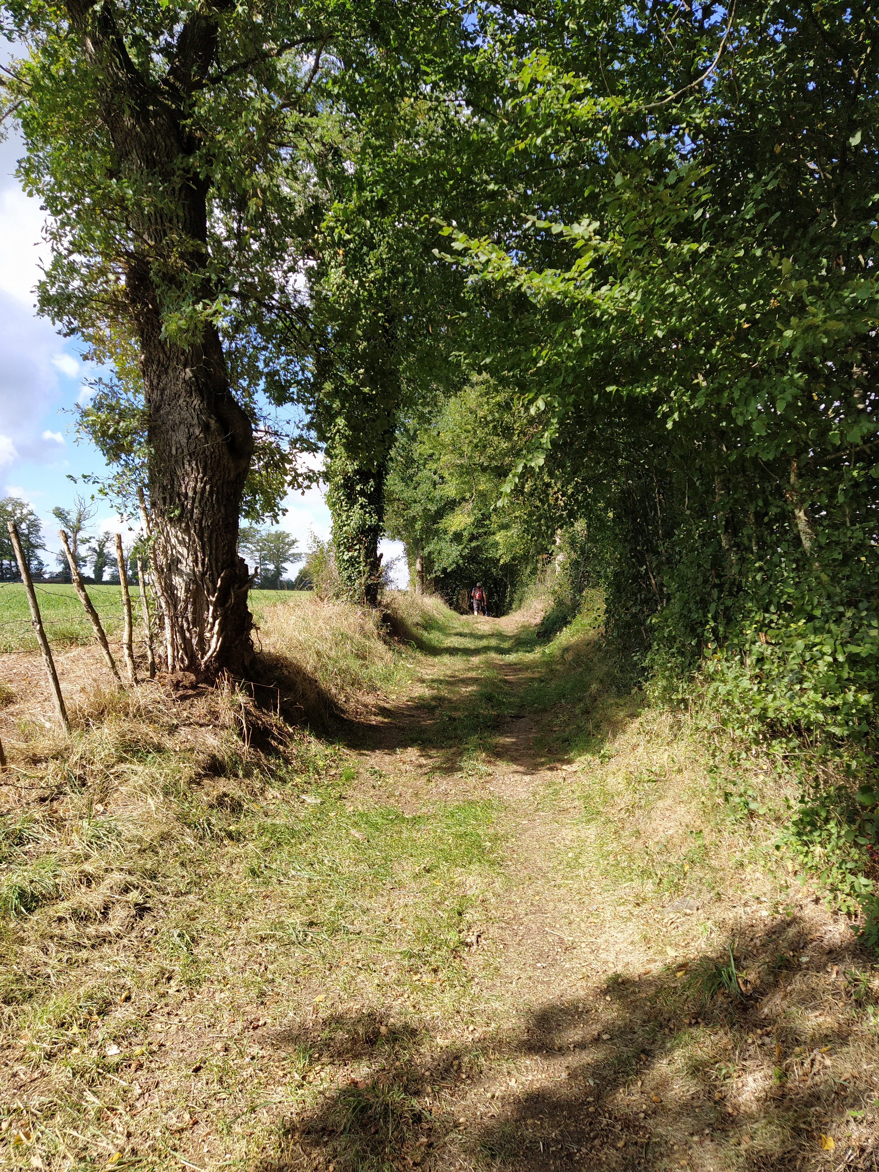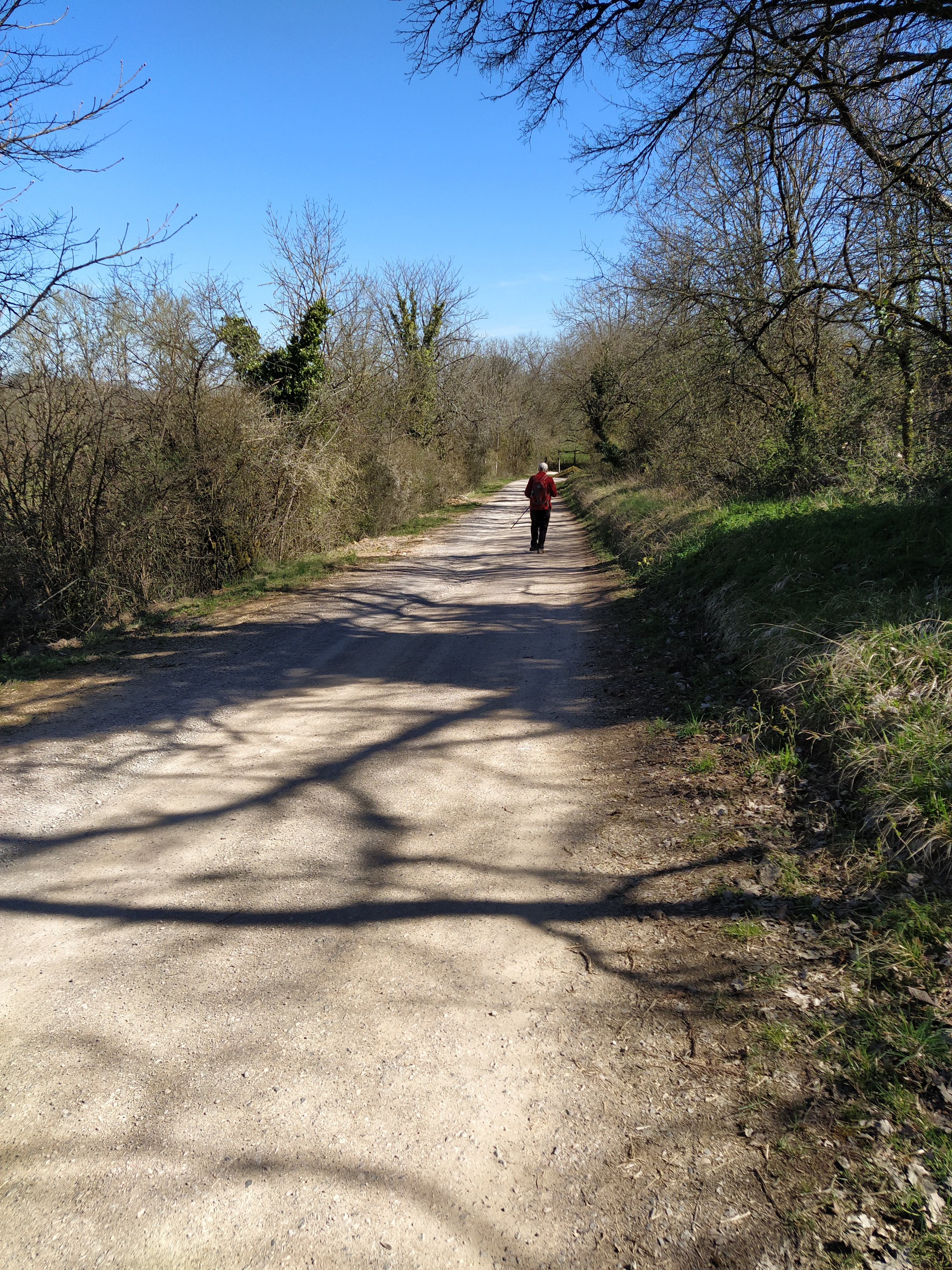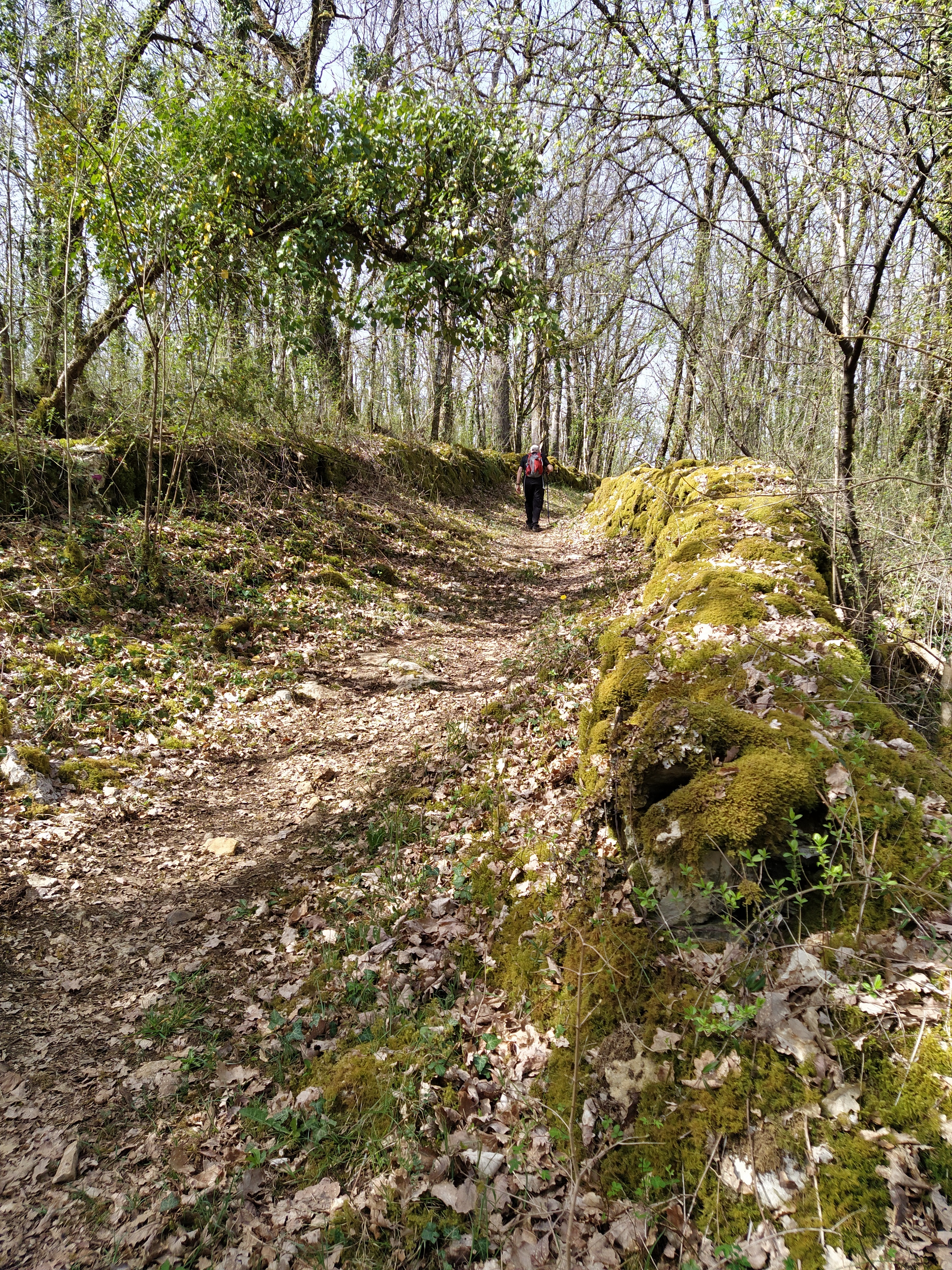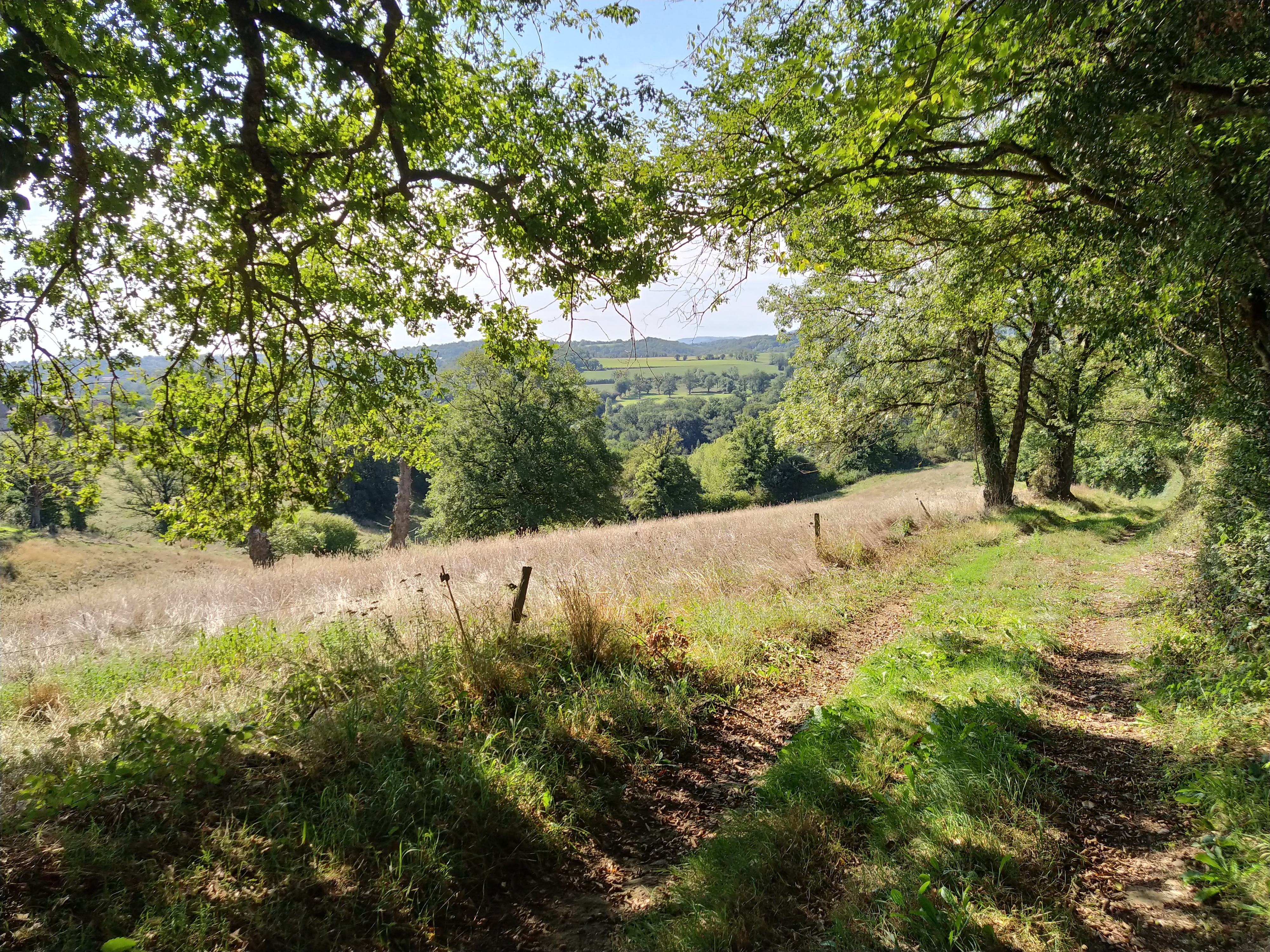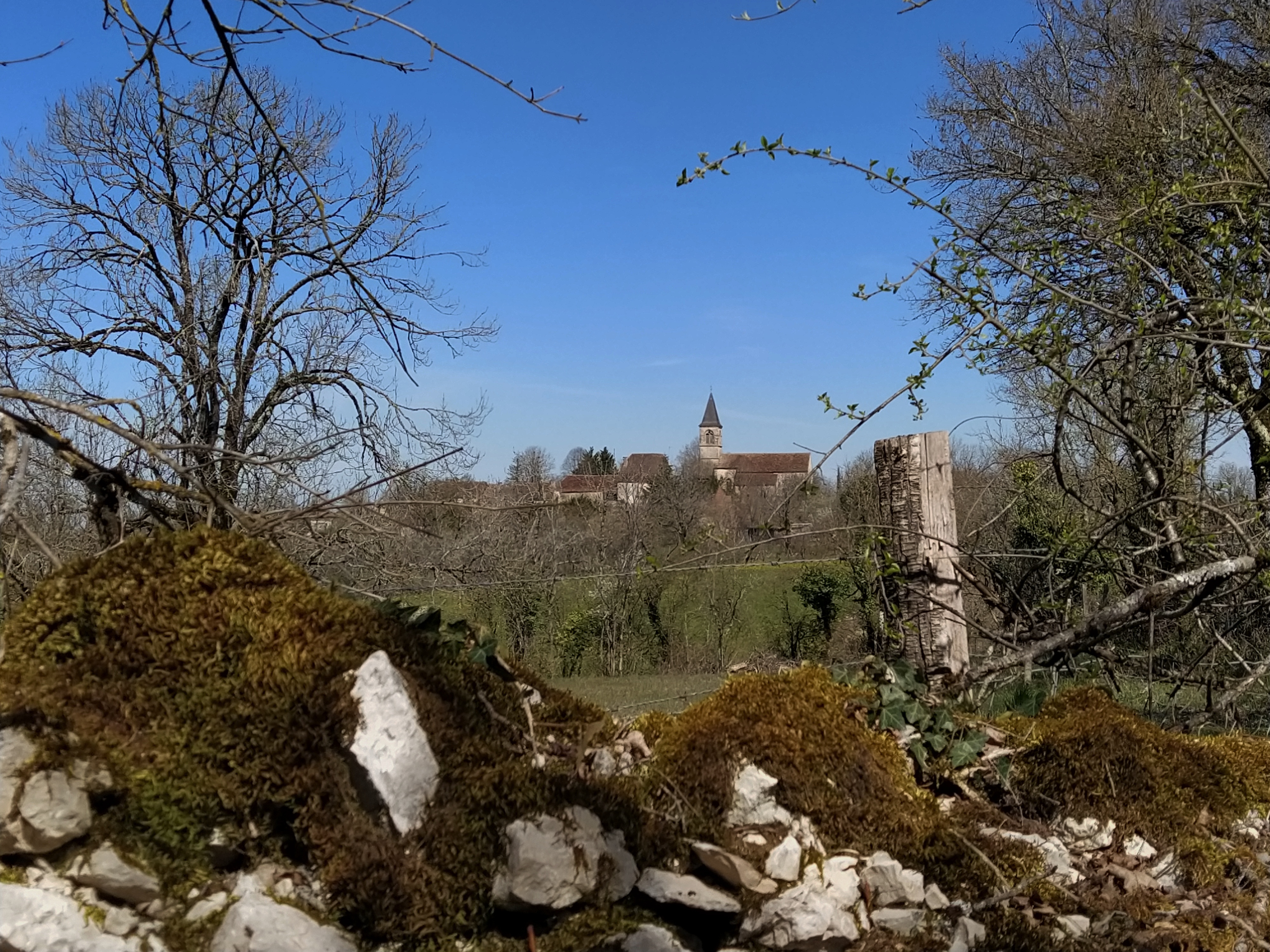Having climbed up the village High Street we were directed down a minor road that followed the river with stunning views back towards the village church. The summer heatwaves had stopped us walking very far as it was so unpleasant but this was perfect. Soon we were climbing a hollow way slippery underfoot with fallen leaves. My ‘fiche’ told me this was the most difficult part. It soon opened out onto a cart track between fields. Used to walking on our beautiful but dry limestone causse, to be surrounded by green arable land was heavenly. I watched as a buzzard skimmed the treeline in the distance. Later, a smaller raptor took off from our left calling crossly as it did so.