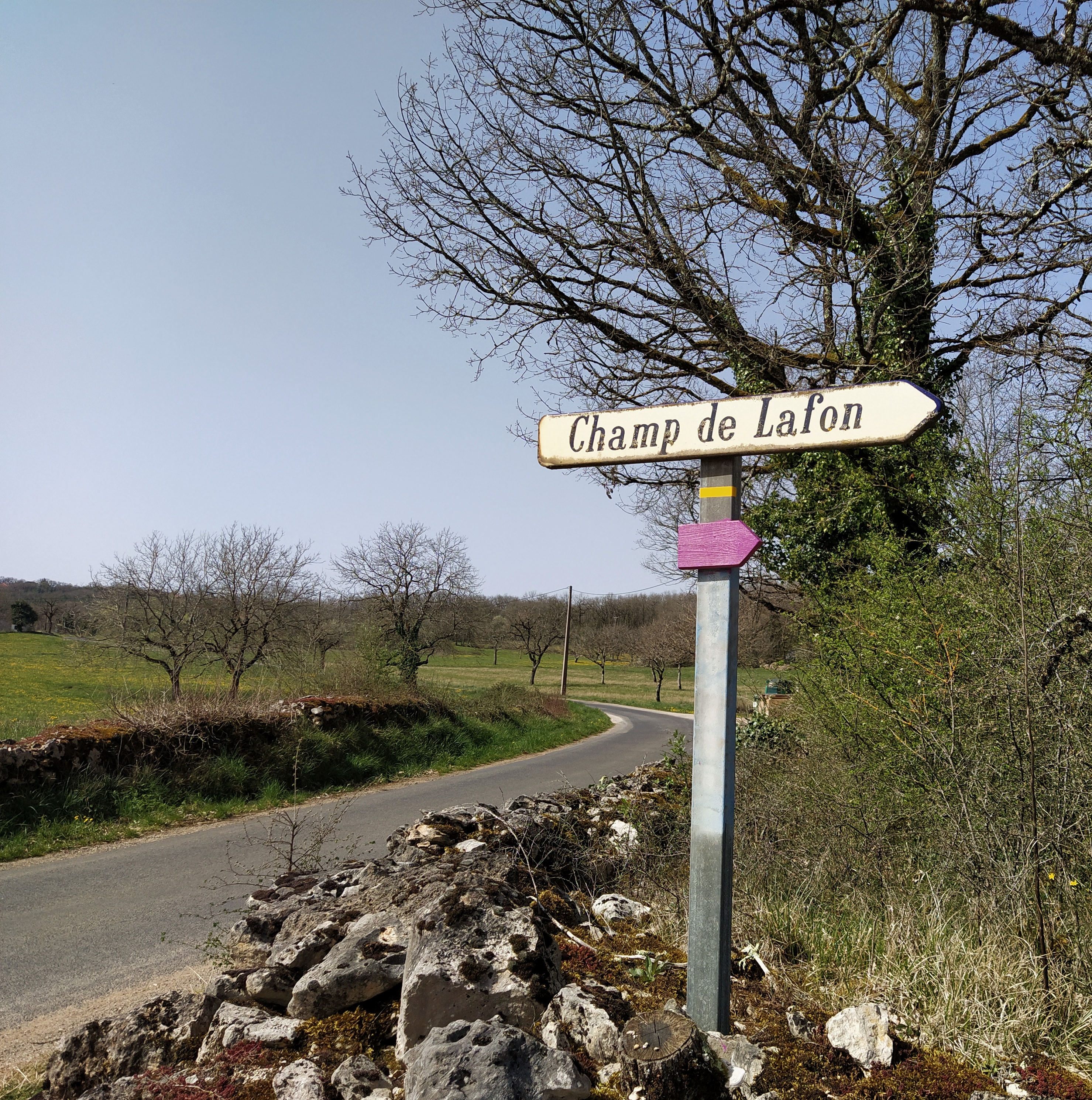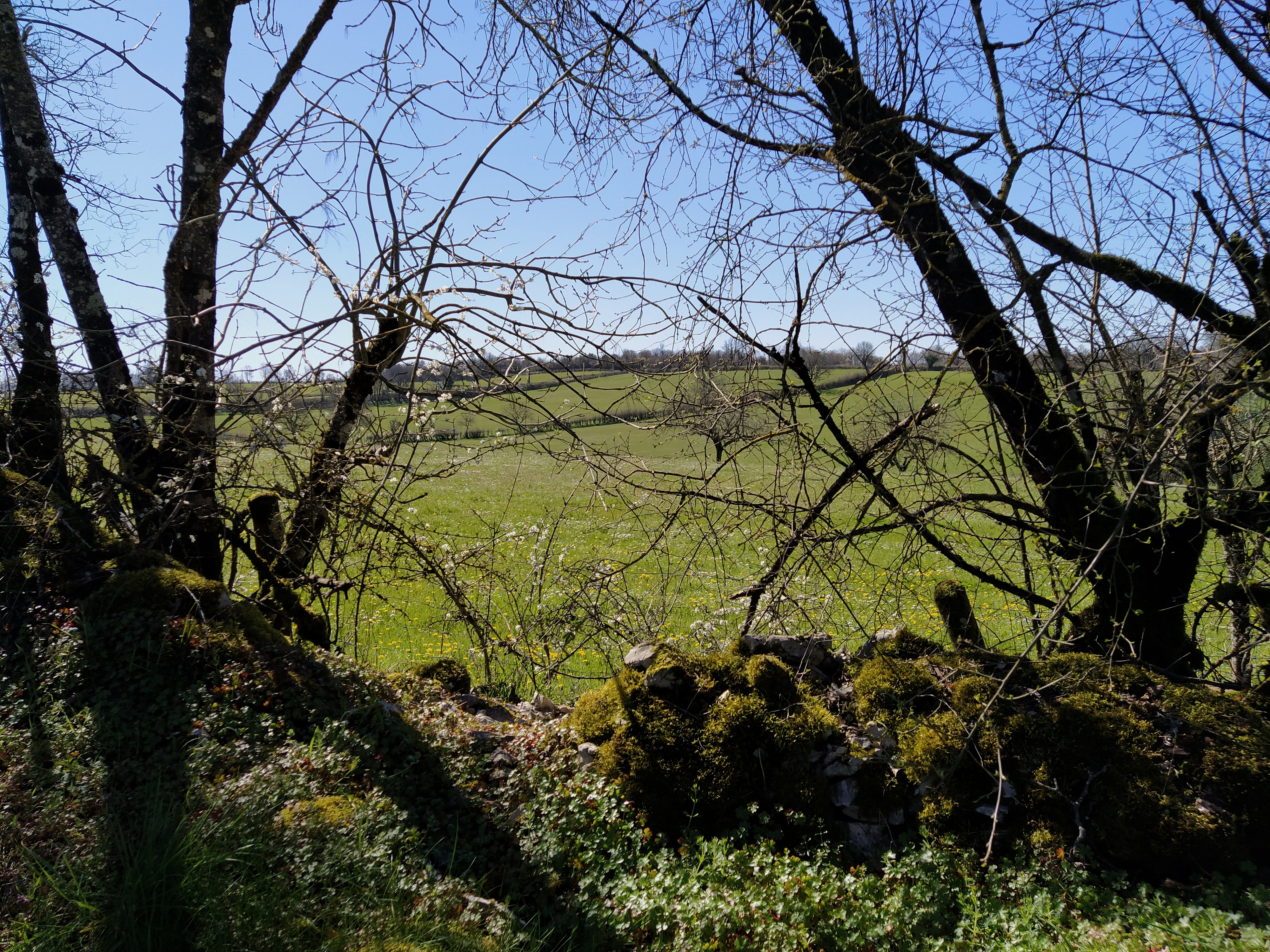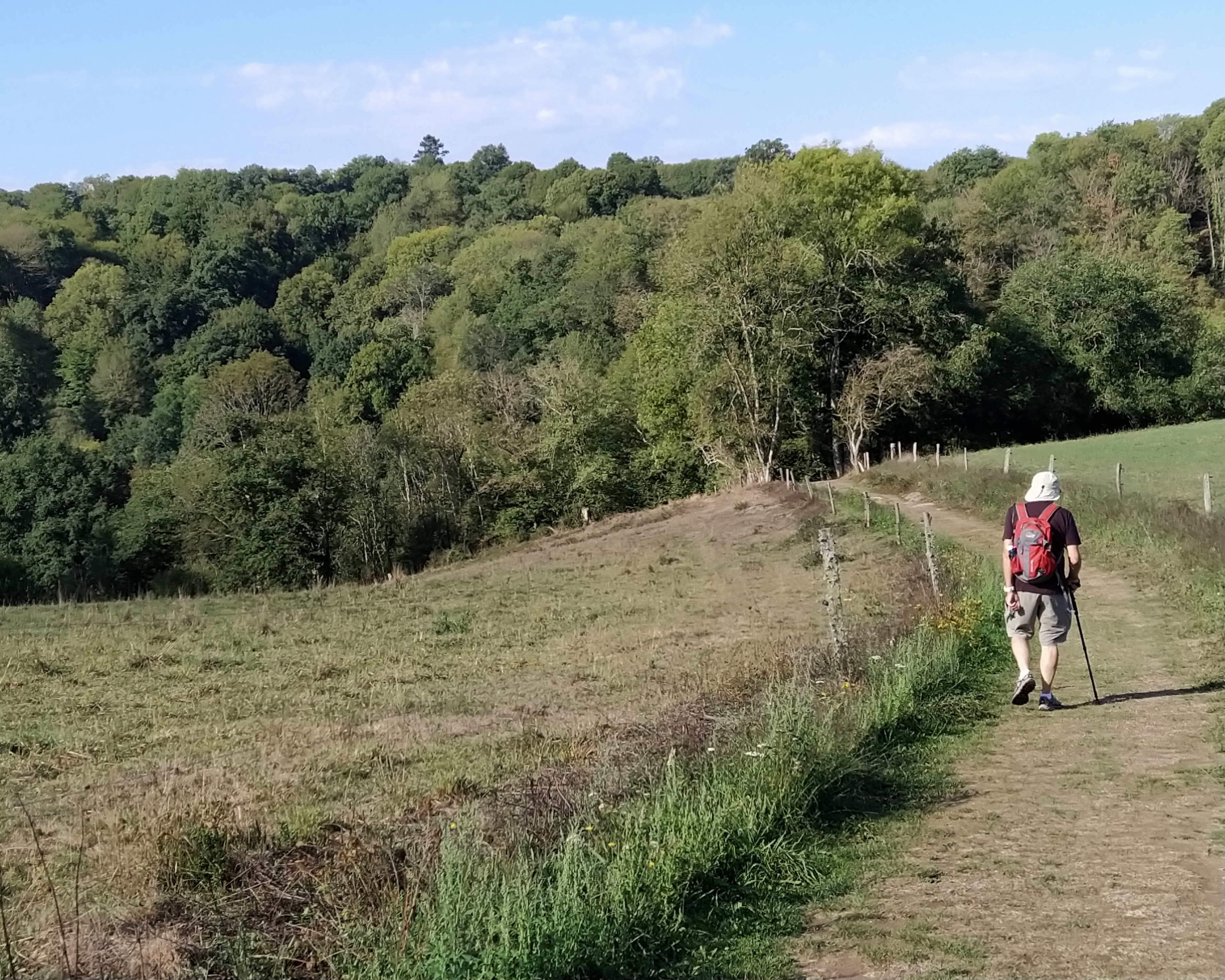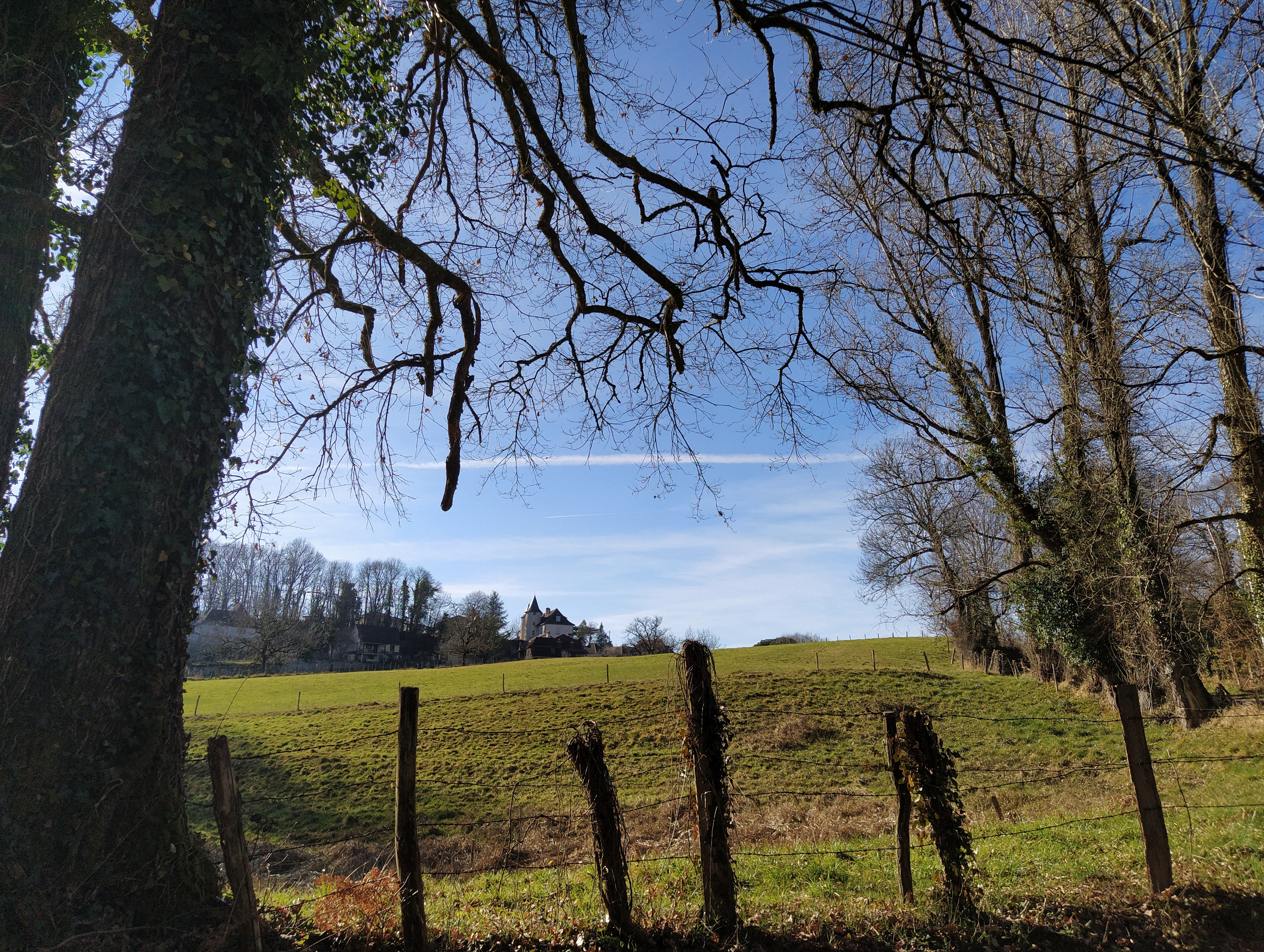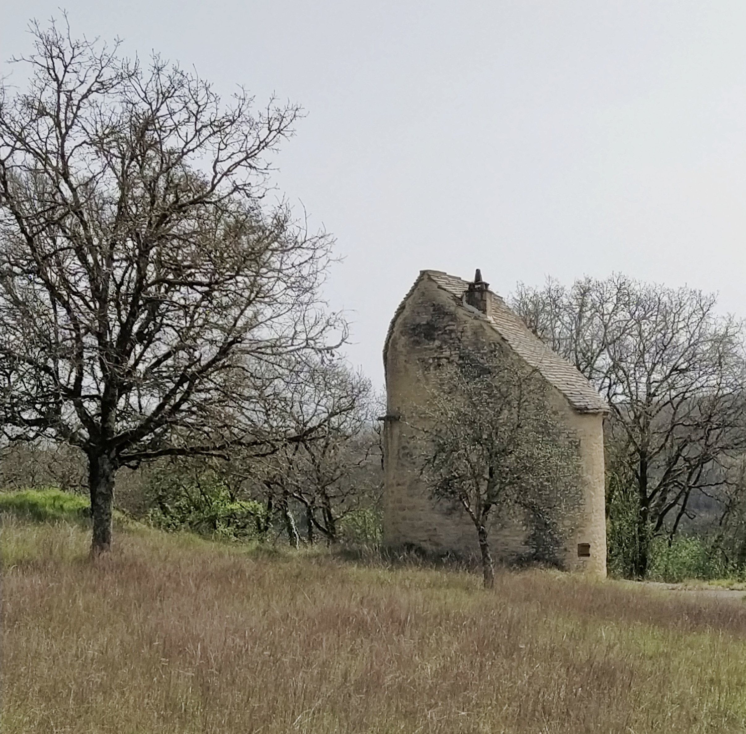 Having climbed up the village High Street we were directed down a minor road that followed the river with stunning views back towards the village church. The summer heatwaves had stopped us walking very far as it was so unpleasant but this was perfect. Soon we were climbing a hollow way slippery underfoot with fallen leaves. My ‘fiche’ told me this was the most difficult part. It soon opened out onto a cart track between fields. Used to walking on our beautiful but dry limestone causse, to be surrounded by green arable land was heavenly. I watched as a buzzard skimmed the treeline in the distance. Later, a smaller raptor took off from our left calling crossly as it did so.